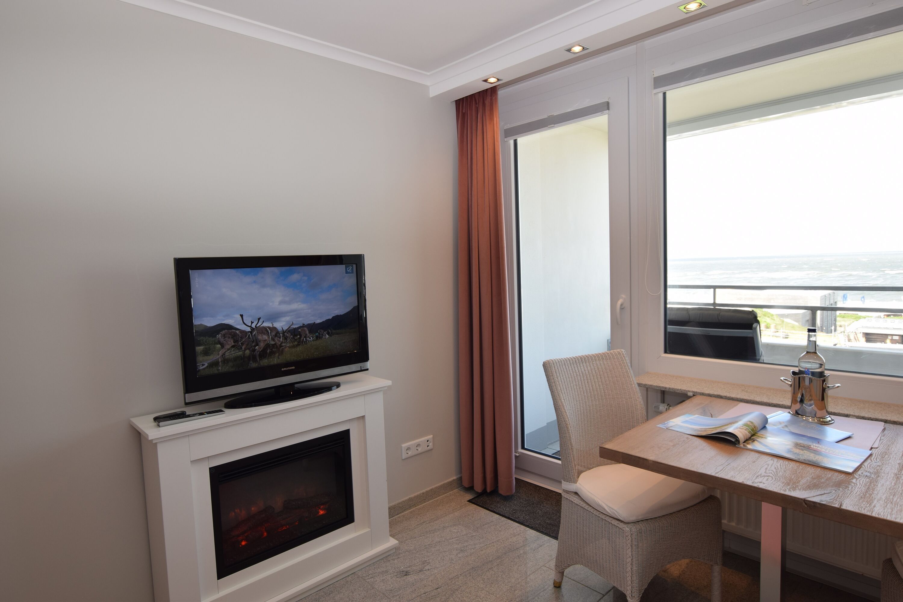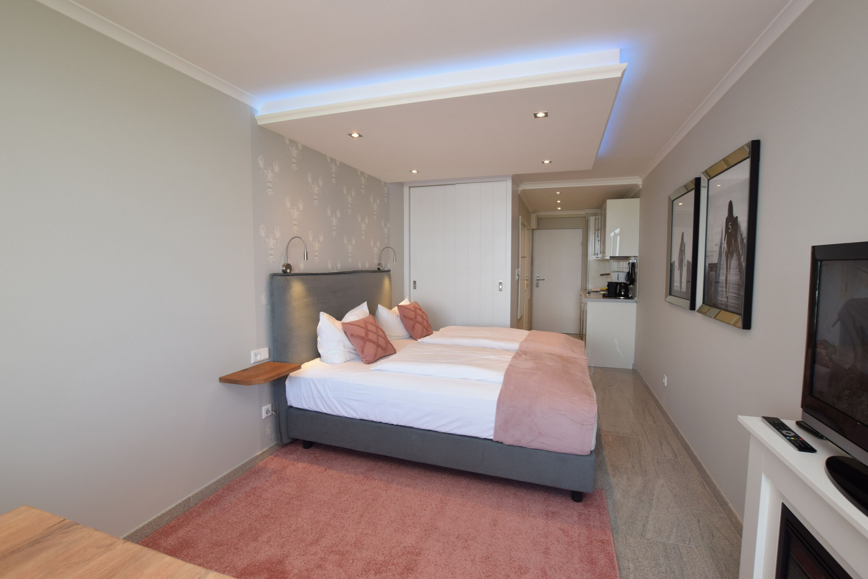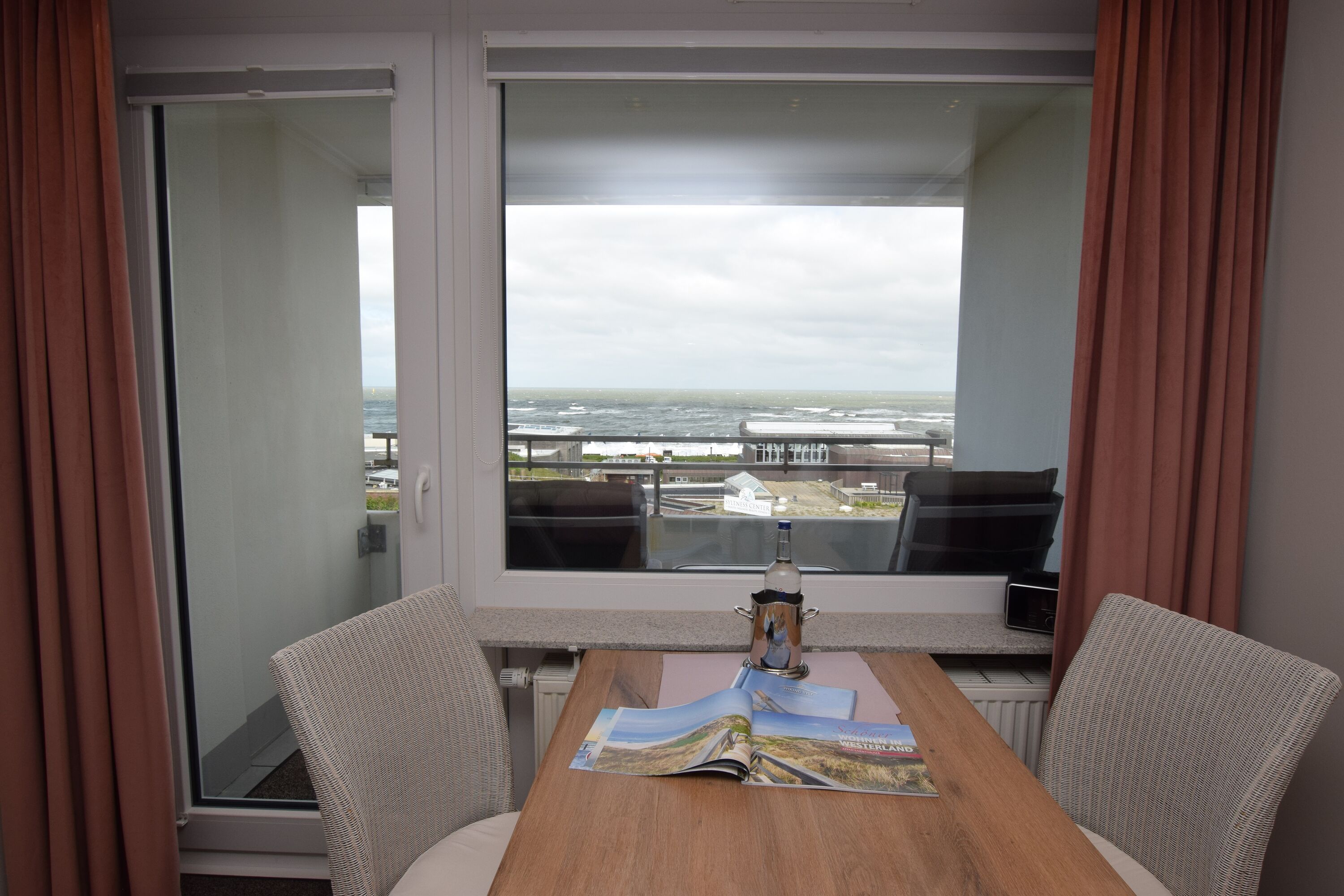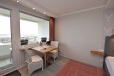 Schicke, komplett geflieste 1-Zimmer-Nichtraucher-Ferienwohnung (ca. 25 qm) in der 6. Etage (letzte Etage zu Fuß) zur Seeseite mit Westloggia und herrlichem Meerblick (Nachmittagssonne mit Balkonmöbeln und Auflagen) für max. 2 Personen.