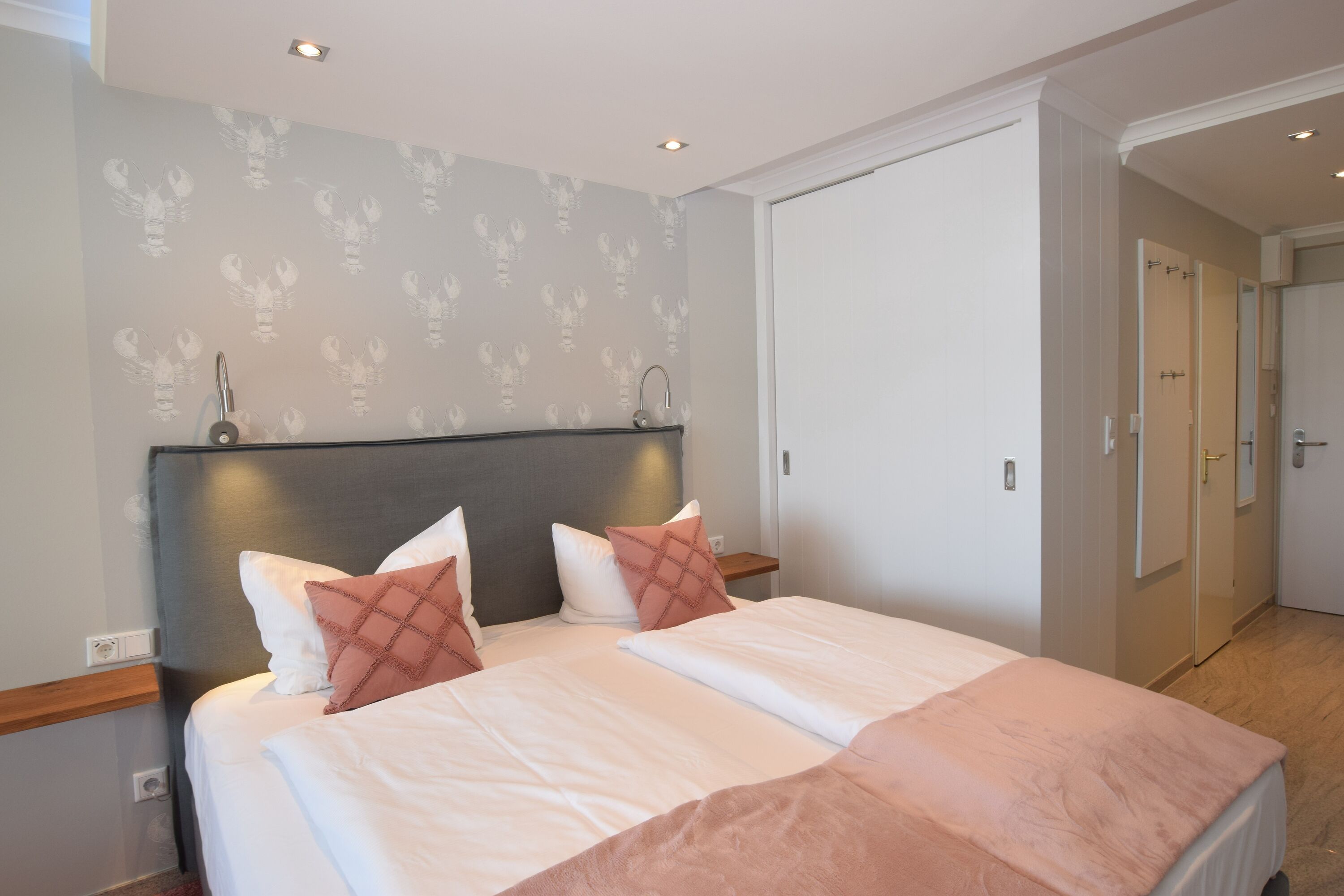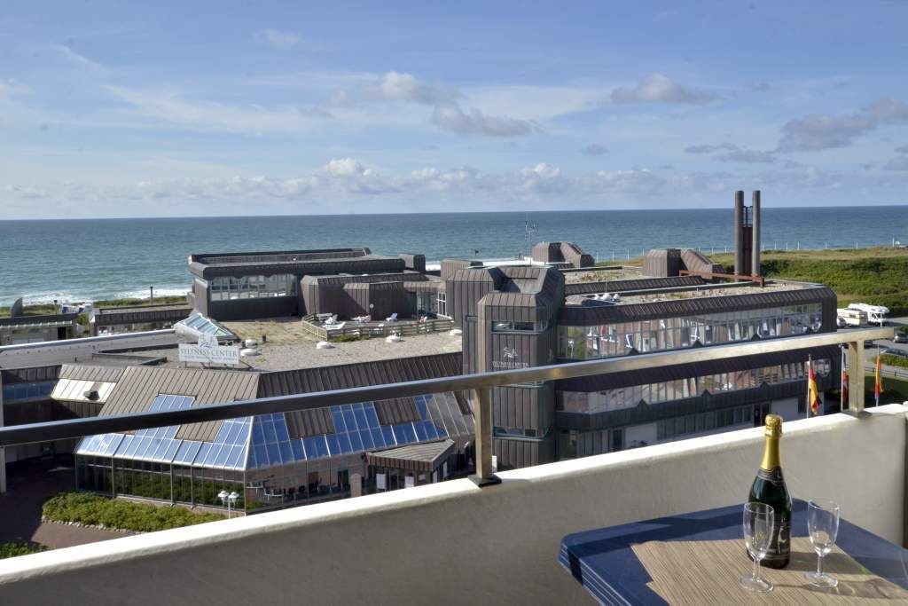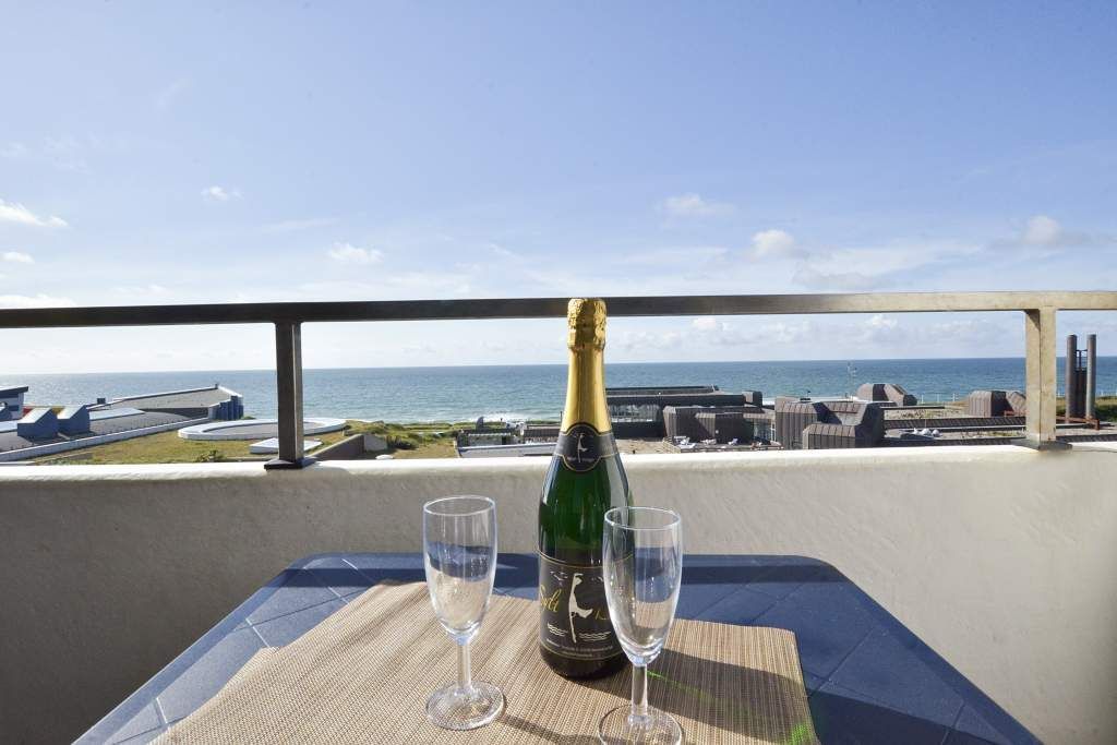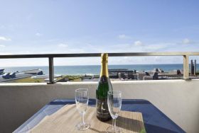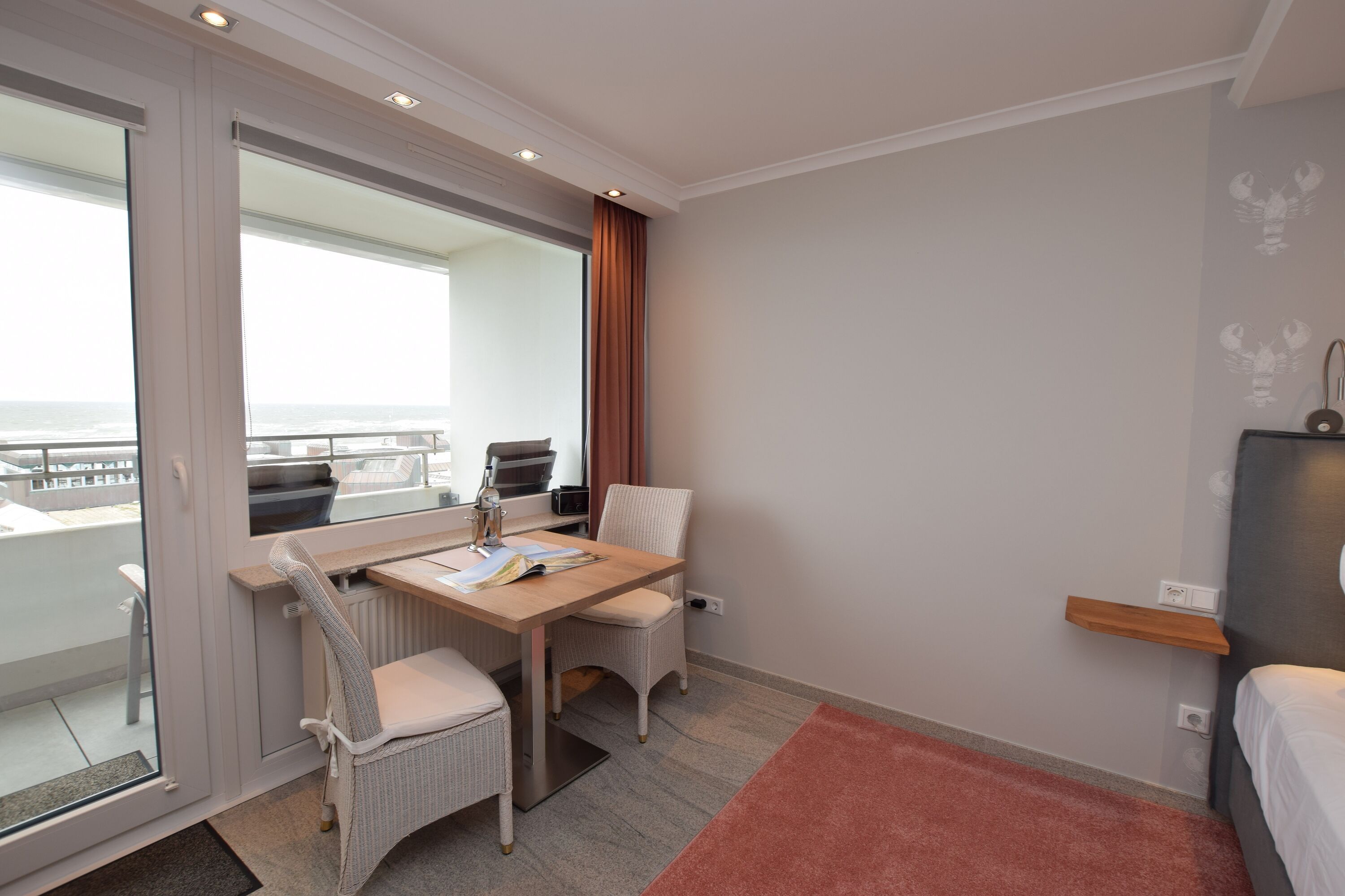 Schicke, komplett geflieste 1-Zimmer-Nichtraucher-Ferienwohnung (ca. 25 qm) in der 6. Etage (letzte Etage zu Fuß) zur Seeseite mit Westloggia und herrlichem Meerblick (Nachmittagssonne mit Balkonmöbeln und Auflagen) für max. 2 Personen.