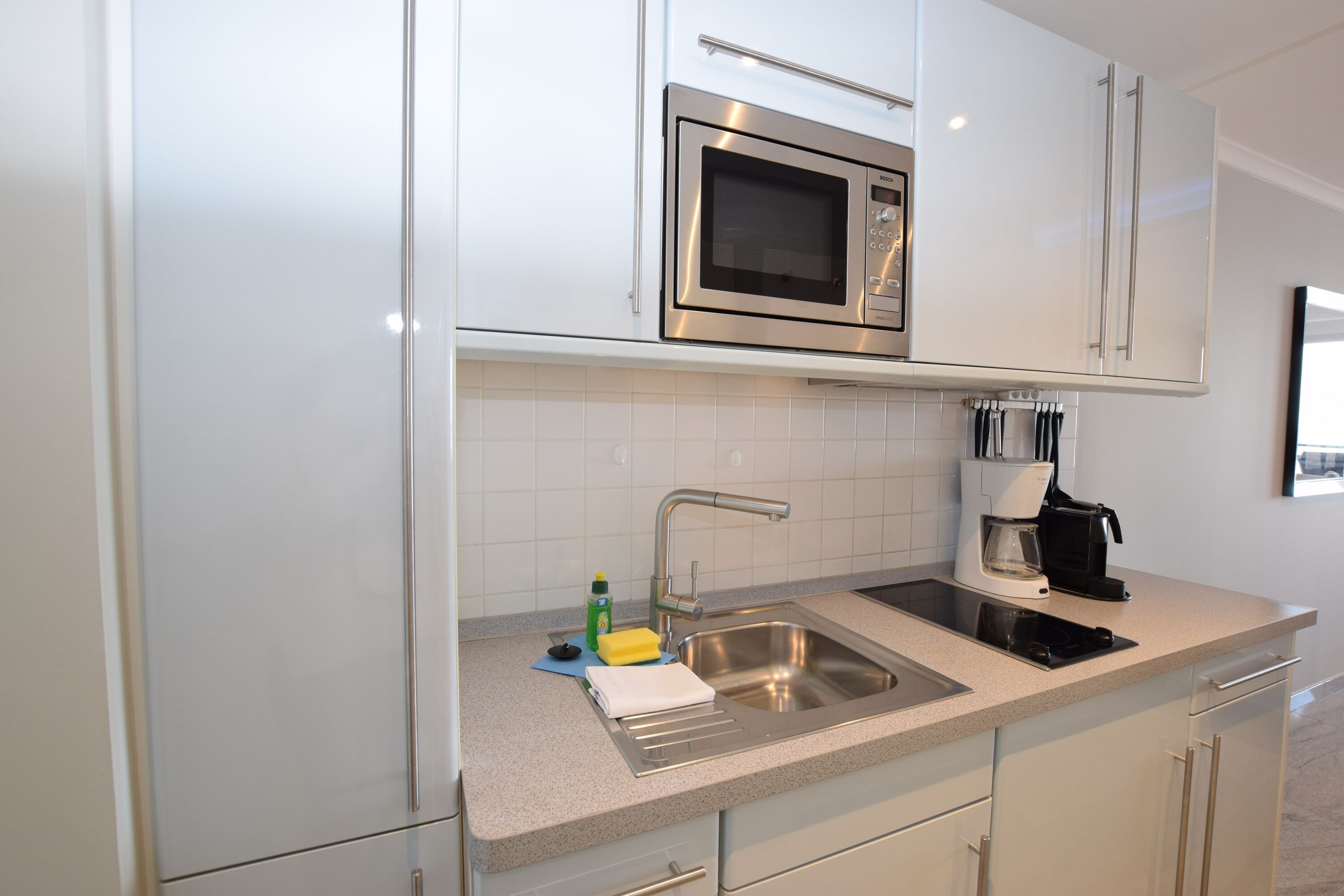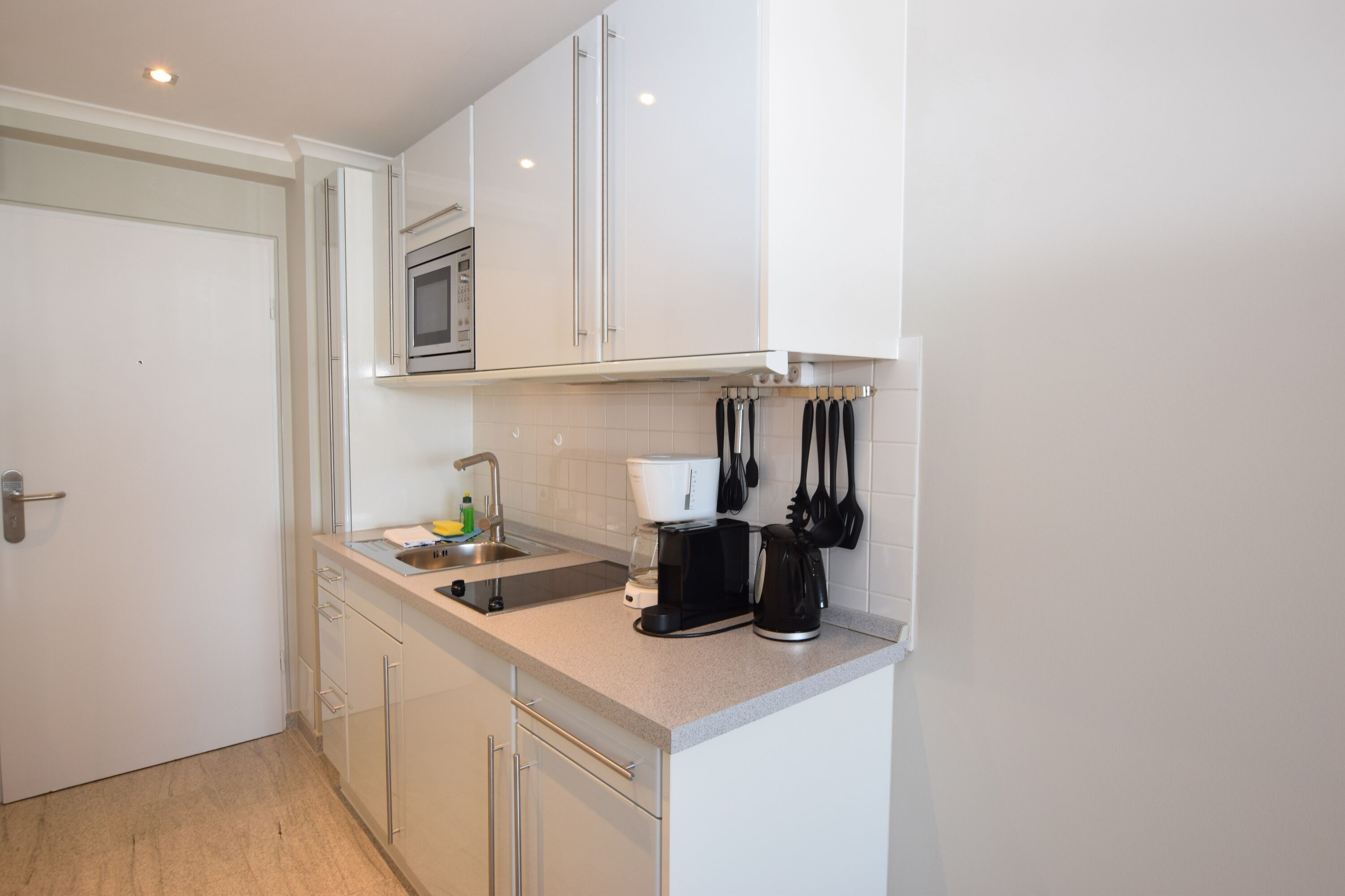 Die moderne Küchenzeile hat ein Cerankochfeld, eine Mikrowelle mit Grillfunktion und einen Kühlschrank mit 3*-Gefrierfach. Nespresso- und Filterkaffeemaschine, Wasserkocher und Toaster gehören zur Grundausstattung.