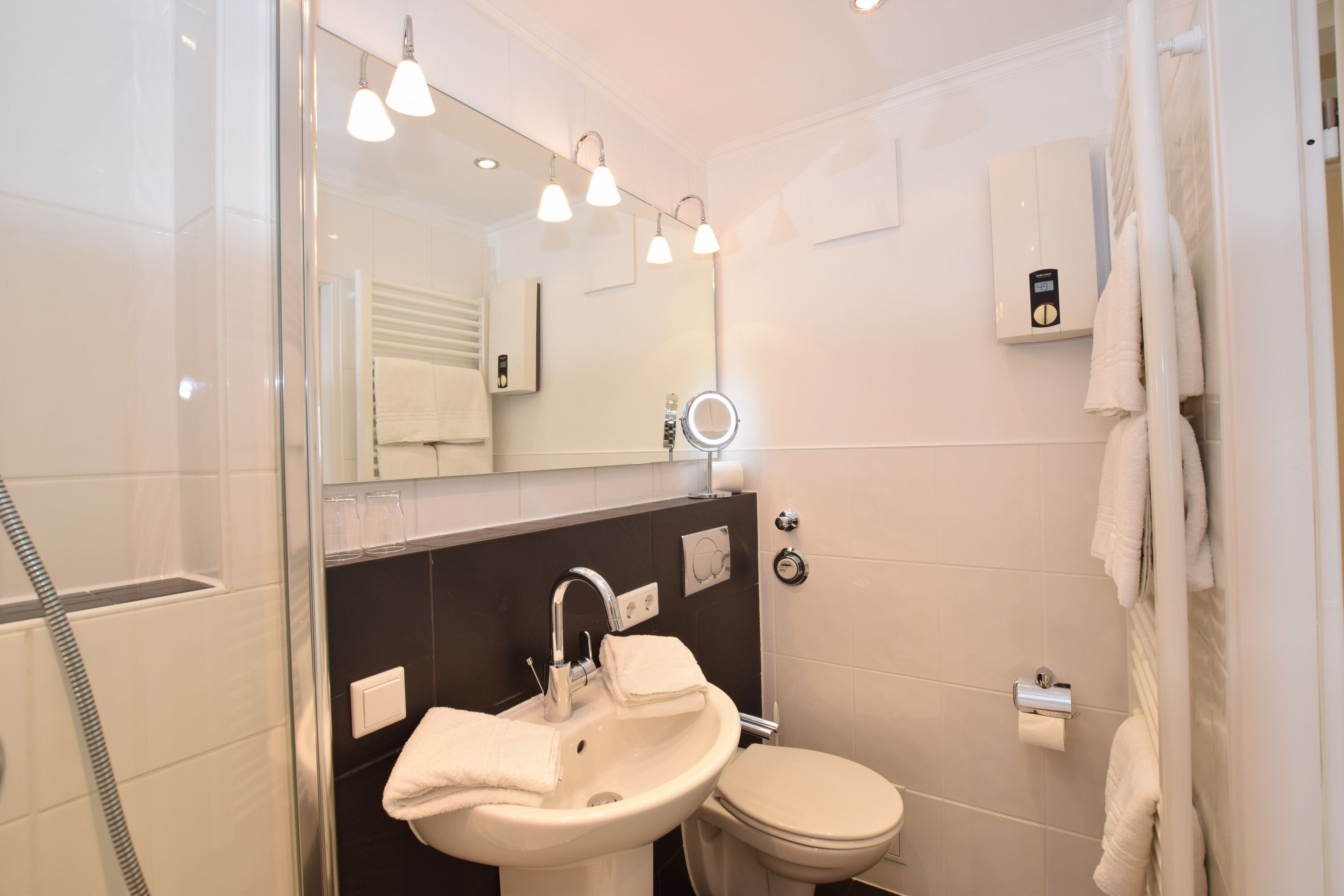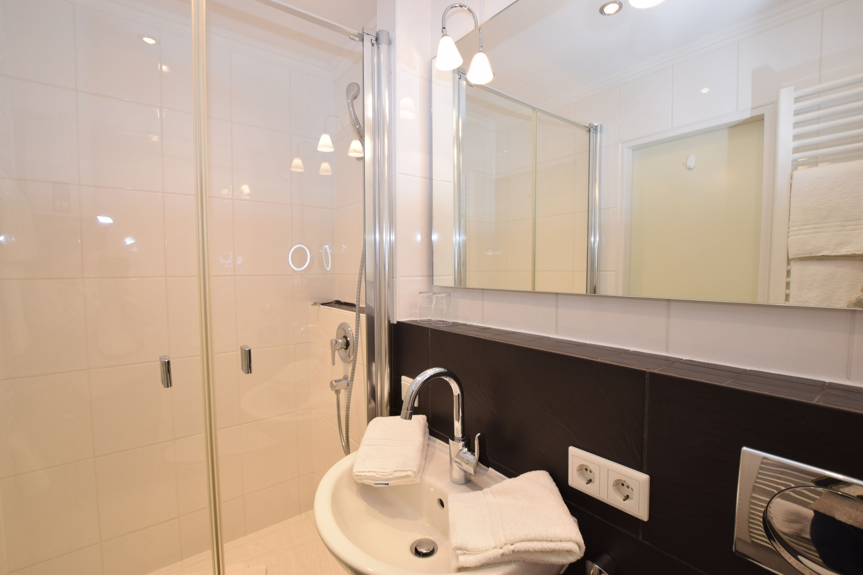 Im Bad befinden sich eine flache Dusche, ein WC, ein Waschtisch, ein Handtuchtrockner und ein Fön.
