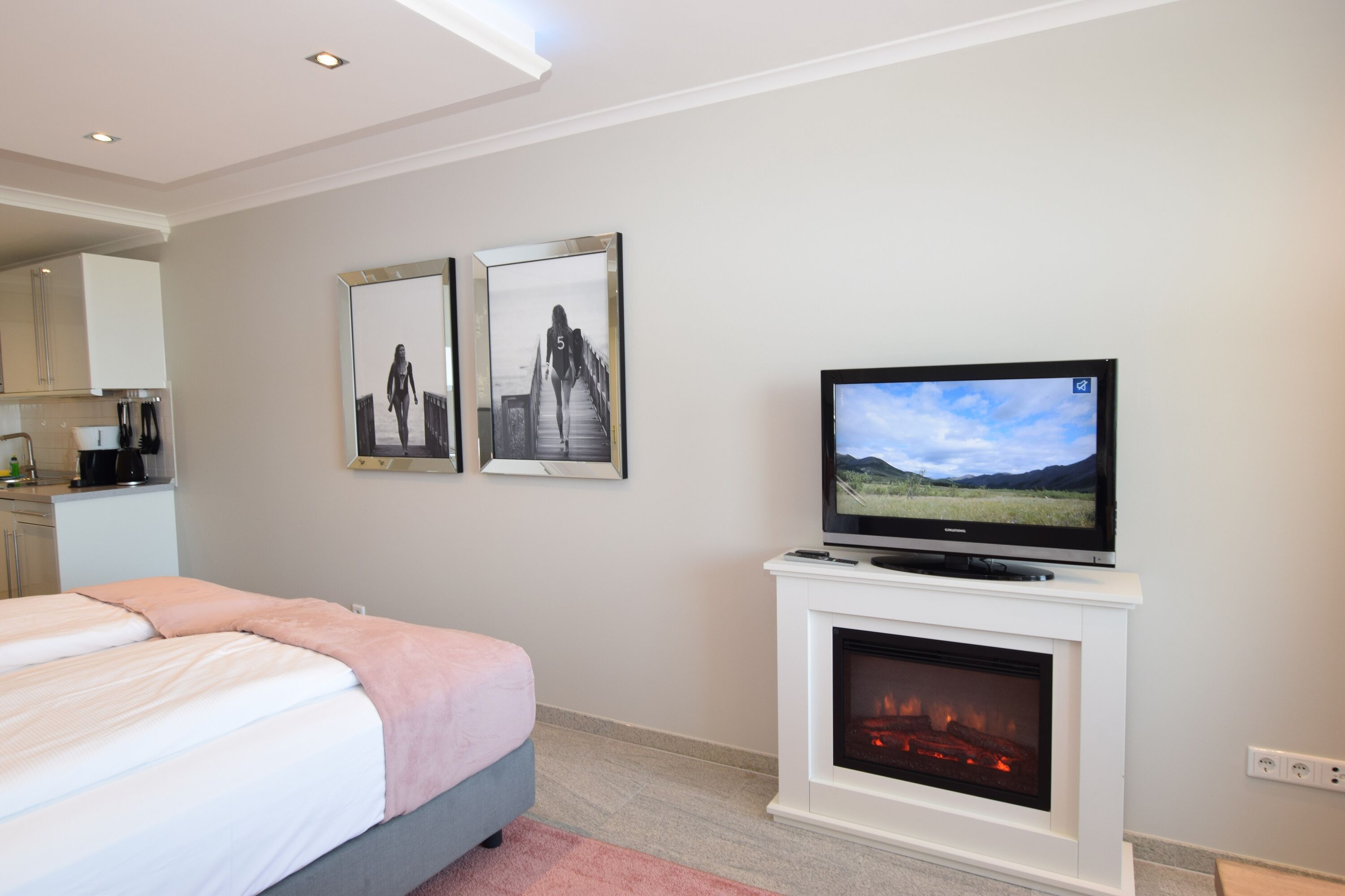 Der gemütliche Wohn-/Schlafraum mit Marmorboden besteht aus einem Essplatz, einem guten feststehenden Doppelbett, Flachbild-TV, Digitalradio.