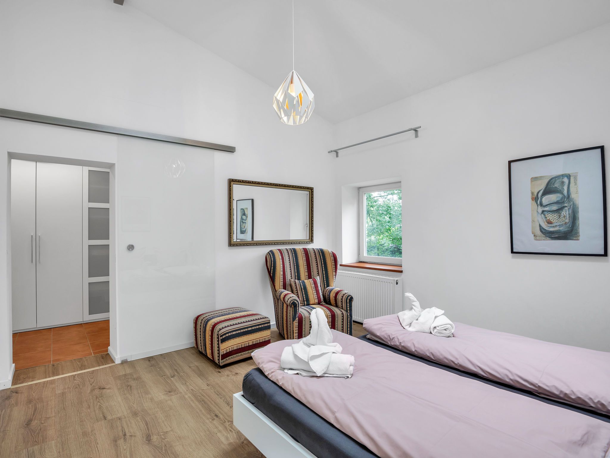 Elbdomizil, 5-Zimmer-Haus 180 m2 auf 2 Stockwerken. Luxuriös und stilvoll eingerichtet: offenes grosses Wohn-/Esszimmer mit offenem Kamin und Sat-TV (Flachbildschirm). Ausgang zum Garten, zur Terrasse. 1 Zimmer mit 1 Diwanbett und 1 Doppelbett. 1 Zimmer mit 1 Doppelbett. Grosse, offene Küche (5 Glaskeramikplatten, Toaster, Wasserkocher, Mikrowelle, elektrische Kaffeemaschine, Kochinsel). Dusche/WC. Heizung. Obergeschoss: 1 Zimmer mit 1 Doppeldiwanbett und 1 Doppelbett. 1 Zimmer mit 1 Doppelbett. Bad/Dusche/WC, Sauna. Grosser Garten. Terrassenmöbel, Gartengrill. Auf den Garten. Zur Verfügung: Internet (DSL/LAN, gratis). Bitte beachten: Nichtraucher-Haus. Maximal 2 Haustiere/Hunde erlaubt. Rauchmelder. Flexibilität bei der Bettenaufteilung: Es stehen mehr Schlafmöglichkeiten zur Verfügung als die maximal zugelassene Personenzahl, diese darf dennoch nicht überschritten werden.