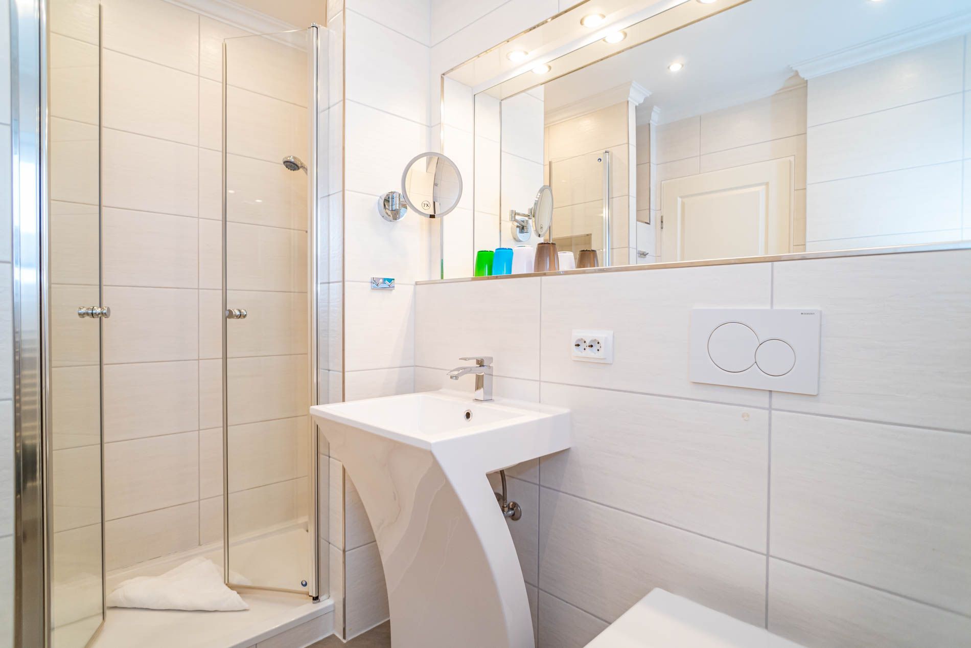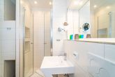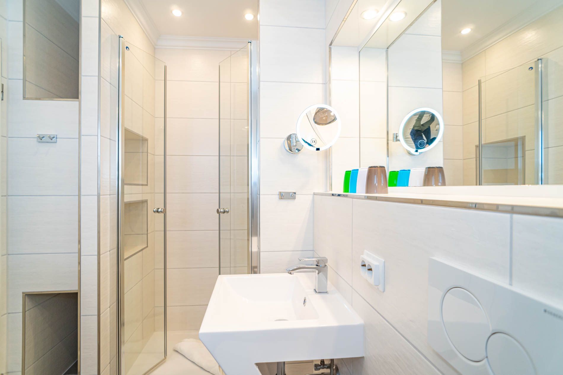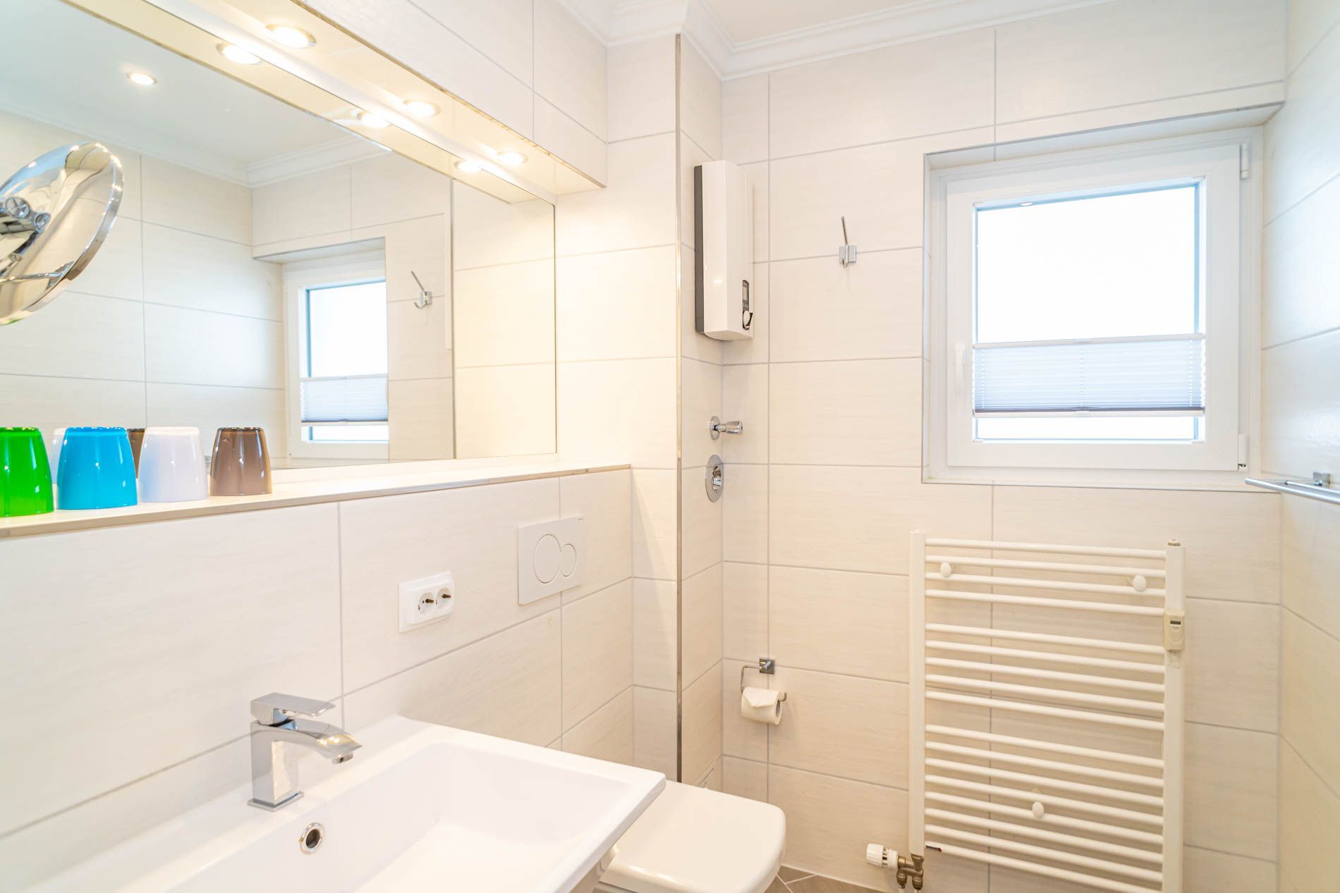 Im modernen Badezimmer mit Fenster befinden sich eine Dusche mit extraflachem Einstieg, Waschtisch, Handtuchtrockner, Fön und WC.