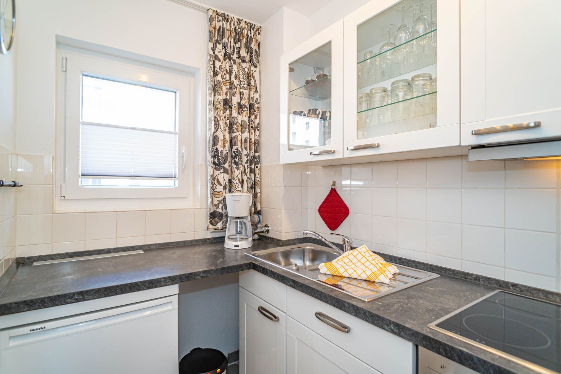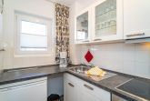 Moderne Einbauküche mit Geschirrspüler, Backofen, Ceranfeld und Kühlschrank mit 3-Sterne-Gefrierfach.