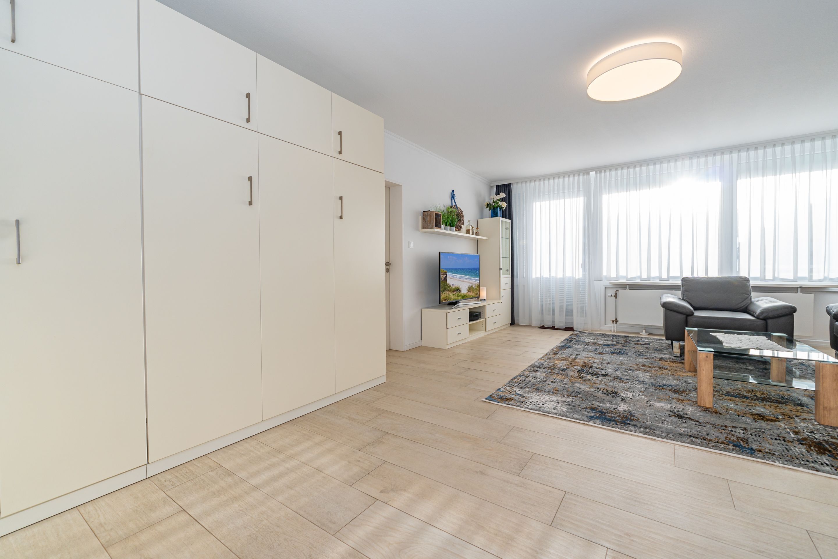 Vom Vorflur mit Garderobe gelangt man in das Wohnzimmer (mit Austritt zum Balkon), in das Schlafzimmer und in das neue Duschbad/WC.