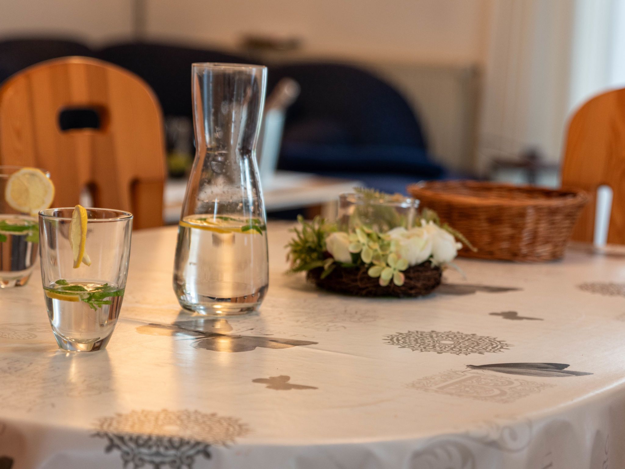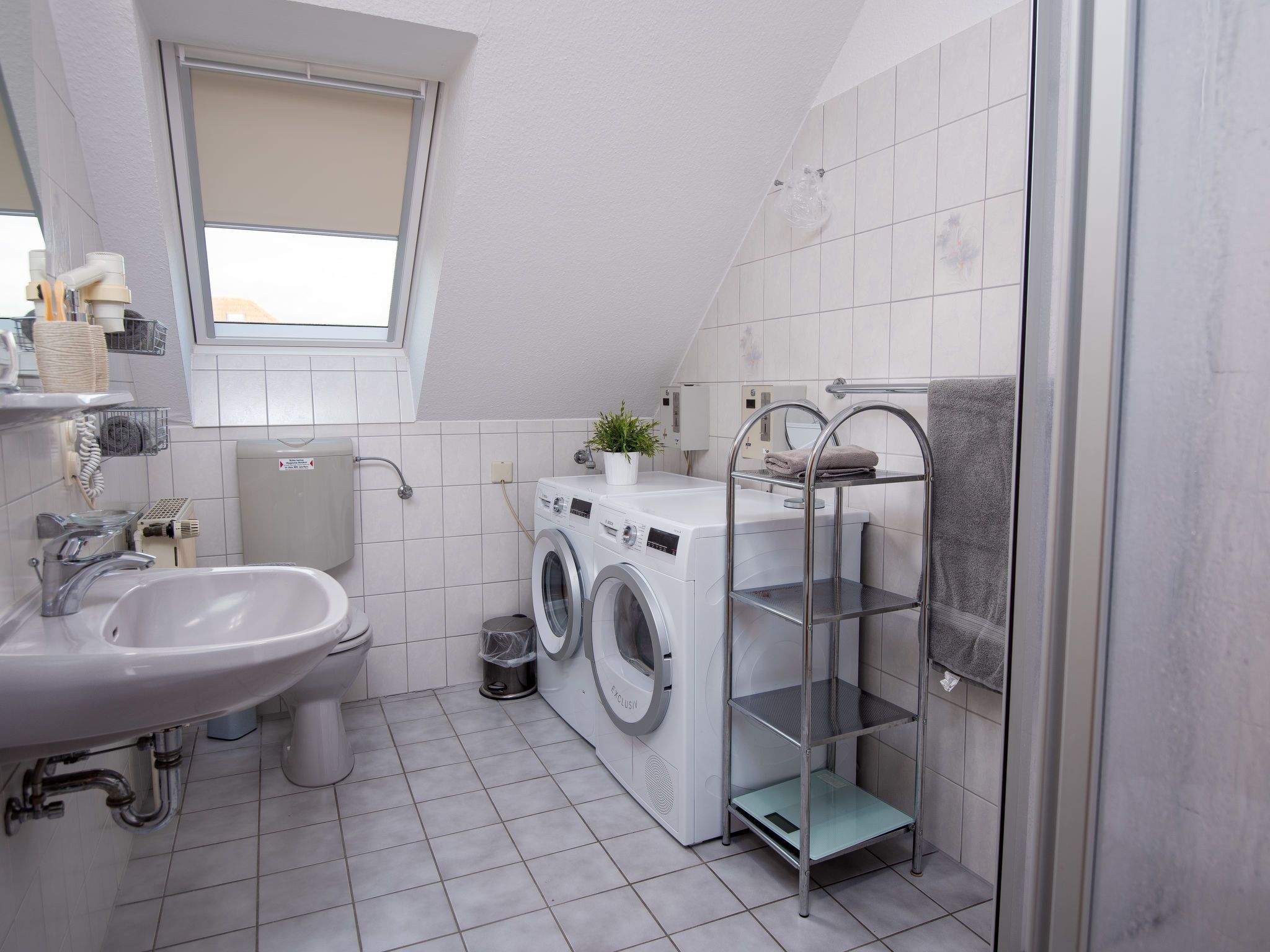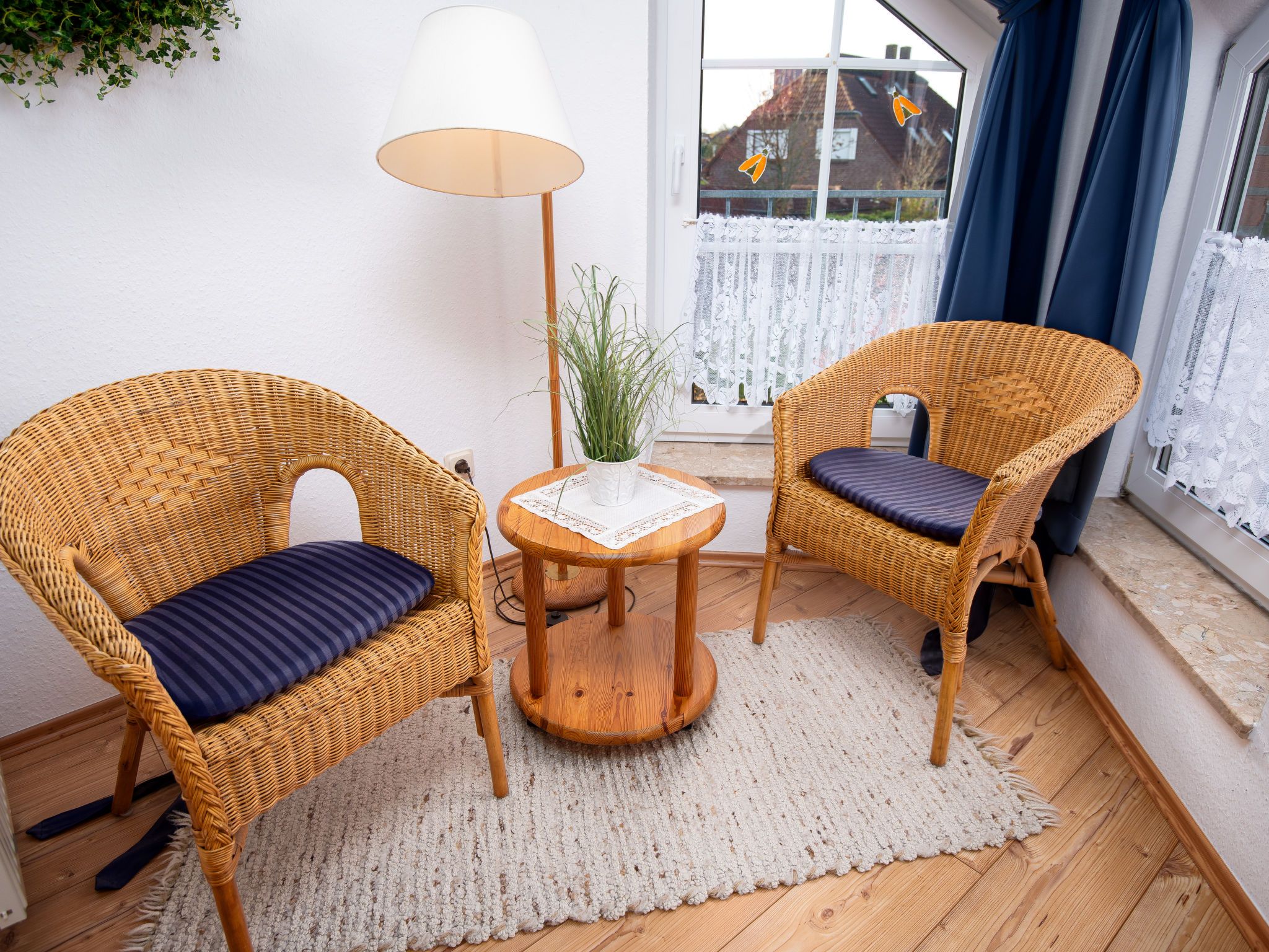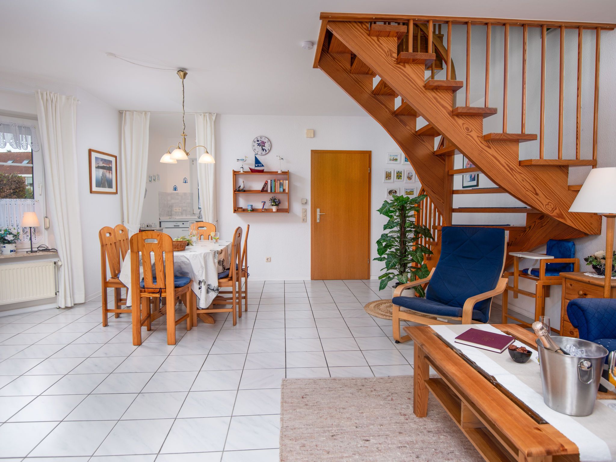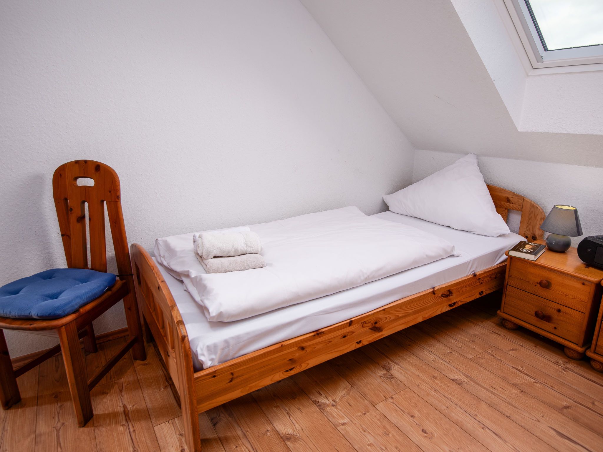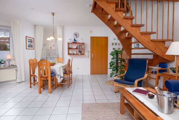 3-Zimmer-Doppelhaushälfte 74 m2 auf 2 Stockwerken, im Erdgeschoss. Schön und gemütlich eingerichtet: Wohn-/Esszimmer mit Sat-TV (Flachbildschirm), Radio. Ausgang zur Terrasse. Offene Küche (4 Kochplatten, Backofen, Geschirrspüler, Toaster, Wasserkocher, Mikrowelle, elektrische Kaffeemaschine). Sep. WC. Obergeschoss: 1 abgeschrägtes Zimmer mit 1 Doppelbett (2 x 90 cm, Länge 200 cm). 1 abgeschrägtes Zimmer mit 2 Betten (90 cm, Länge 200 cm). Dusche/WC. Terrassenmöbel. Zur Verfügung: Waschmaschine, Wäschetrockner, Kinderhochstuhl. Internet (Wireless LAN, gratis). Bitte beachten: Nichtraucher-Haus. Rauchmelder.