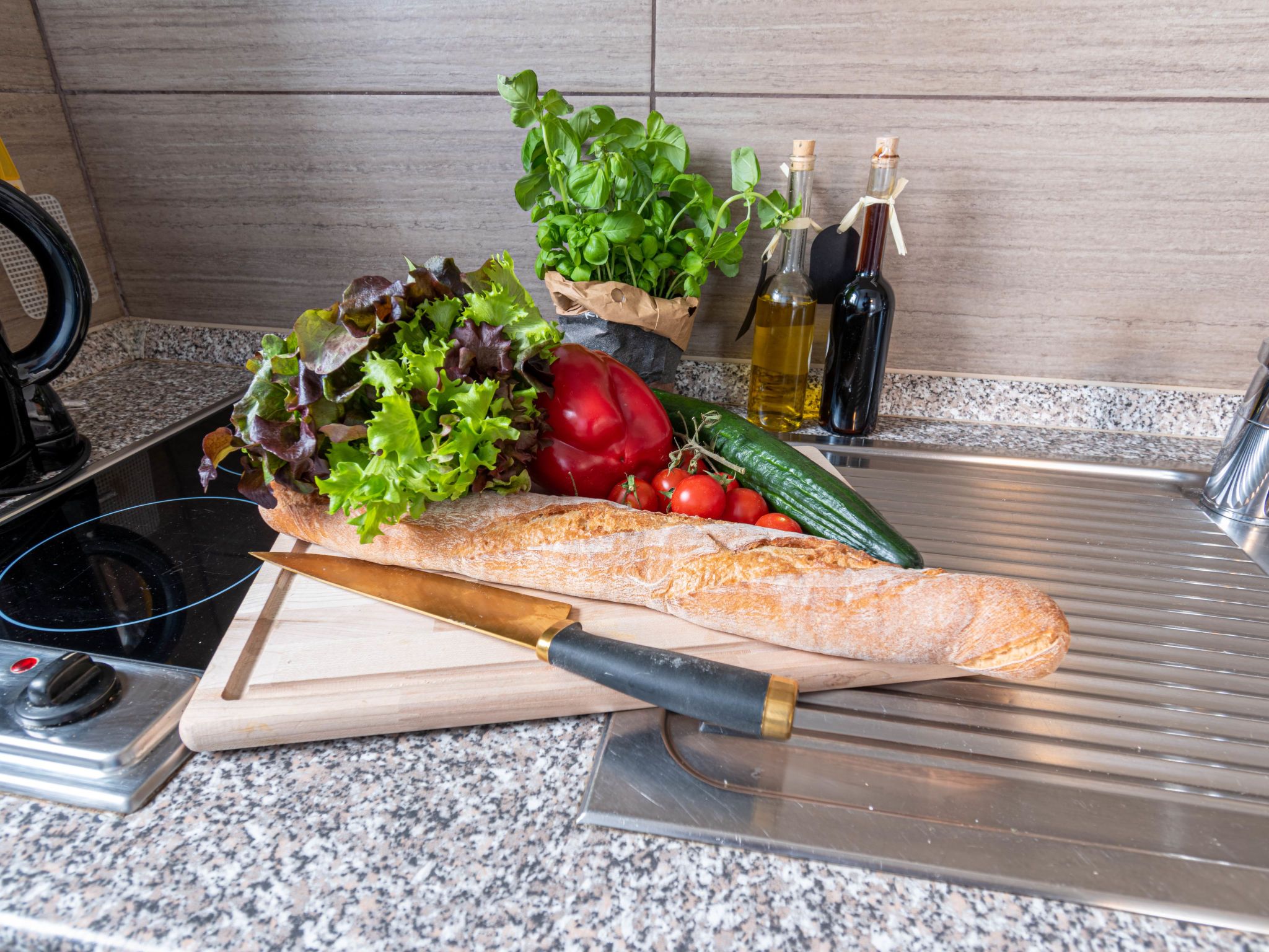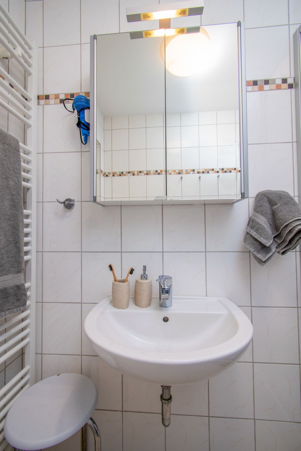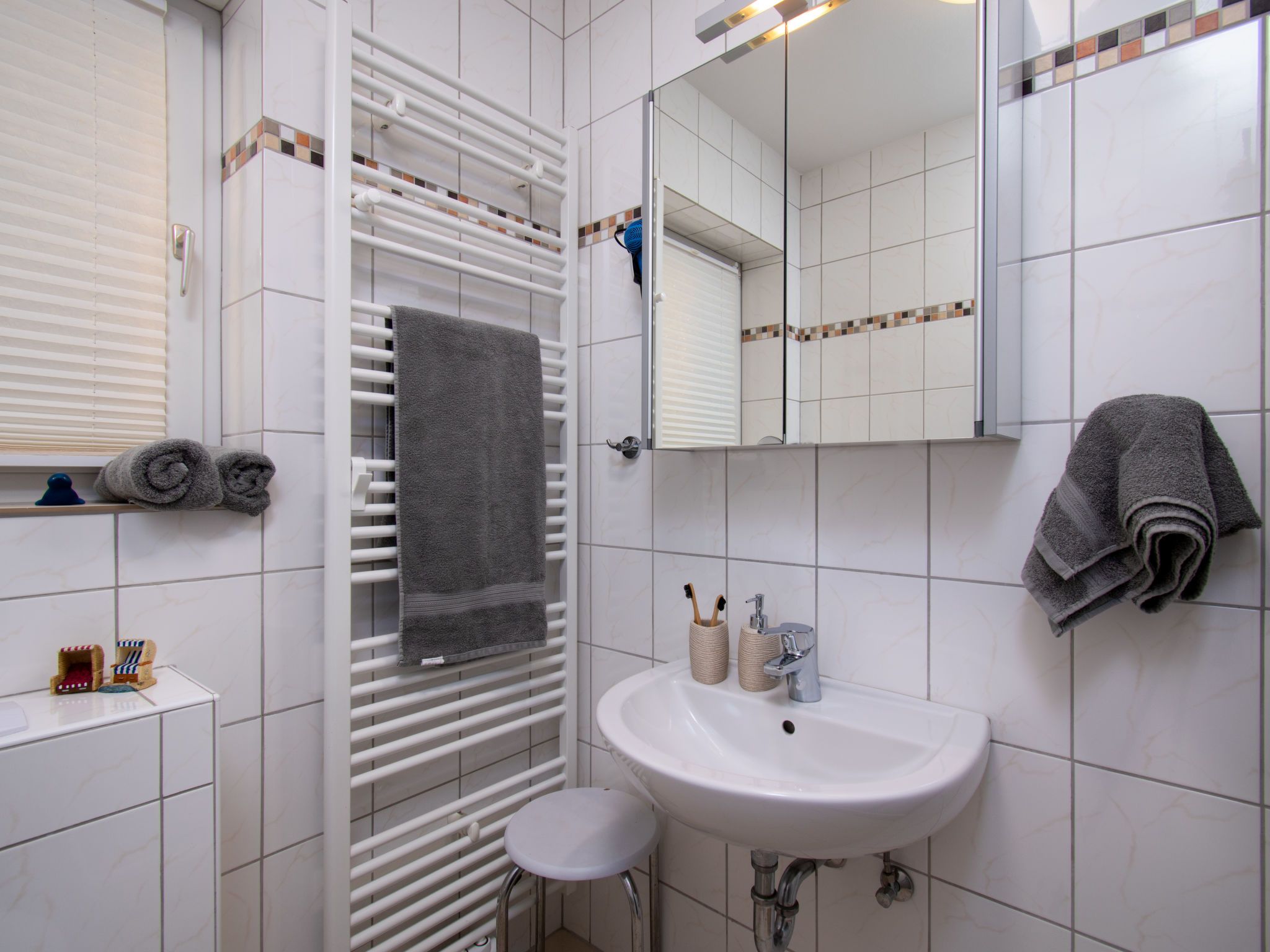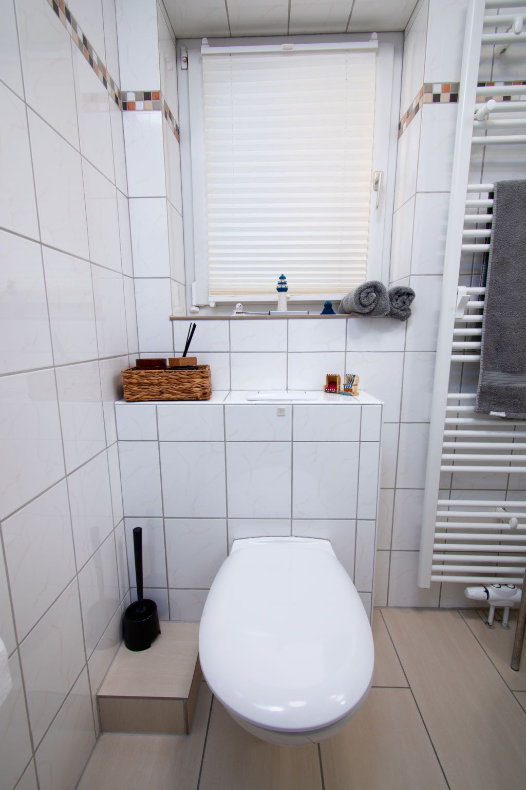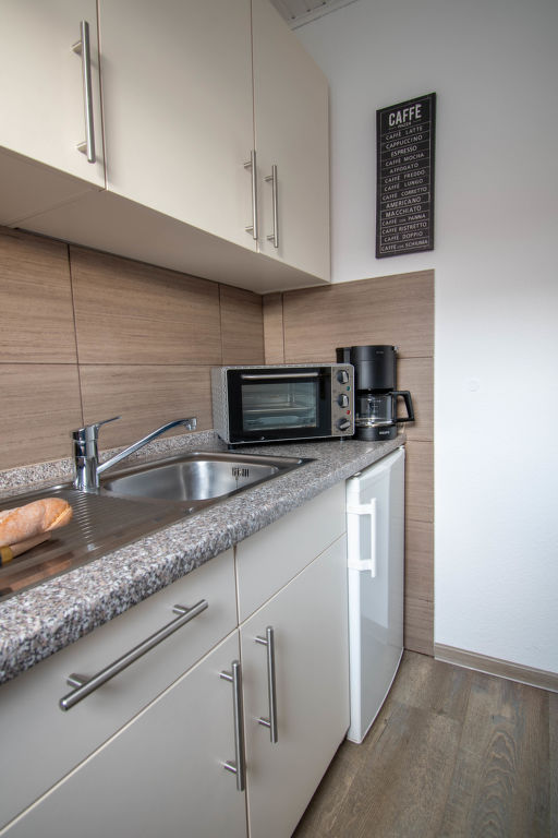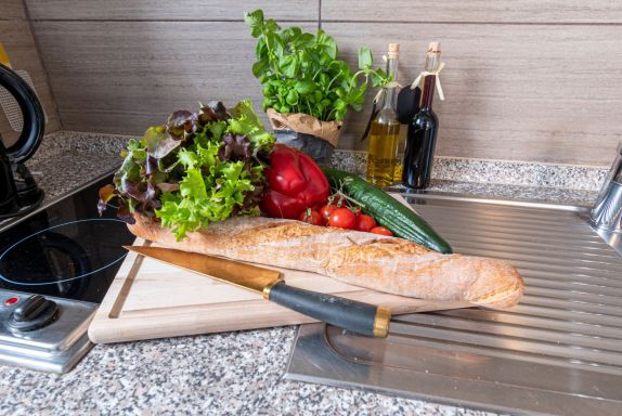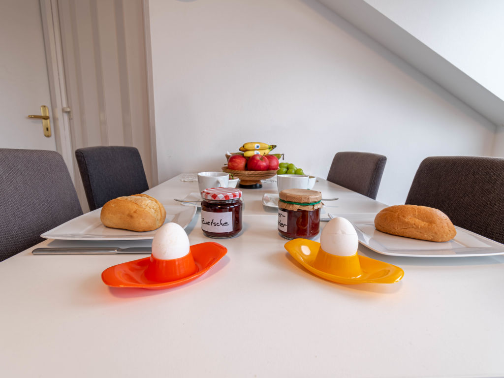 Leuchtturm, 3-Zimmer-Wohnung 42 m2, im Obergeschoss. Geschmackvoll eingerichtet: Wohn-/Esszimmer 12 m2 mit Sat-TV (Flachbildschirm), Radio und CD. Ausgang zum Balkon. 1 Zimmer 7 m2 mit 1 Doppelbett (2 x 90 cm, Länge 200 cm). 1 Zimmer 9 m2 mit 2 Betten (90 cm, Länge 200 cm). Kleine Küche (2 Glaskeramikplatten, elektrische Kaffeemaschine, Pizzaofen). Dusche/WC. Balkonmöbel, Gartengrill (mobil). Zur Verfügung: Kinderhochstuhl (extra). Bitte beachten: Nichtraucher-Unterkunft.