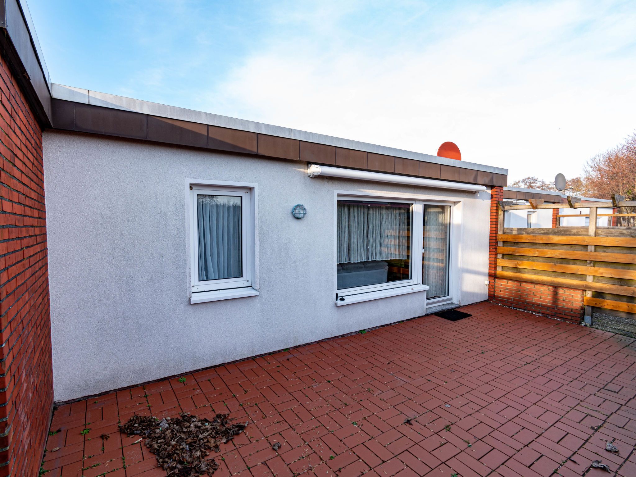 3-Zimmer-Reihenhaus 45 m2, im Erdgeschoss. Gemütlich eingerichtet: Wohn-/Esszimmer mit Sat-TV (Flachbildschirm), Radio. Ausgang zur Terrasse. 1 Zimmer mit 1 Doppelbett (2 x 90 cm, Länge 200 cm). 1 kleines Zimmer mit 1 Bett (90 cm, Länge 200 cm). Kleine Küche (4 Kochplatten, Toaster, Wasserkocher, Mikrowelle, elektrische Kaffeemaschine). Dusche/WC. Terrassenmöbel. Bitte beachten: Nichtraucher-Haus. Rauchmelder.