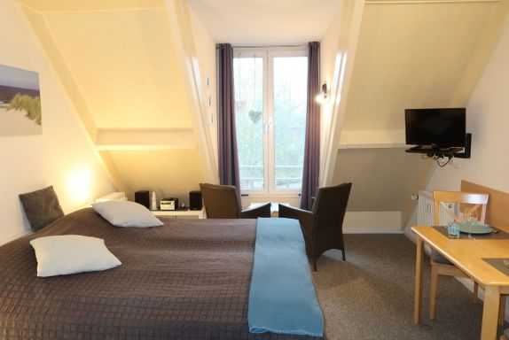 1-Zimmer-Wohnung 26 m2, im Dachgeschoss. Hell, gemütlich eingerichtet: Wohn-/Schlafzimmer mit 1 Doppelbett, Esstisch, Sat-TV, Radio und CD. Kochnische (2 Kochplatten, Toaster, Wasserkocher, Mikrowelle, elektrische Kaffeemaschine). Dusche/WC. G-Heizung. Zur Verfügung: Kinderhochstuhl, Babybett. Internet (Wireless LAN, gratis). Bitte beachten: Nichtraucher-Unterkunft. Rauchmelder, Feuerlöscher.