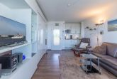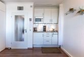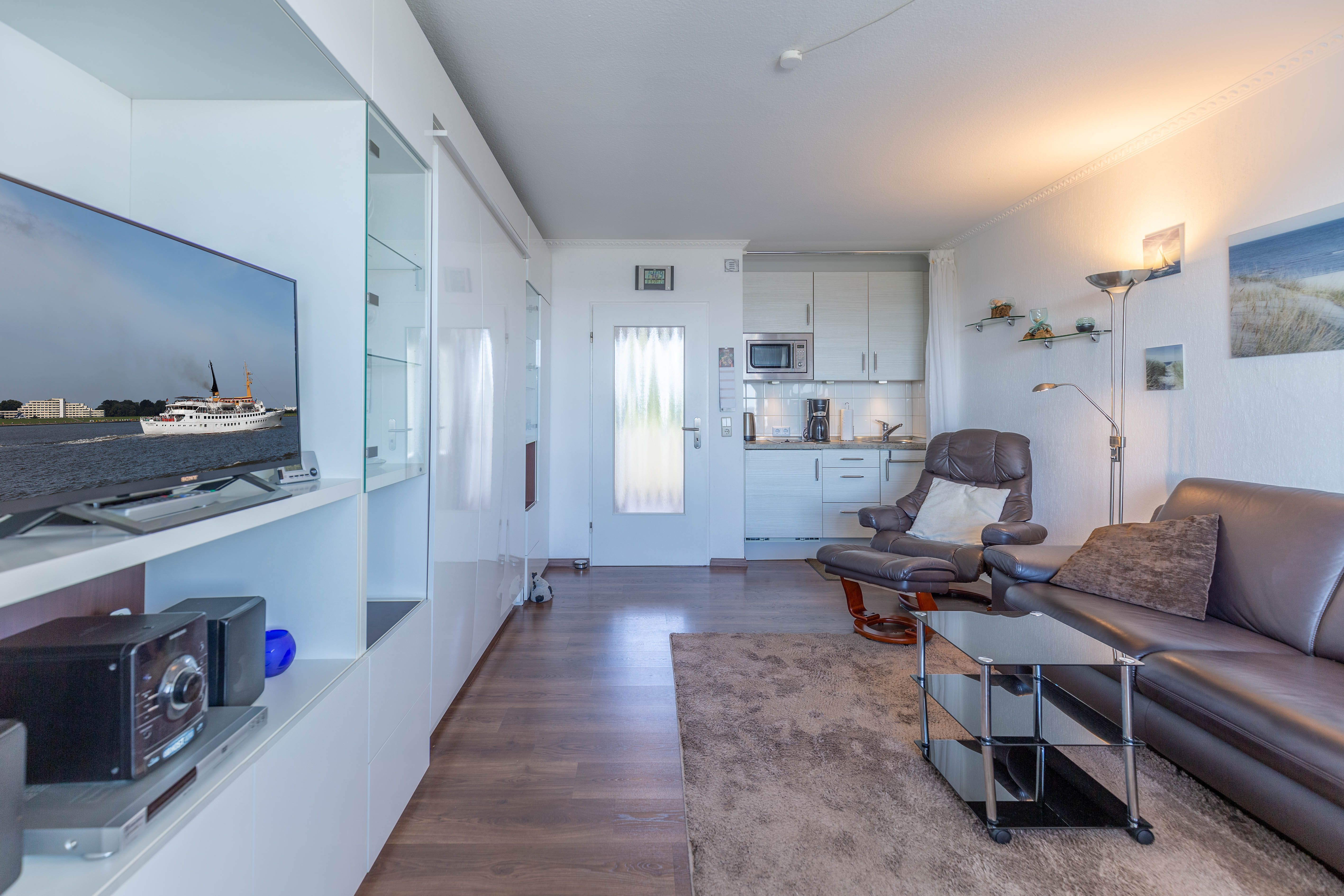 Nach einem langen und erlebnisreichen Tag können Sie im Relaxsessel oder auf dem Sofa entspannen und die Parade der vorbeiziehenden Segelschiffe, Krabbenkutter und Luxus Liner beobachten. Der Esstisch am Fenster gewährleistet, dass Sie schon beim allmorgendlichen Kaffee den herrlichen Meerblick genießen können. Ein Fernseher sorgt dafür, dass Sie auch im Urlaub nicht auf Ihre Lieblingsserie verzichten müssen. Eine kleine Küchenzeile mit 2 Platten-Cerankochfeld und Kühlschrank mit Gefrierfach ist im Wohnbereich integriert.