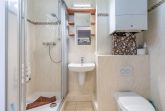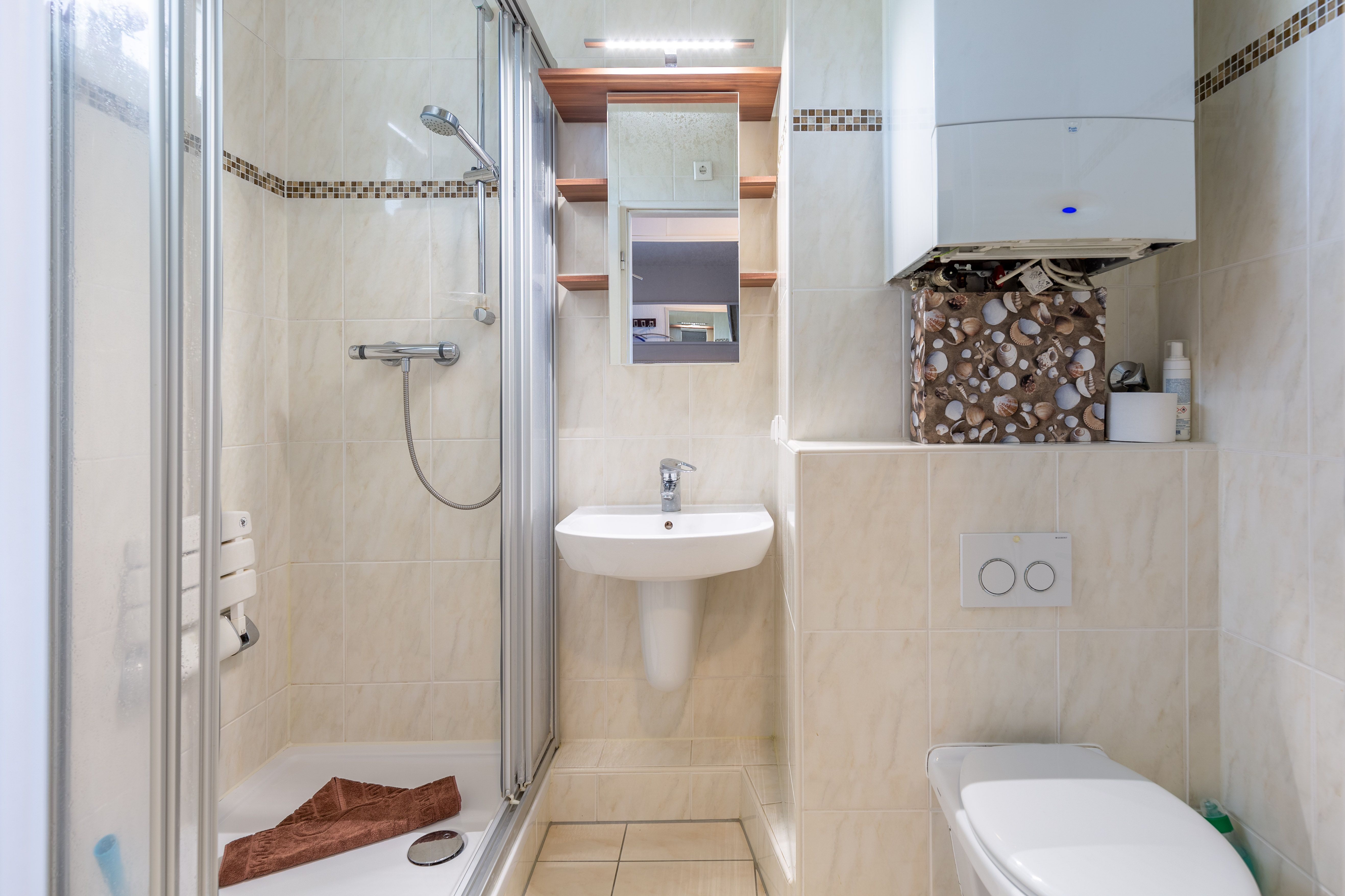 Das Schrankbett (2x90x200) im Wohnbereich gewährleistet einen erholsamen Schlaf. Darüber hinaus bietet ein separates Einzelbett (90x200) im Vorraum eine vom Wohnbereich getrennte Schlafmöglichkeit. Die Ferienwohnung ist mit Verdunklungsvorhängen ausgestattet, sodass Sie nicht von der Morgensonne geweckt werden. Auch vom möblierten Balkon genießen Sie den faszinierenden Meerblick. Das Bad mit Dusche und WC verfügt über ein Fenster zum Belüften.
