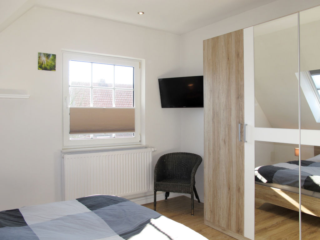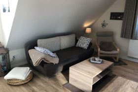 3-Zimmer-Wohnung 63 m2 im 1. Stock. Modern und geschmackvoll eingerichtet: abgeschrägtes Wohn-/Esszimmer mit Sat-TV (Flachbildschirm), Radio und DVD. 1 abgeschrägtes Zimmer mit 1 Doppelbett und Sat-TV (Flachbildschirm). 1 abgeschrägtes Zimmer mit 1 franz. Bett und Sat-TV (Flachbildschirm). Abgeschrägte, offene Küche (Backofen, Geschirrspüler, 4 Glaskeramikplatten, Toaster, Wasserkocher, Mikrowelle, elektrische Kaffeemaschine). Dusche/WC. Terrassenmöbel, Gartengrill. Zur Verfügung: Waschmaschine, Wäschetrockner, Kinderhochstuhl, Babybett. Internet (Wireless LAN, gratis). Bitte beachten: Nichtraucher-Unterkunft. Rauchmelder. Buchungen sind nur zu touristischen Zwecken erlaubt.