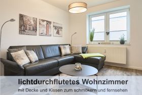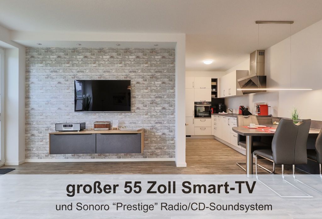 Im behaglichen Wohnbereich erwartet Sie ein großes Ledersofa, das sich auch als komfortabler Ausweich-Schlafplatz für eine erwachsene Person eignet. Für entspannte Stunden stehen Ihnen ein 55-Zoll-Smart-TV mit Kabelanschluss sowie das hochwertige Sonoro Prestige Soundsystem mit DAB+, CD, Bluetooth und Internetradio zur Verfügung Musikgenuss in Bestform.