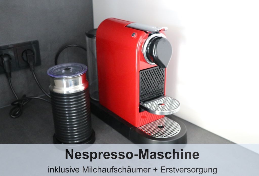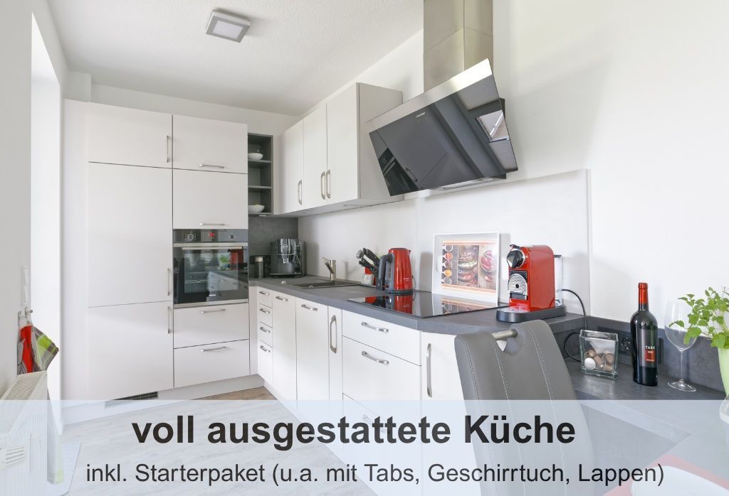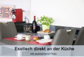 Die vollausgestattete Küche mit 4-Platten-Induktionsherd, Tiefkühlschrank, Spülmaschine, Jura-Kaffeevollautomat, Nespresso-Maschine (und vieles mehr), hochwertigem Geschirr und allen Küchenutensilien lässt keine Wünsche offen. Bei Besuch eignet sich der große Balkontisch für ein gemütliches Beisammensein.