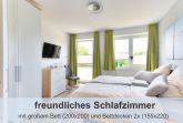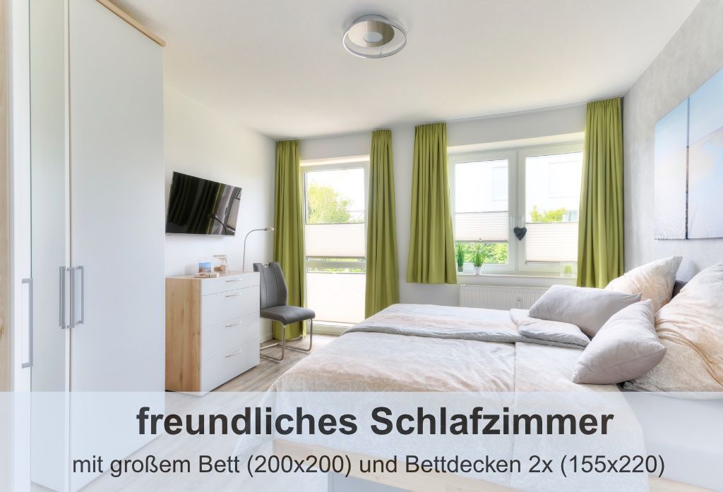 Das separate Schlafzimmer ist mit einem komfortablen Doppelbett (200 x 200 cm) ausgestattet. Die großen Komfort-Bettdecken (220 x 155 cm) und eine zusätzliche Leseecke schaffen einen Rückzugsort für Ihre persönliche Entspannung. Ein zweiter Smart-TV bietet zusätzliche Flexibilität.