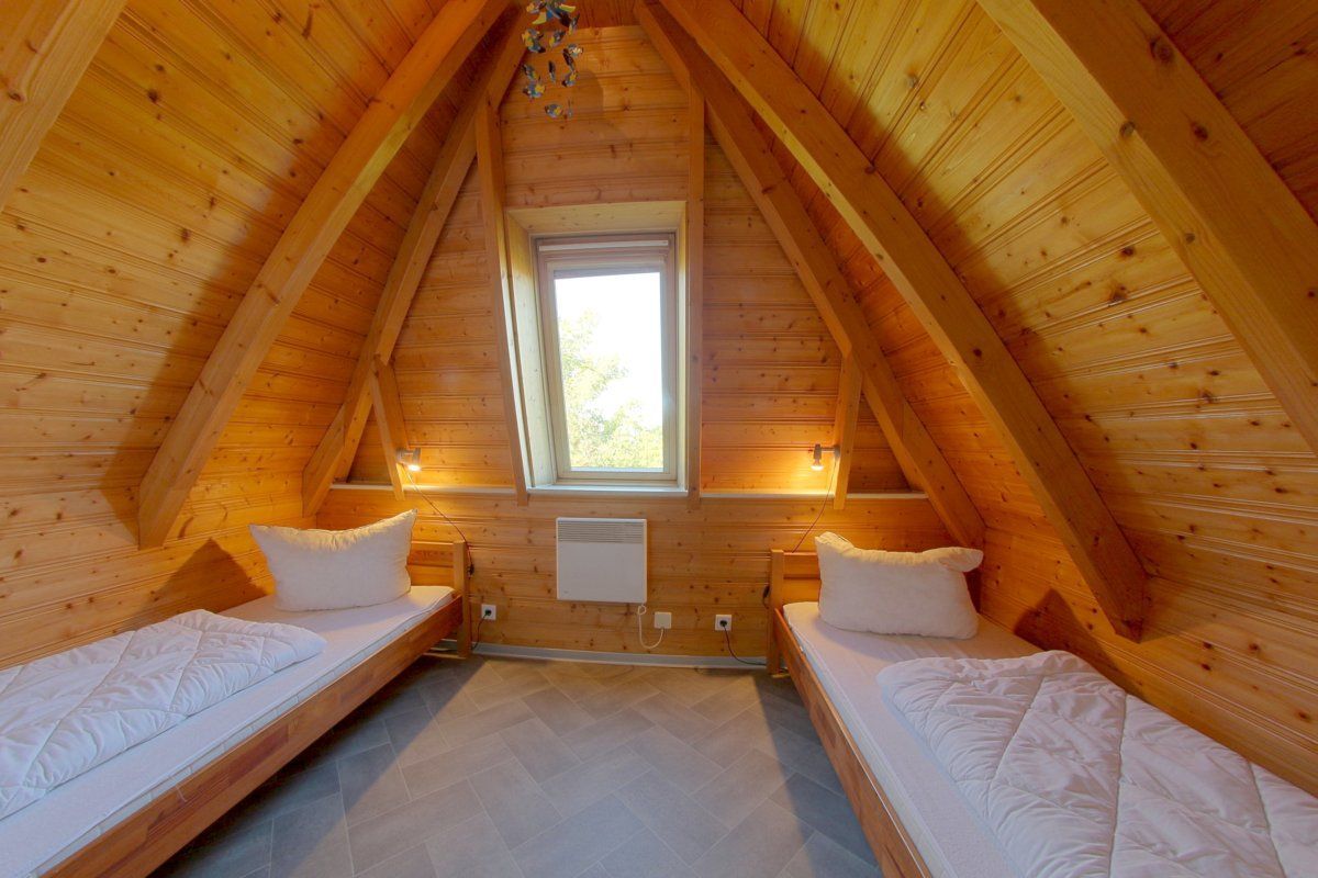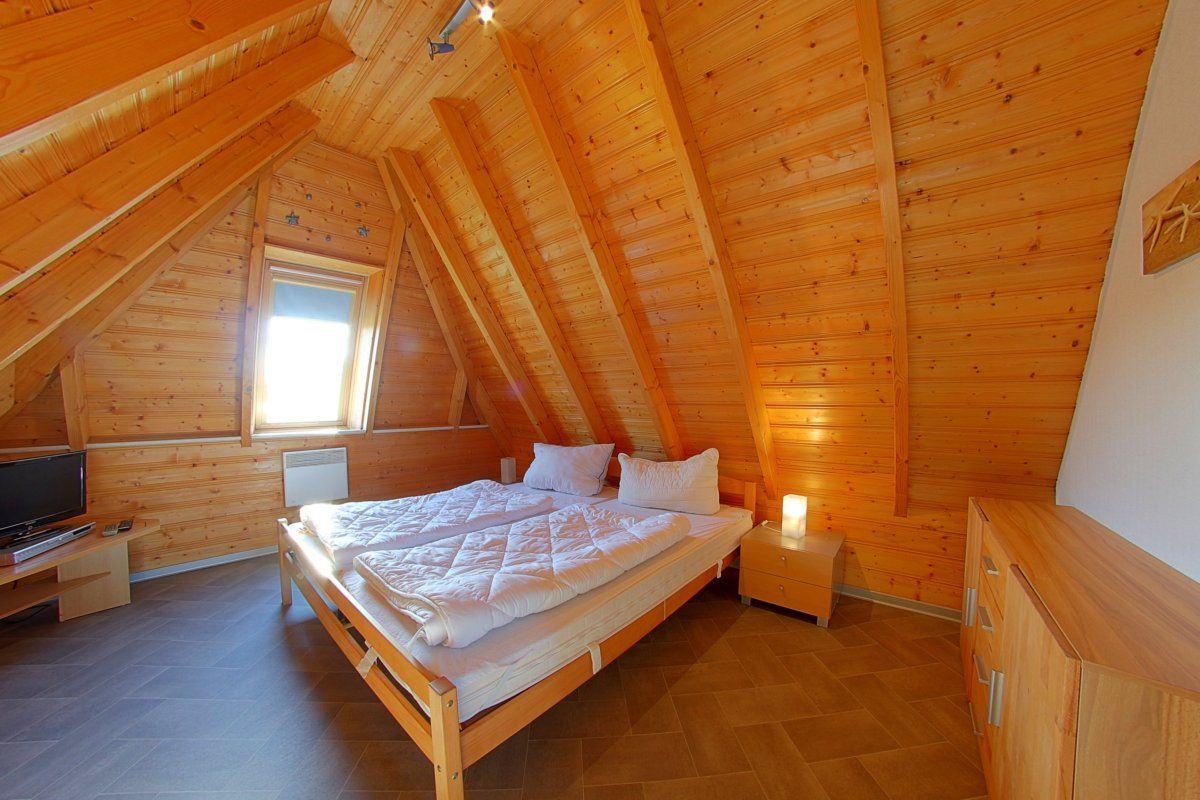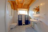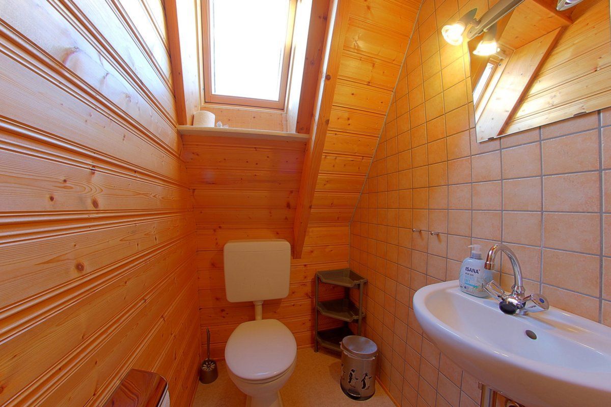 Im Obergeschoss gibt es zwei Schlafzimmer, eins mit Doppelbett und TV und eins mit 2 Einzelbetten, außerdem ein weiteres WC mit Waschbecken.