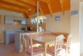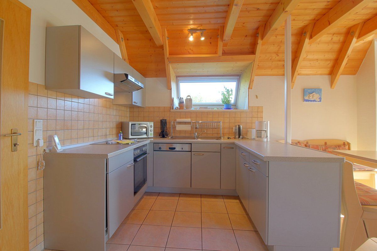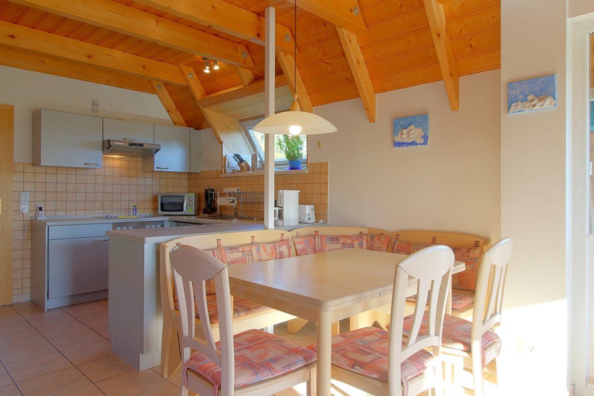 Im Erdgeschoss haben Sie den offenen Wohn- Ess- und Küchenbereich mit Kaminofen für kühle Abende und Ausgang zur Terrasse, sowie Flachbild TV. Die Küche ist komplett ausgestattet mit Pött und Pann und Geschirrspüler.