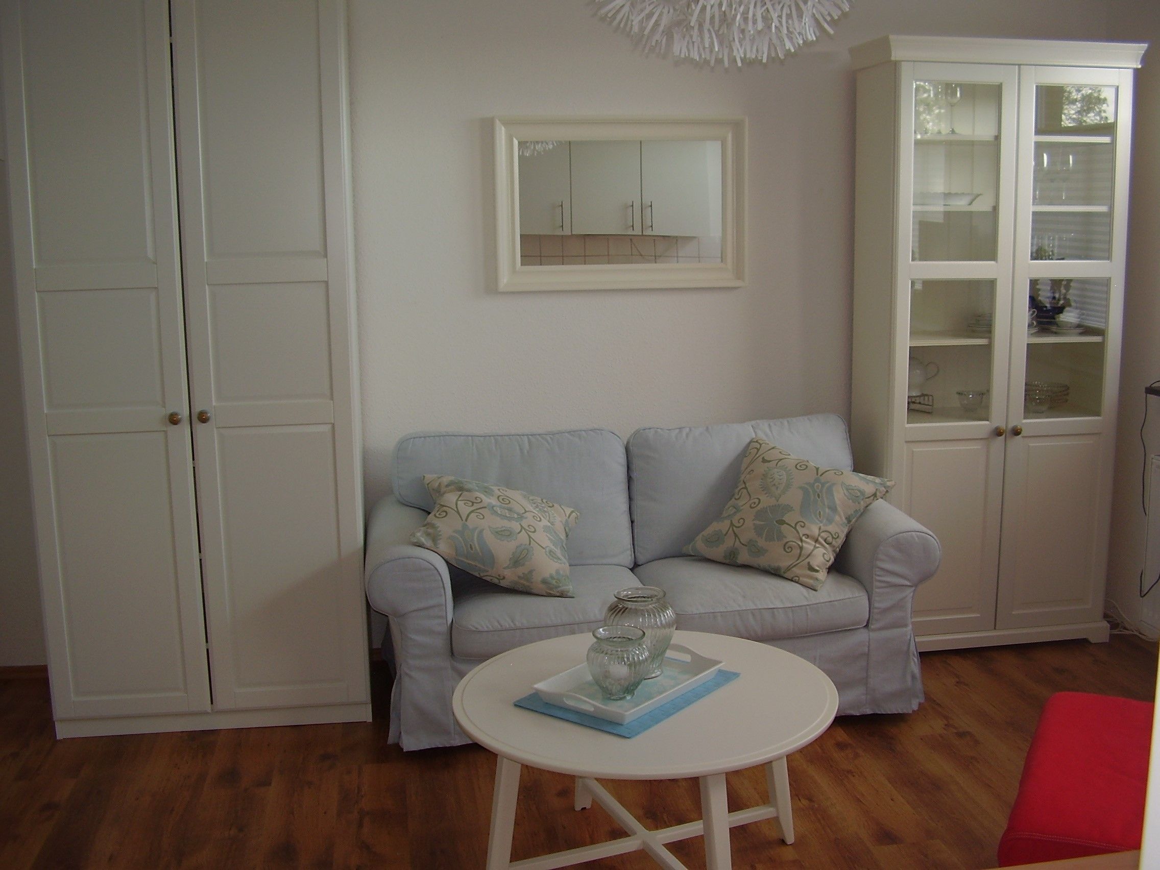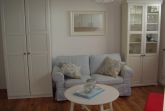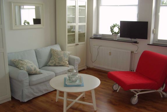 Das Ferienapartment verfügt in einem Raum über Wohn- und Essbereich mit gemütlicher Sitzgarnitur und Flachbild-TV, einer kleinen Einbauküche mit Kühlschrank, Elektroherd und den erforderlichen Elektrogeräten, sowie einem Doppelschrankbett mit Einzelmatratzen; Laminatfussboden.