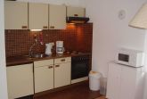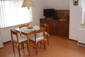 Offener Wohn- und Essbereich mit gemütlicher Ostfriesensitzecke und Flachbild-TV, Esstisch mit Bestuhlung und EBK mit Kühlschrank mit Gefrierfach, Spülmaschine, Elektroherd mit Backofen und allen erforderlichen Elektrogeräten. Südbalkon. Internet über WLAN kostenlos.
