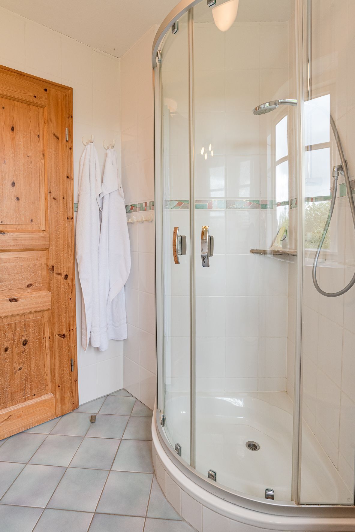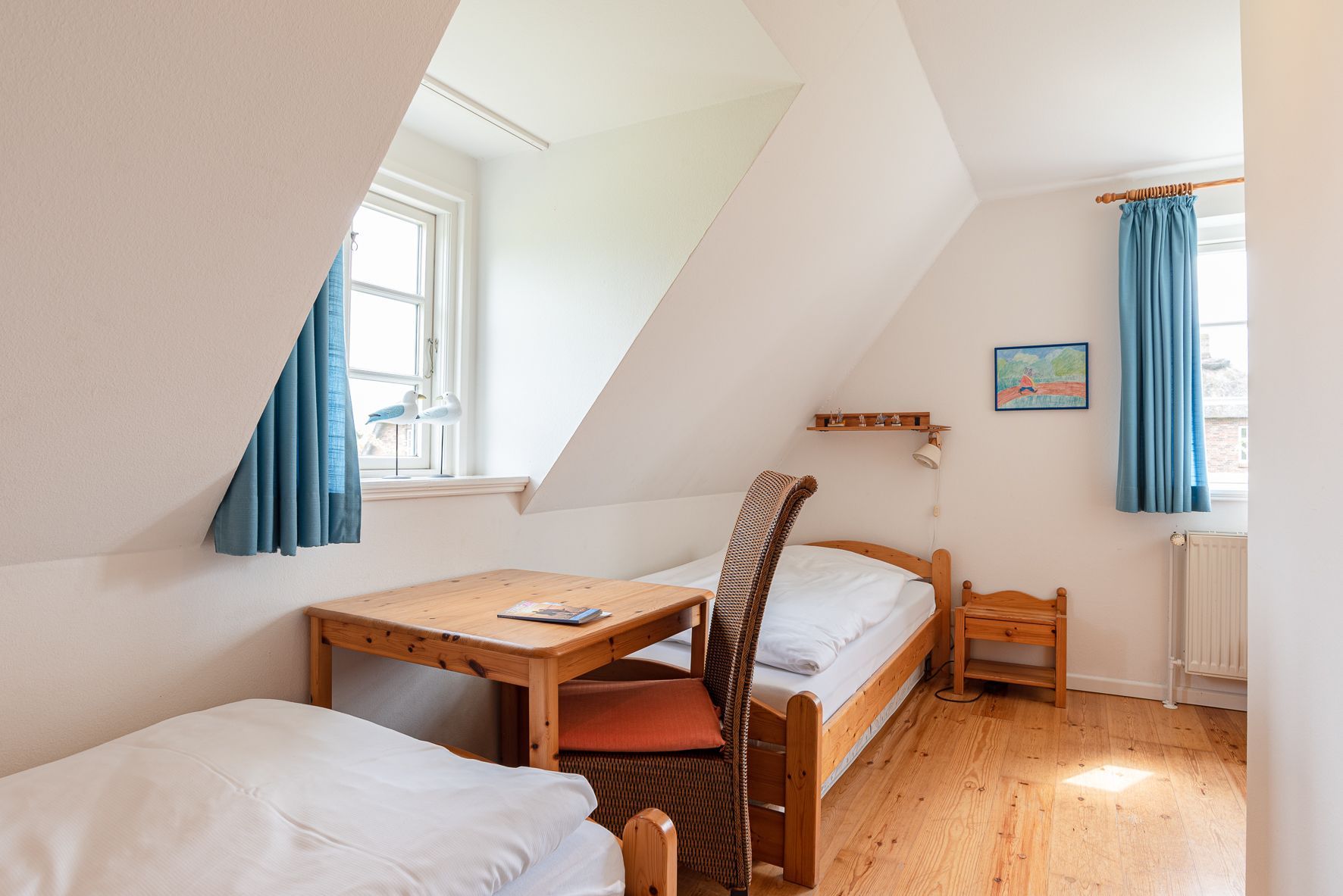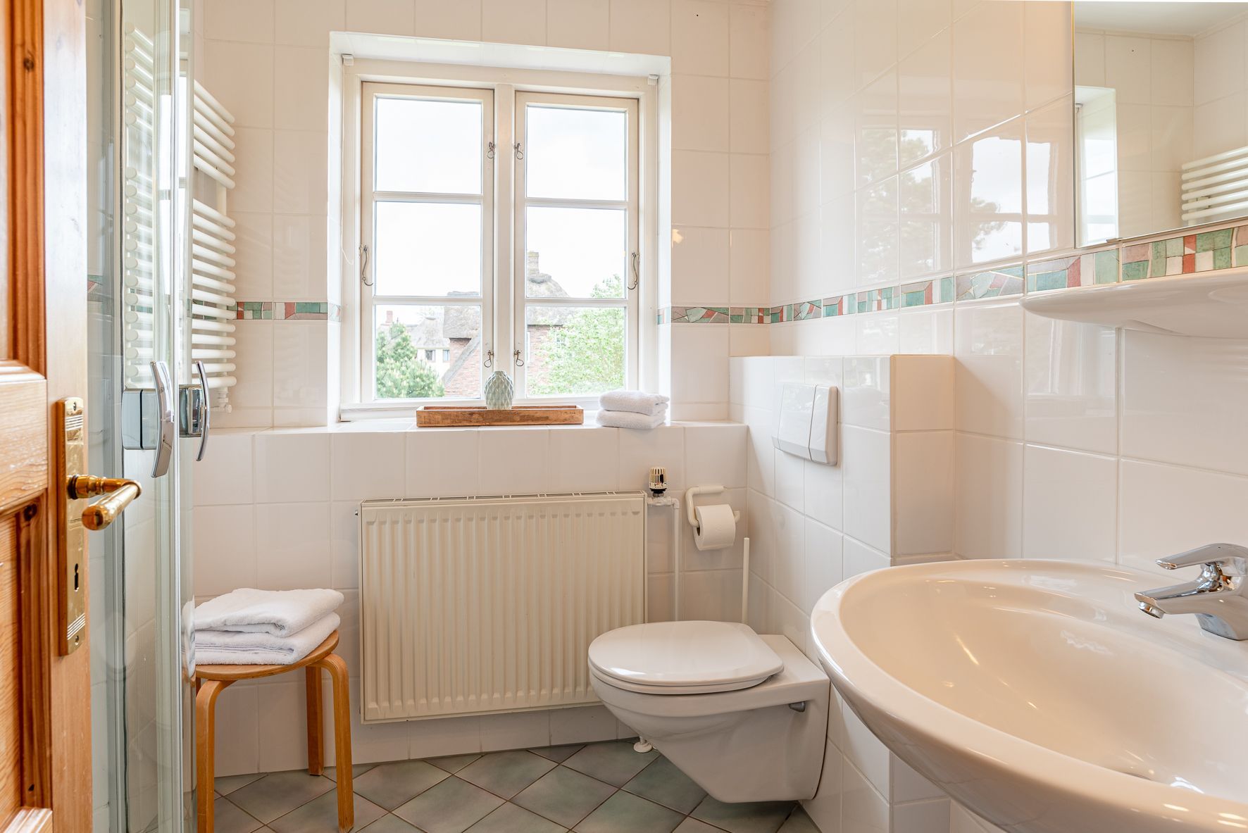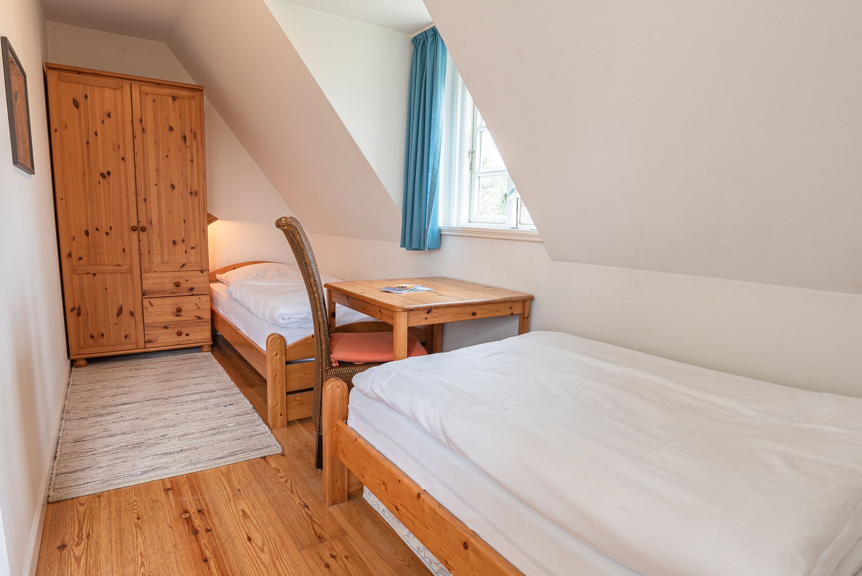 Durch die Seitentür gelangen Sie in den Vorflur in dem sich die Garderobe befindet und von dem man ins erste Duschbad gelangt. Weiter gelangt man in den großzügigen Wohn- und Essbereich, in dem sich auch der Zugang zur Terrasse und der Kaminofen befinden. Über die Treppe gelangen Sie in das 1. Obergeschoss mit zwei Schlafzimmern und dem zweiten Duschbad. Ein Schlafzimmer davon ist mit zwei Einzelbetten (hintereinander) und eins mit einem Doppelbett ausgestattet. Das dritte Schlafzimmer unter dem Dach ist mit einem Doppelbett ausgestattet.