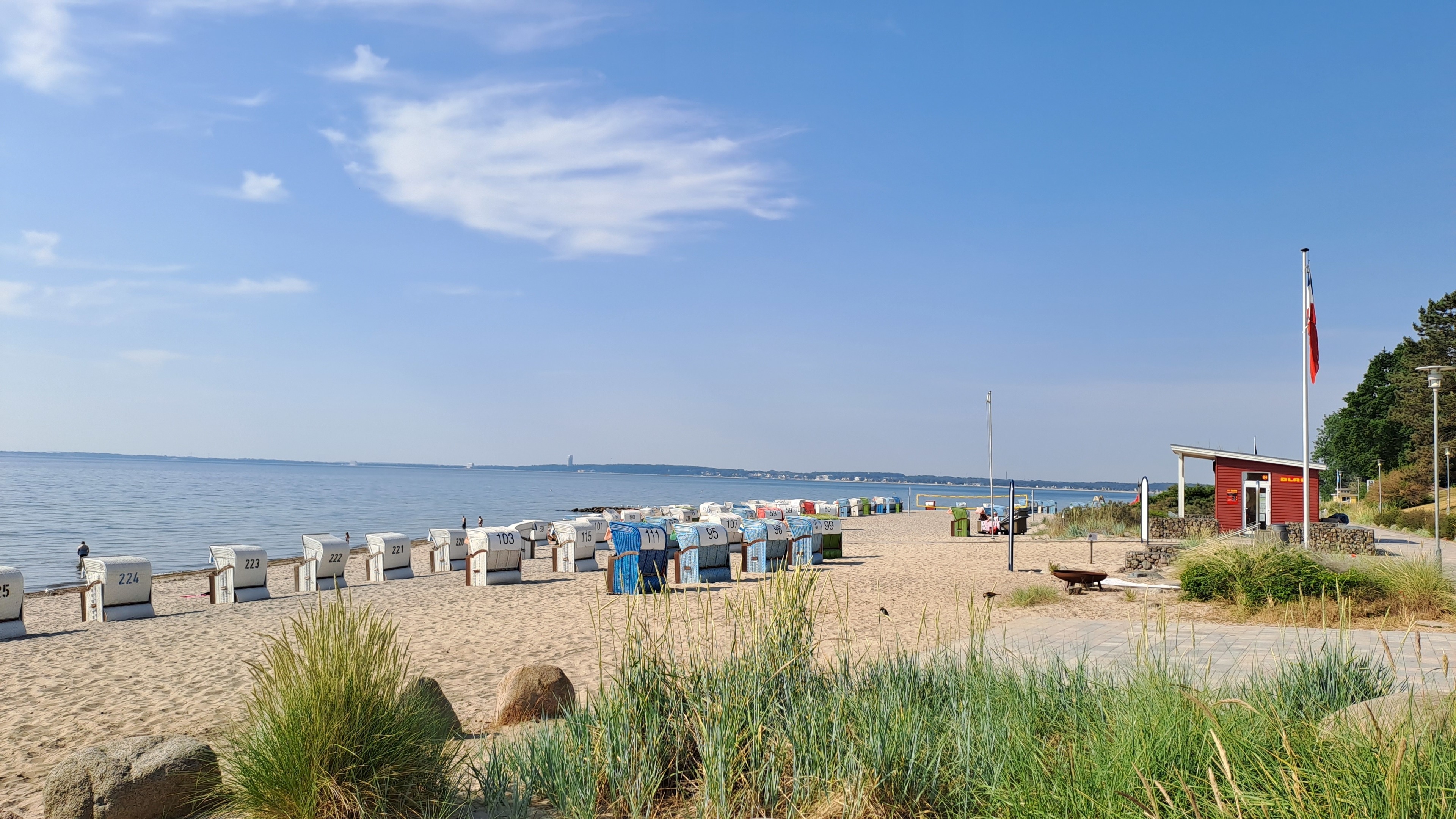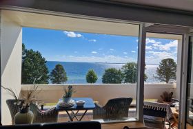 Traumhafter Blick auf die Lübecker Bucht vom möblierten Balkon. Bis zum Strand sind es über die Promenade nur wenige Meter. Die Ferienwohnung bietet eine eigener Sauna. Es gibt ein separates Schlafzimmer mit einem französischen Bett (140x200 cm) und einem Bett (160x200 cm) im Wohnbereich. Parken können Sie in der Tiefgarage. Genießen Sie erholsame Tage an der Lübecker Bucht.