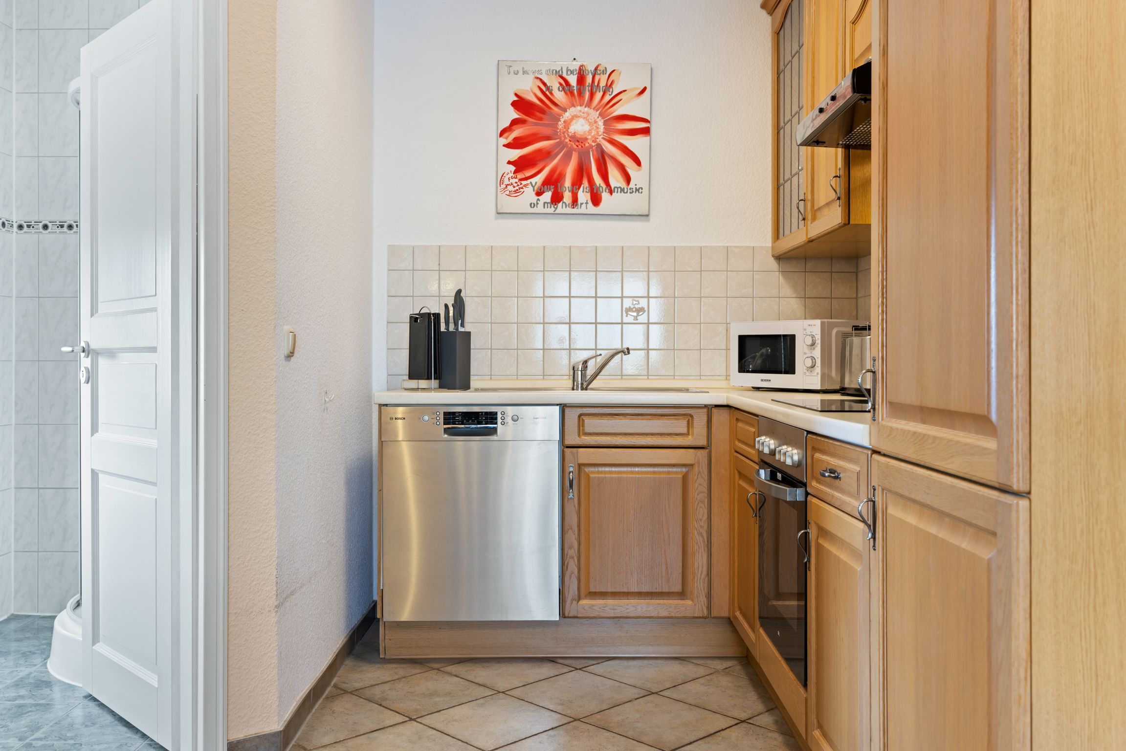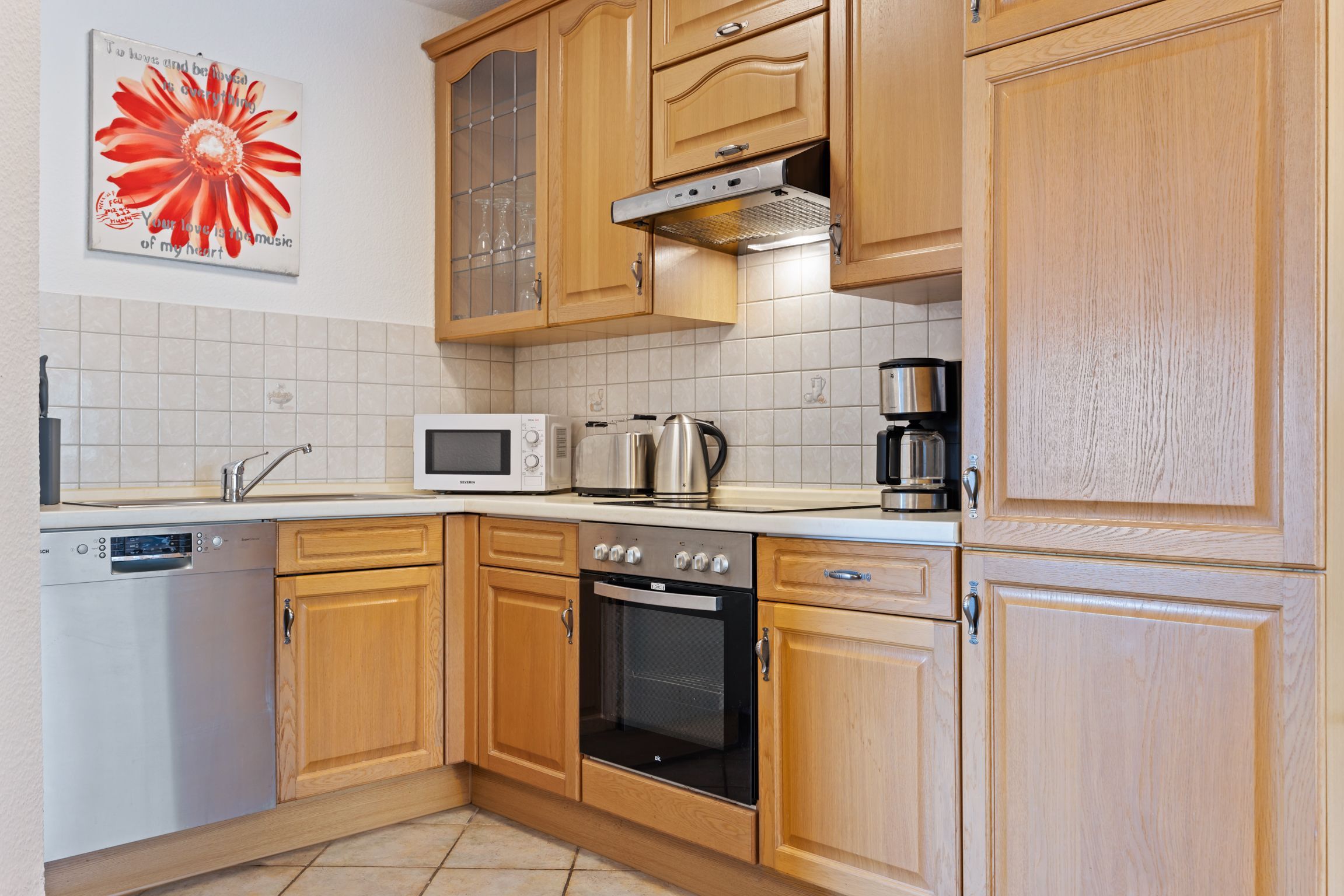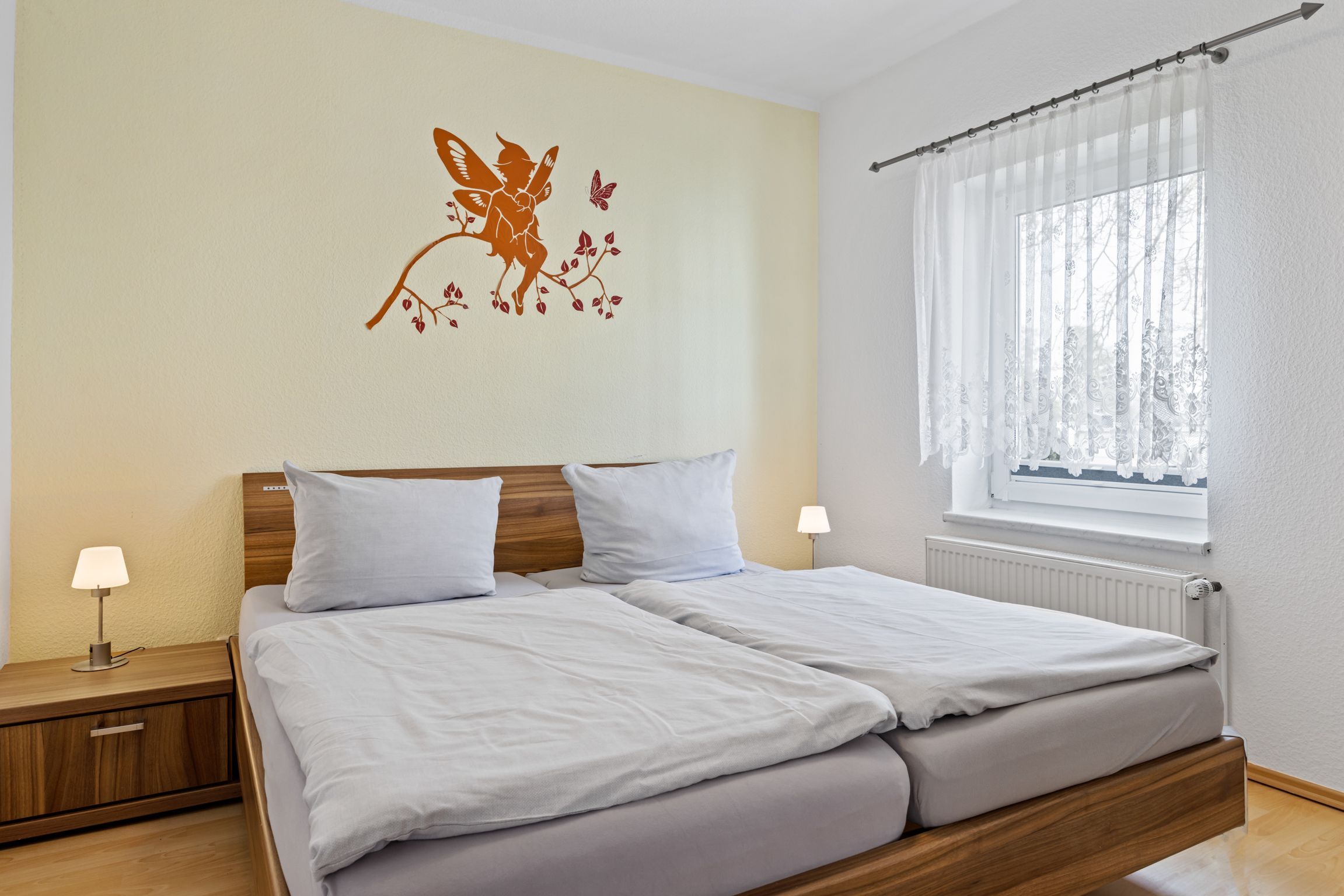 Die Ferienwohnung Nr. 2 befindet sich im Obergeschoss und verfügt über einen Wohn- Essbereich mit gemütlicher Sofaecke, Esstisch und offener Küche. Die Küche ist umfangreich ausgestattet mit Herd und Backofen, Geschirrspüler, Filter- Kaffemaschine sowie Dolce Gusto Capmaschine, Wasserkocher, Toaster, Kühlschrank mit Gefrierfach. Schlafzimmer mit Doppelbett (1,80m*2m) und Kleiderschrank. Schlafzimmer mit Einzelbett (0,90m*2m) Bad mit Dusche und WC. Die Ferienwohnung befindet sich im OG und ist daher nur über eine Treppe im Haus  erreichbar.