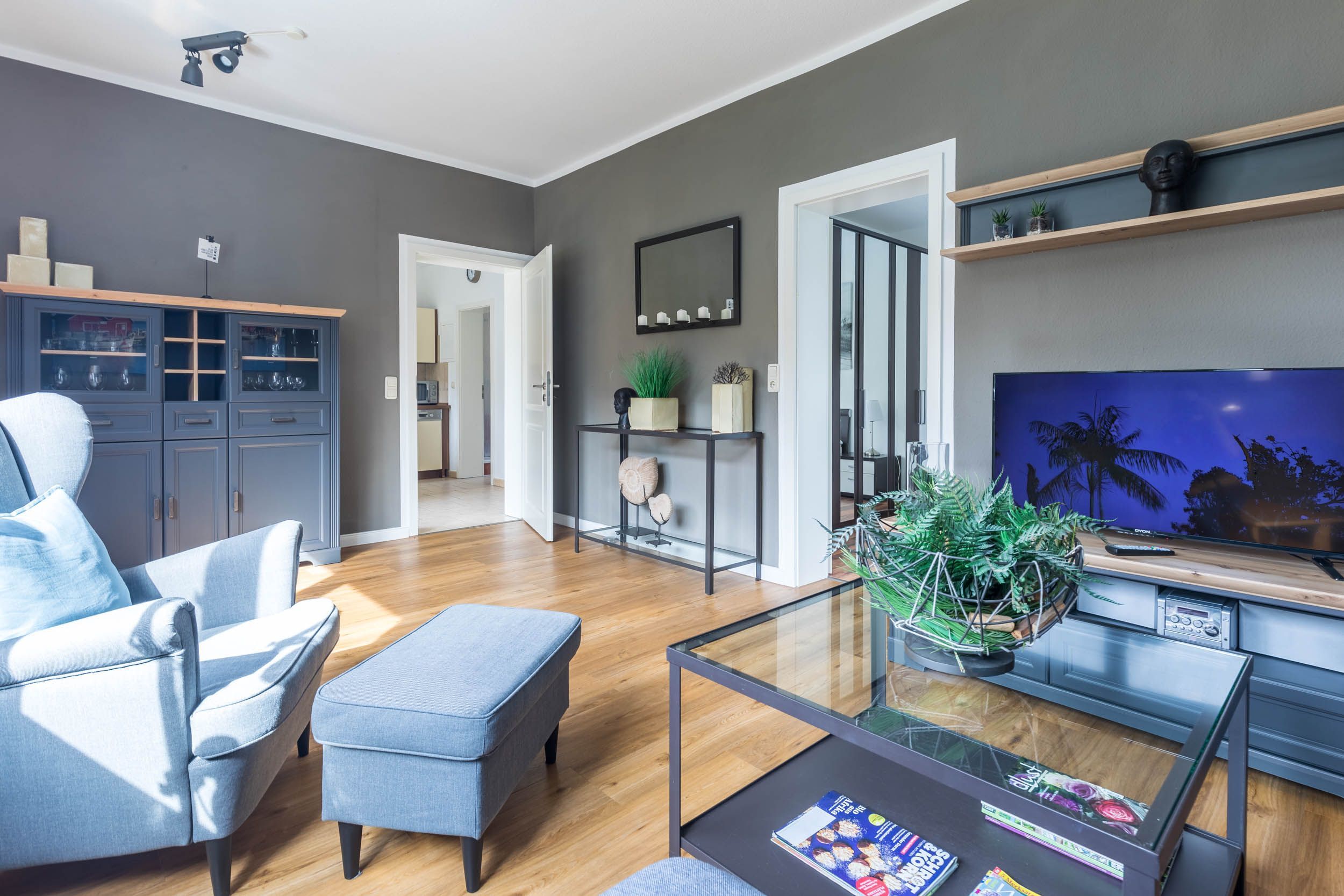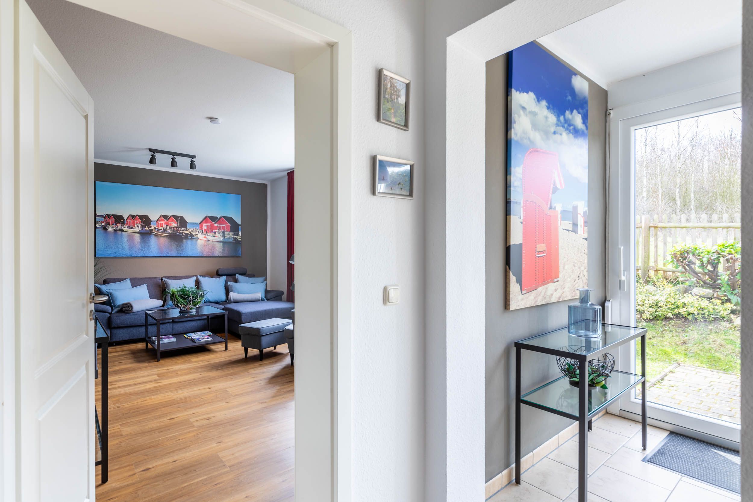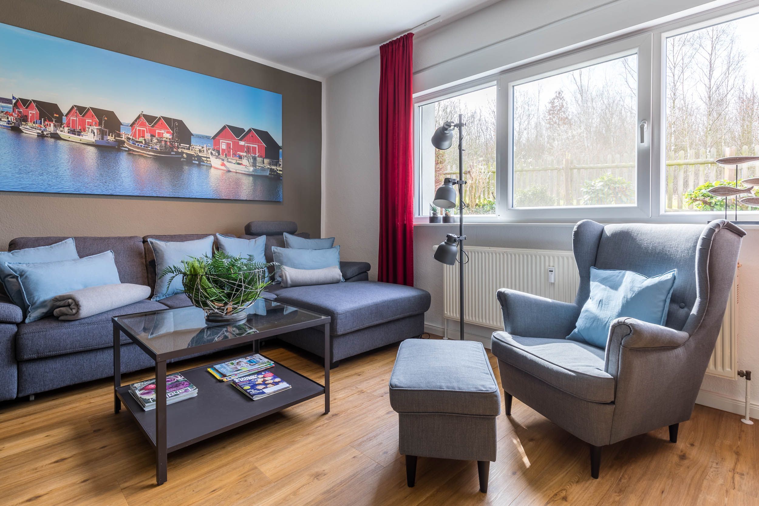 Die Ferienwohnung bietet für 2 Gäste Platz. Der Eingangsbereich ist überdacht. In einem separaten Raum befindet sich die Garderobe, ein großer Spiegel und ein Haushaltsschrank. Im Wohnbereich befindet sich eine komfortable Couch mit Schlaffunktion. Das Schlafzimmer ist mit einem 1,80 m x 2,00 m (2 Matratzen je 0,9 m x 2 m) Bett, einem Kleiderschrank sowie Sat-TV eingerichtet. Die Küche ist mit einem Kühlschrank mit Gefrierfach, Backofen, 4er Ceranfeld, Geschirrspüler, Wasserkocher, Toaster, Mikrowelle sowie Filterkaffeemaschine und Nespresso-Maschine (Zusatz) ausgestattet. Von der Küche aus betritt man den Wintergarten mit Essbereich und Zugang zur Sonnenterrasse.