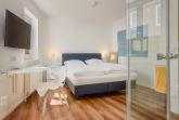 Die vollverglaste, ebenerdige Dusche sowie das Waschbecken befinden sich im Schlafzimmerbereich. Der kleine WC-Bereich mit Geberit-WC und Handwaschbecken ist privatissime vom Schlafbereich durch eine Schiebetüranlage mit Sandstrahlglas abgetrennt.