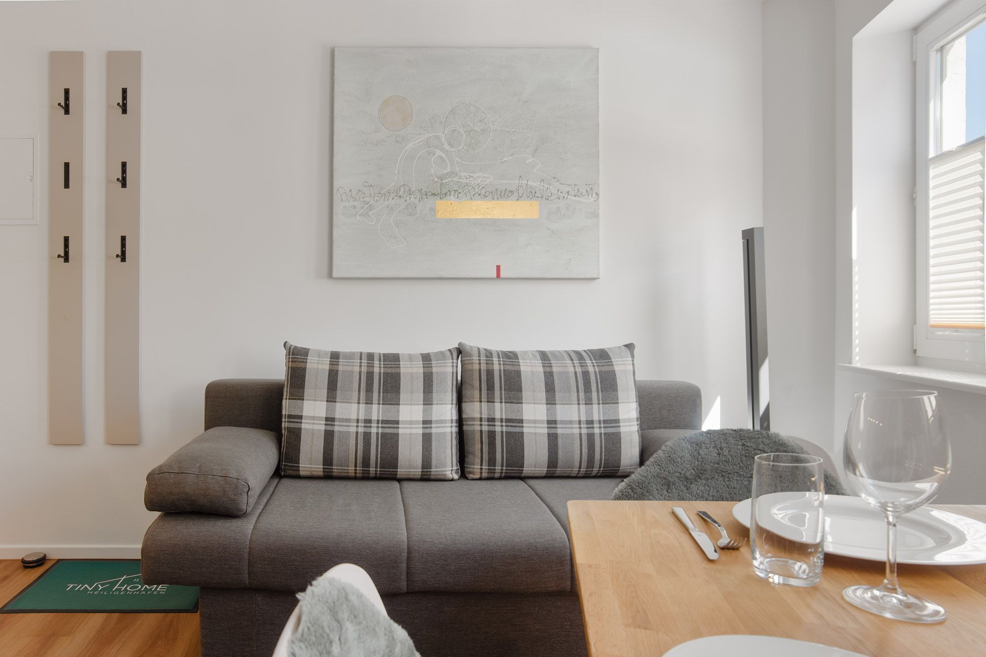 Tiny [klein] Home [zu Hause] bedeutet, was diese Ferienwohnung vermitteln möchte: Sie ist vom Papier her klein, aber Sie fühlen sich sofort wohl. Sie erfahren, dass glücklich sein nicht abhängig ist von Quadratmetern. Sich angekommen fühlen, daheim sein, das ist der Anspruch dieser Wohnung mit ihrer außergewöhnlichen Raumnutzung.