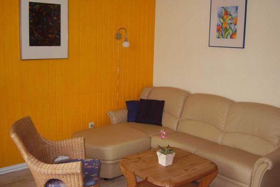 Wohnzimmer mit gemütlicher Sitzgruppe und einem Schrankbett mit 2 Vollbetten, SAT-TV und Stereoanlage.