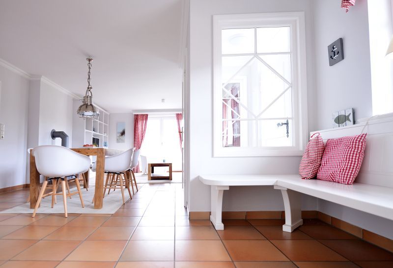 Das Haus Austernfischer mit Südterrasse und Gartenanteil geht über zwei Etagen: Wohnen, Essen und Kochen im Erdgeschoss, ein Schlafzimmer im EG, weitere Schlafzimmer im Obergeschoss, in der Galerie und im Souterrain. Zwei Bäder und eine Sauna sind im Haus.