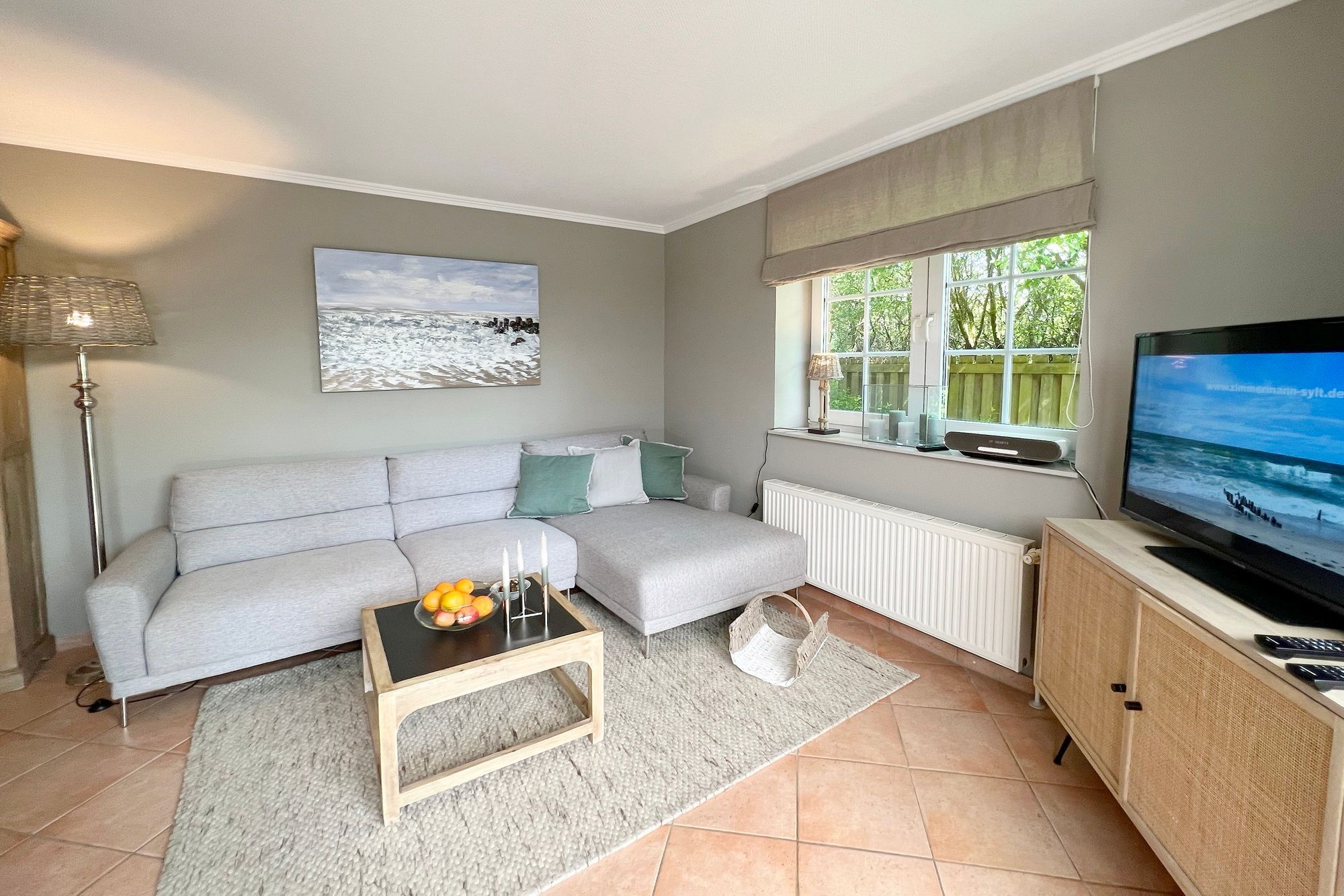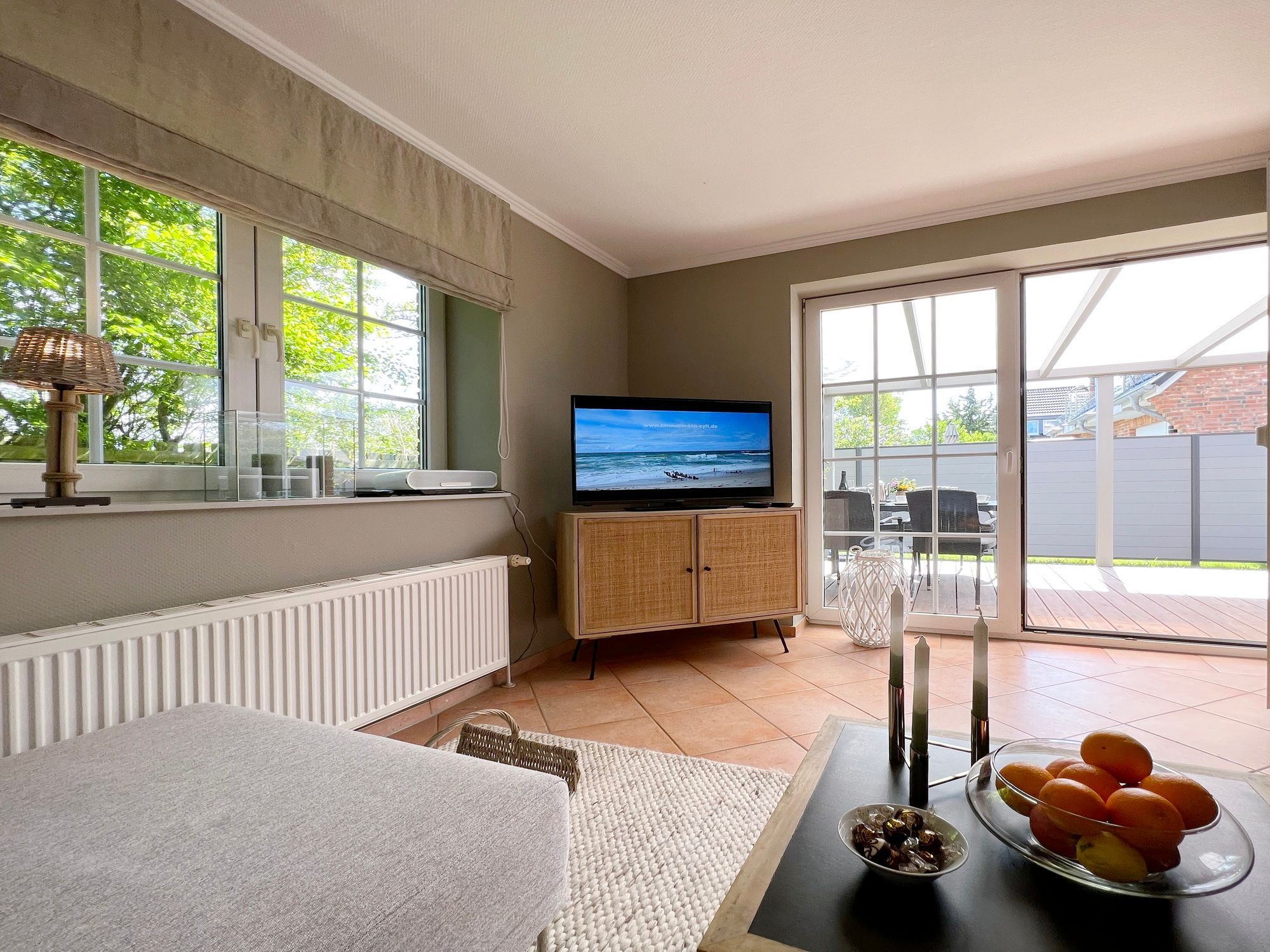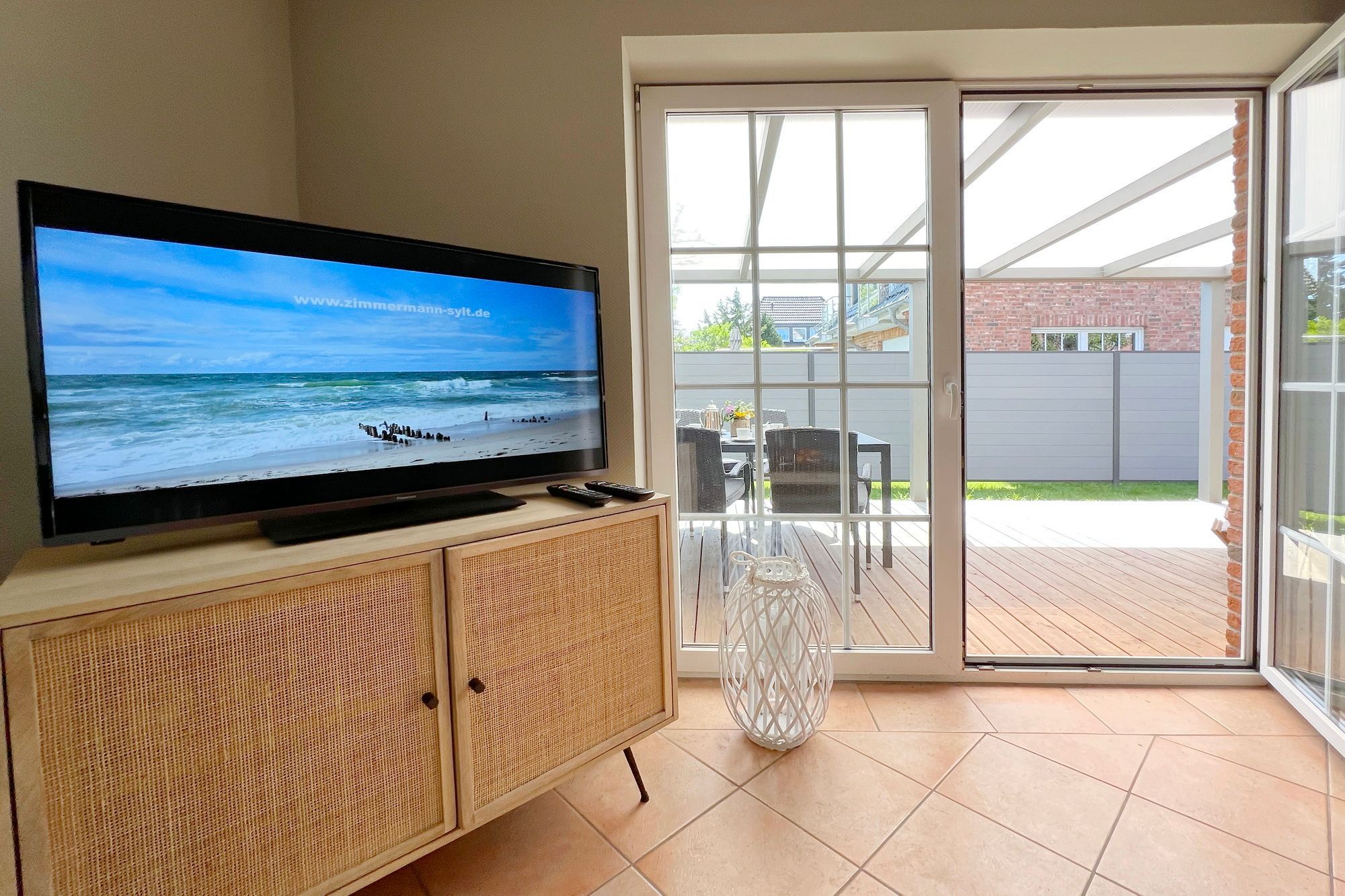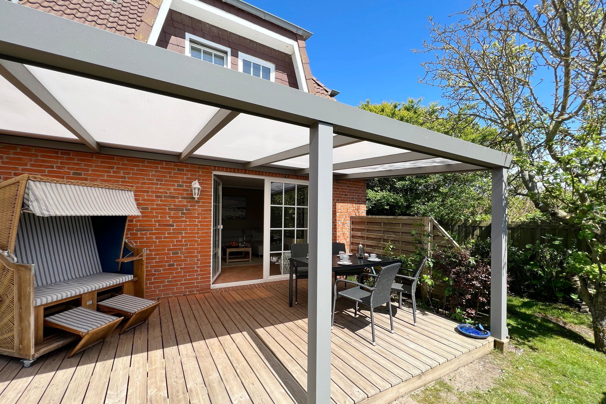 Die ebenerdige Ferienwohnung Kampen hat eine Größe von etwa 75 m² und befindet sich in einer ruhigen Lage auf dem hinteren Teil eines Grundstücks am Ortsrand im Norden von Westerland. Das Wohnzimmer ist modern eingerichtet und verfügt über eine offene Küche. Von dort aus gelangt man auf die überdachte Terrasse, die nach Süden ausgerichtet ist und mit einem Strandkorb, Gartenmöbeln und Sonnenliegen ausgestattet ist. Die Wohnung verfügt über zwei Schlafzimmer mit jeweils einem Doppelbett sowie ein großes Badezimmer mit Dusche, WC und Waschbecken. Auf dem Grundstück befindet sich ein PKW-Stellplatz. Während der Sommerferien beträgt die Mindestmietdauer 14 Übernachtungen, bei kürzeren Aufenthalten kann dies auf Anfrage ermöglicht werden. Gerne dürfen Sie hier ein gut erzogenes Haustier mitbringen. Dafür wird dann eine einmalige Haustiergebühr berechnet.