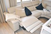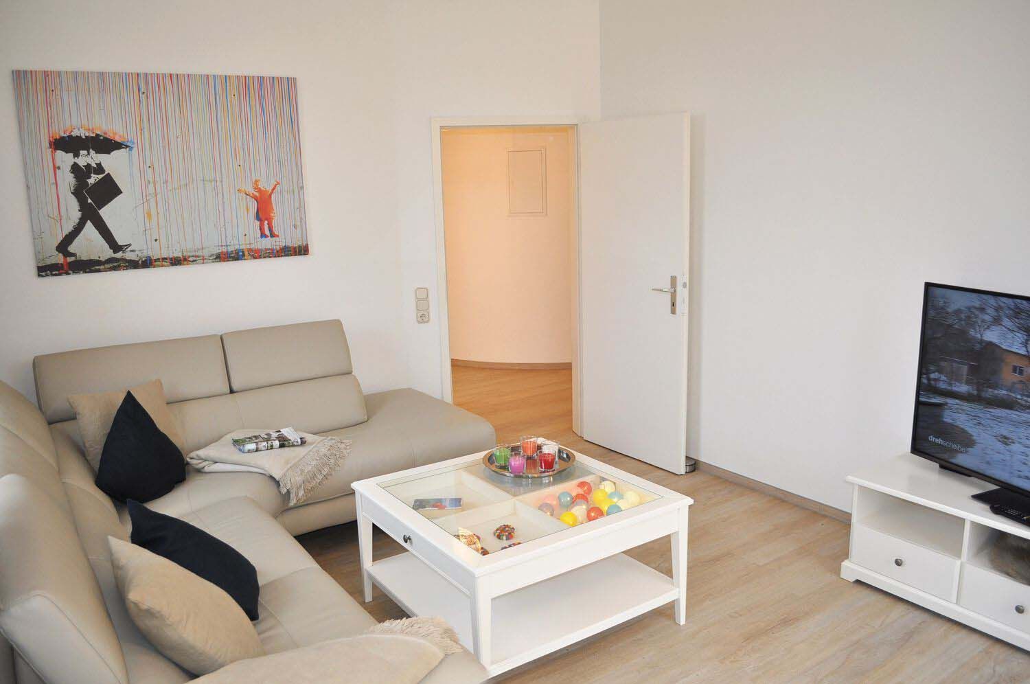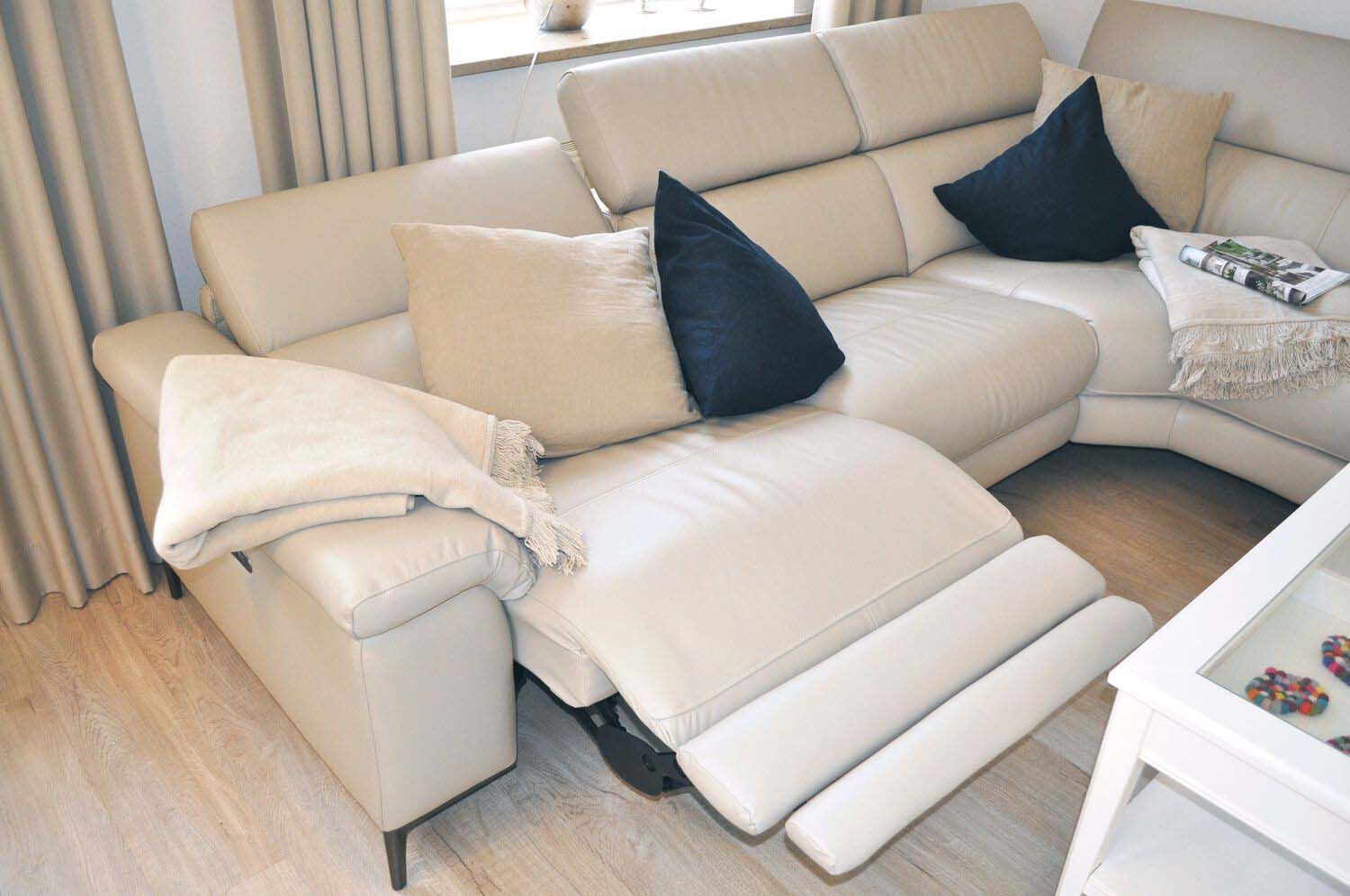Wohnzimmer: 4 Stühle, Couchtisch, Eckledercouch mit Relaxfunktion elektrisch, Esstisch ausziehbar, Flachbildschirm, Stehlampe, Stereoanlage mit CD-Player, TV-Anrichte