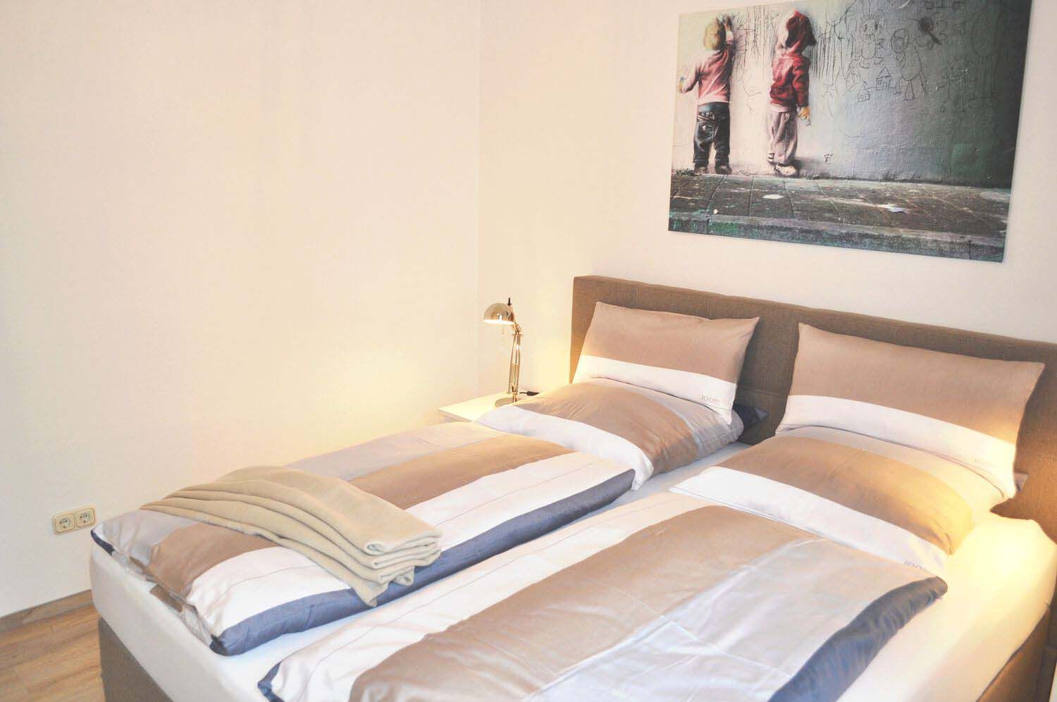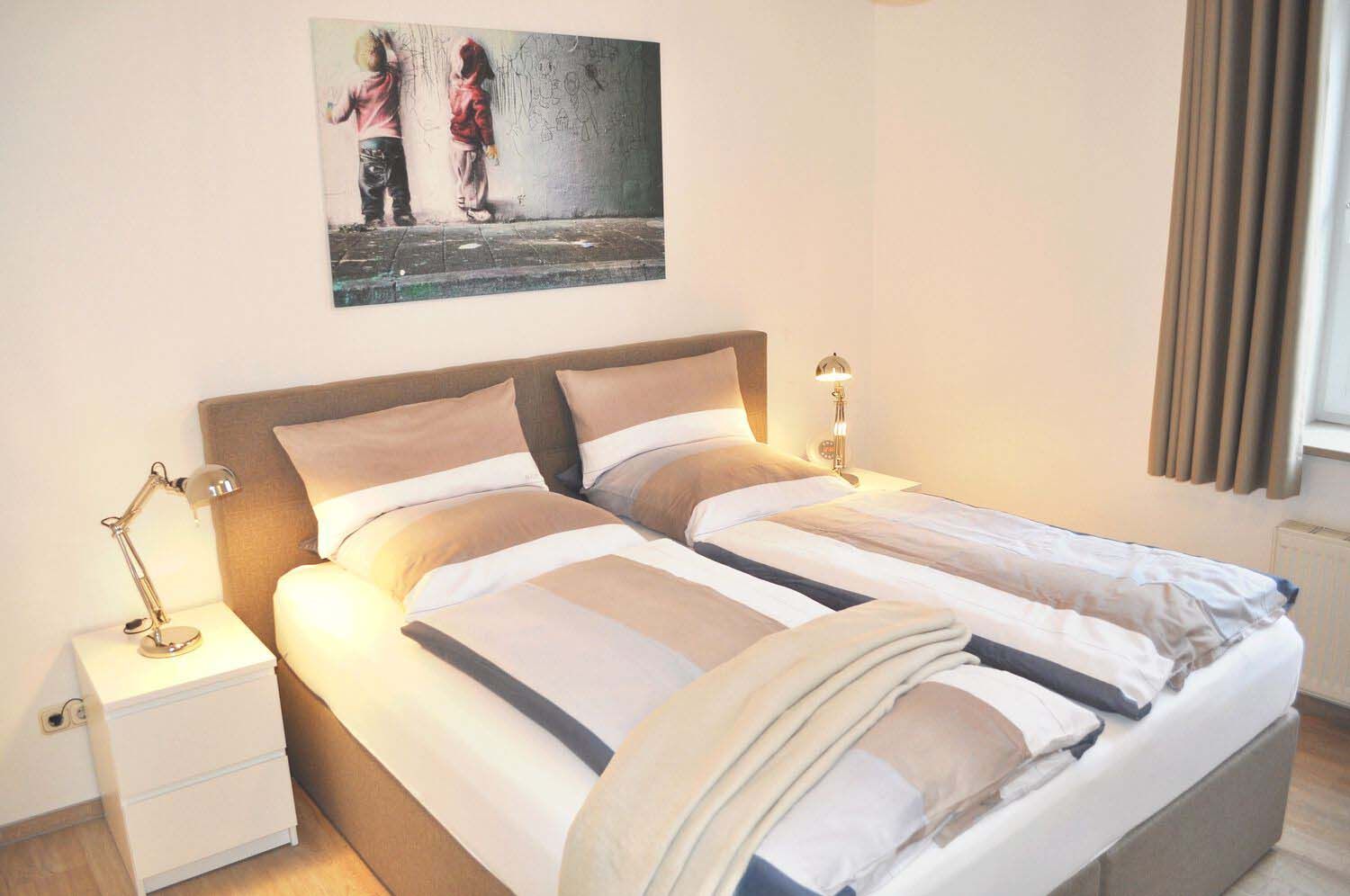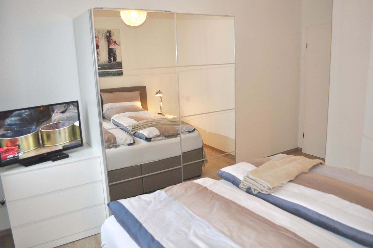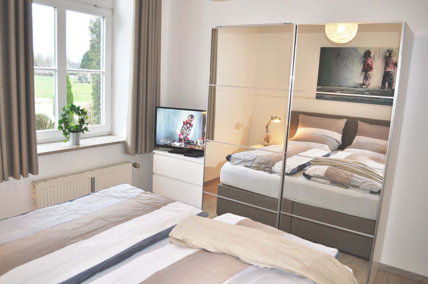Schlafzimmer 1: 1 Matratze, 2 Nachttische, Boxspringbett 2,00 x 1,80 m, Flachbildschirm, Kleiderschrank mit Spiegel, Kommode, Radiowecker