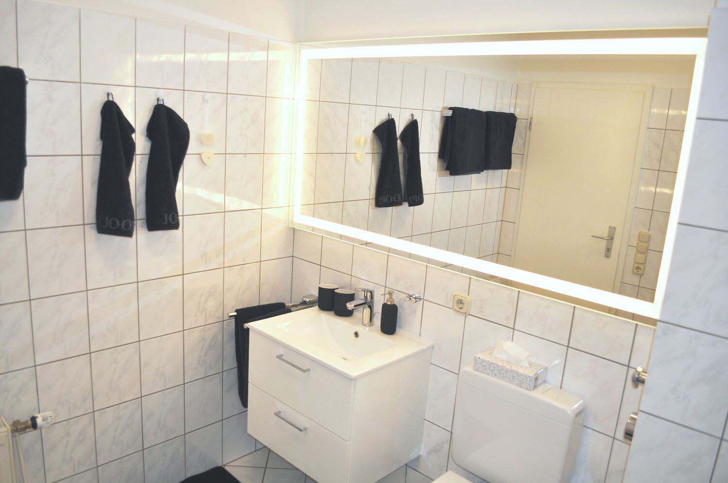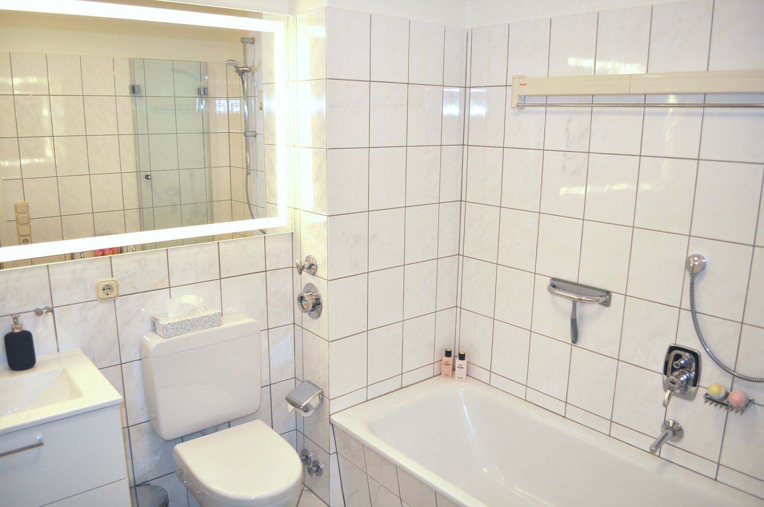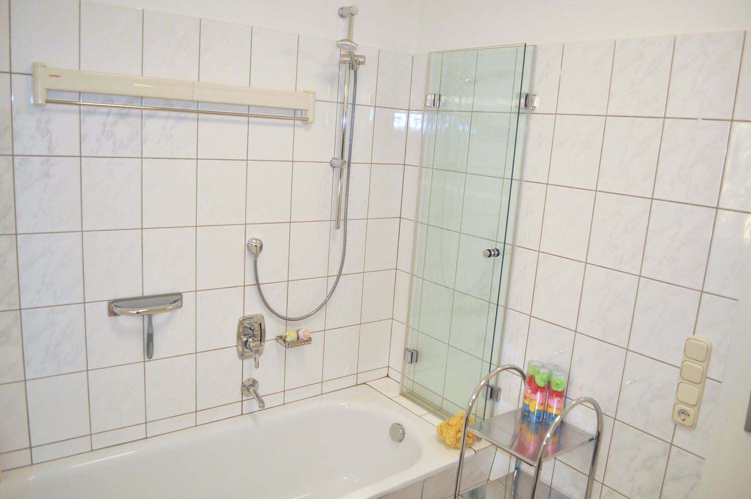 Bad 1: Badewanne, Glastrennwand, Regal, Spiegel, Waschtisch mit Unterschrank, WC