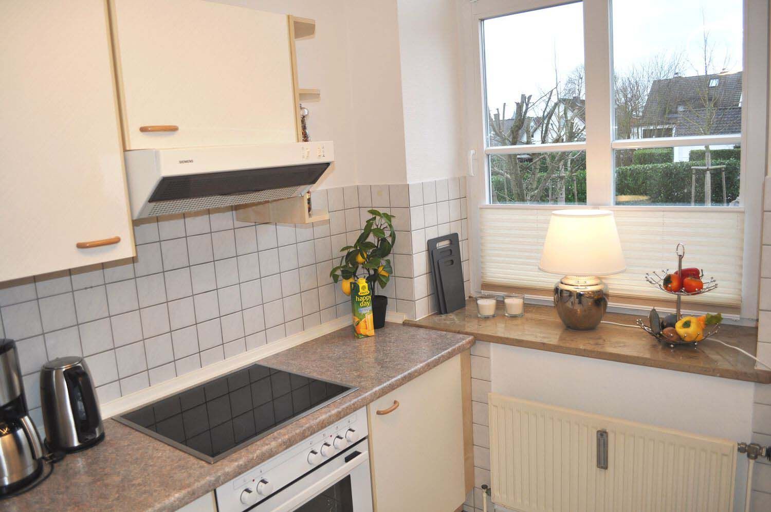 Küche: 4 Plattenherd mit Ceranfeld und Backofen, Bügeleisen, Dunstabzugshaube, Eierkocher, Einbauküche, Geschirr, Handmixer, Kaffeemaschine, Kochtöpfe, Kühlschrank mit 3* Gefrierfach, Mikrowelle, Nespresso Maschine, Spülmaschine, Stabmixer, Toaster, Wasserkocher