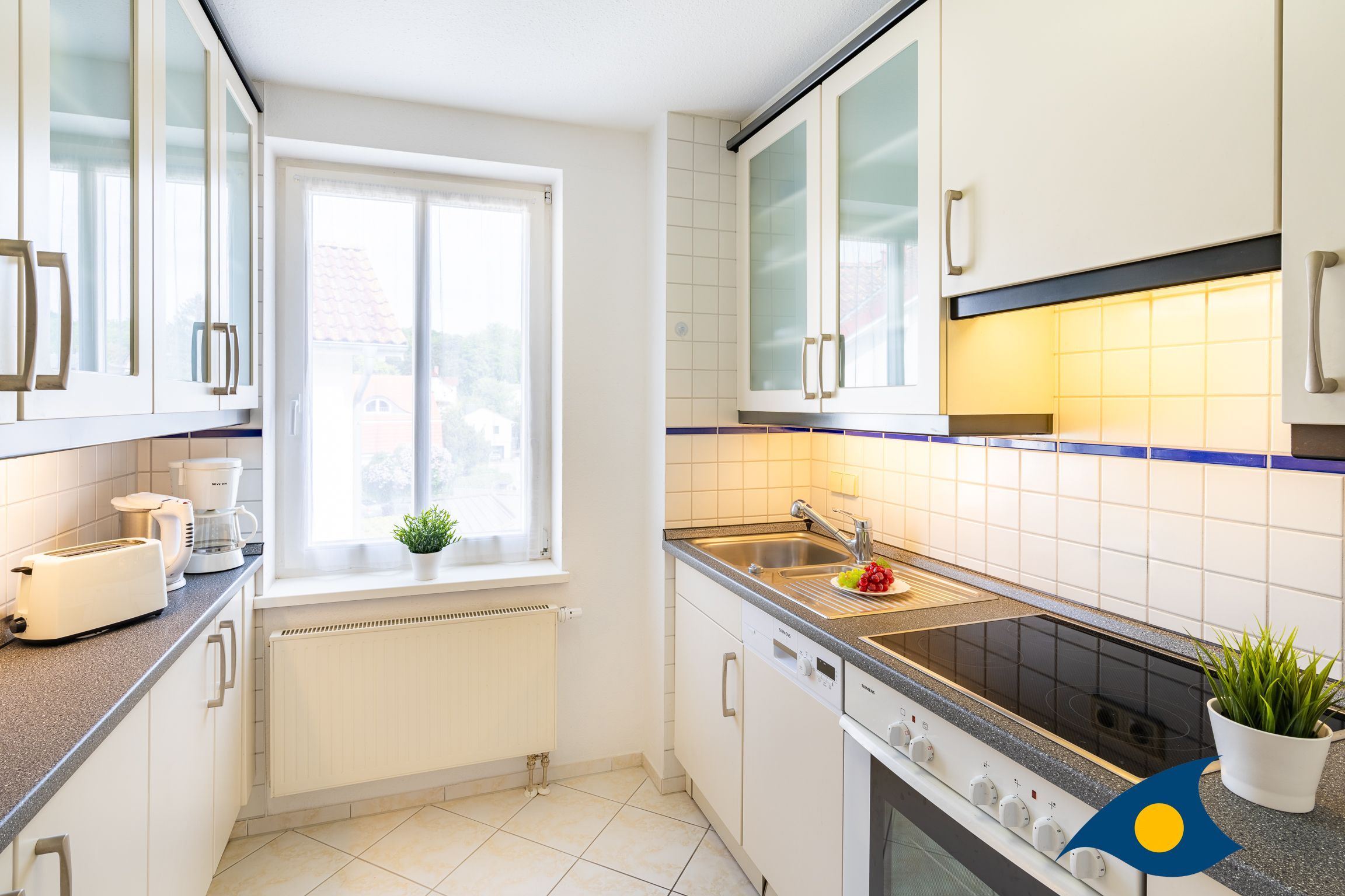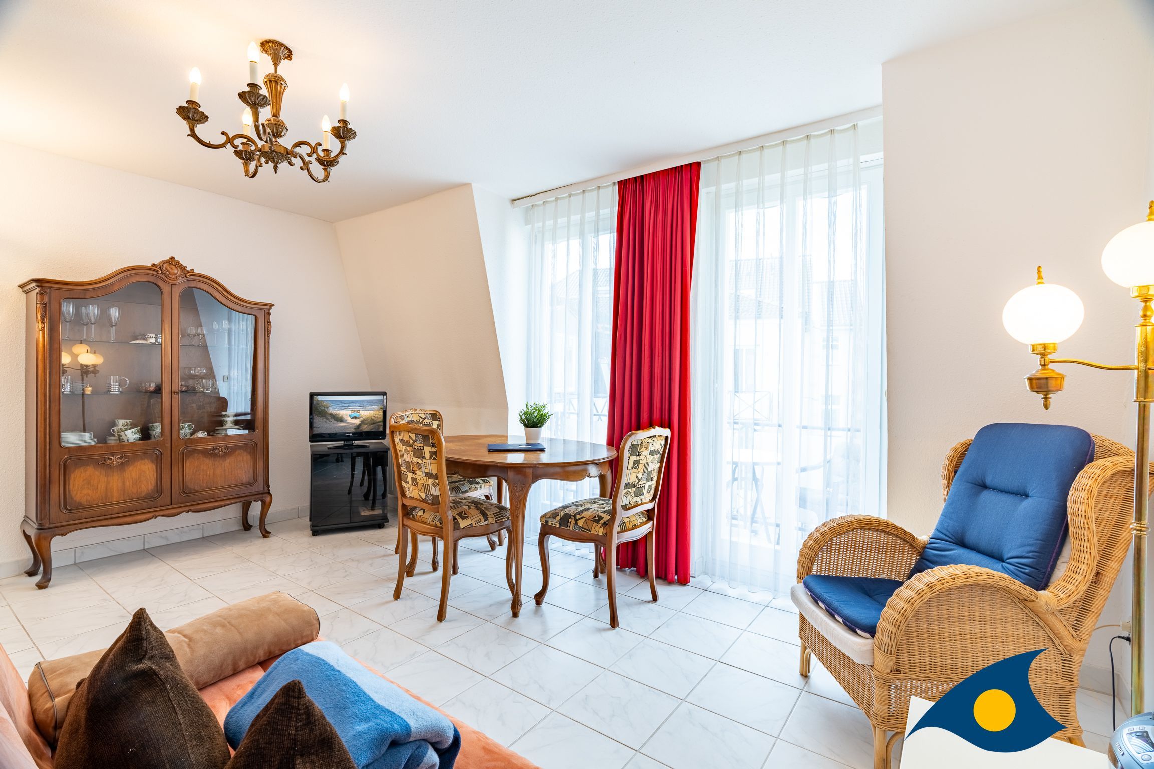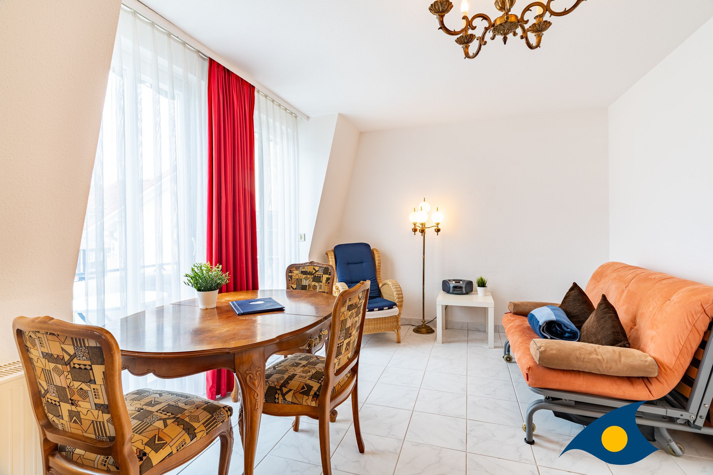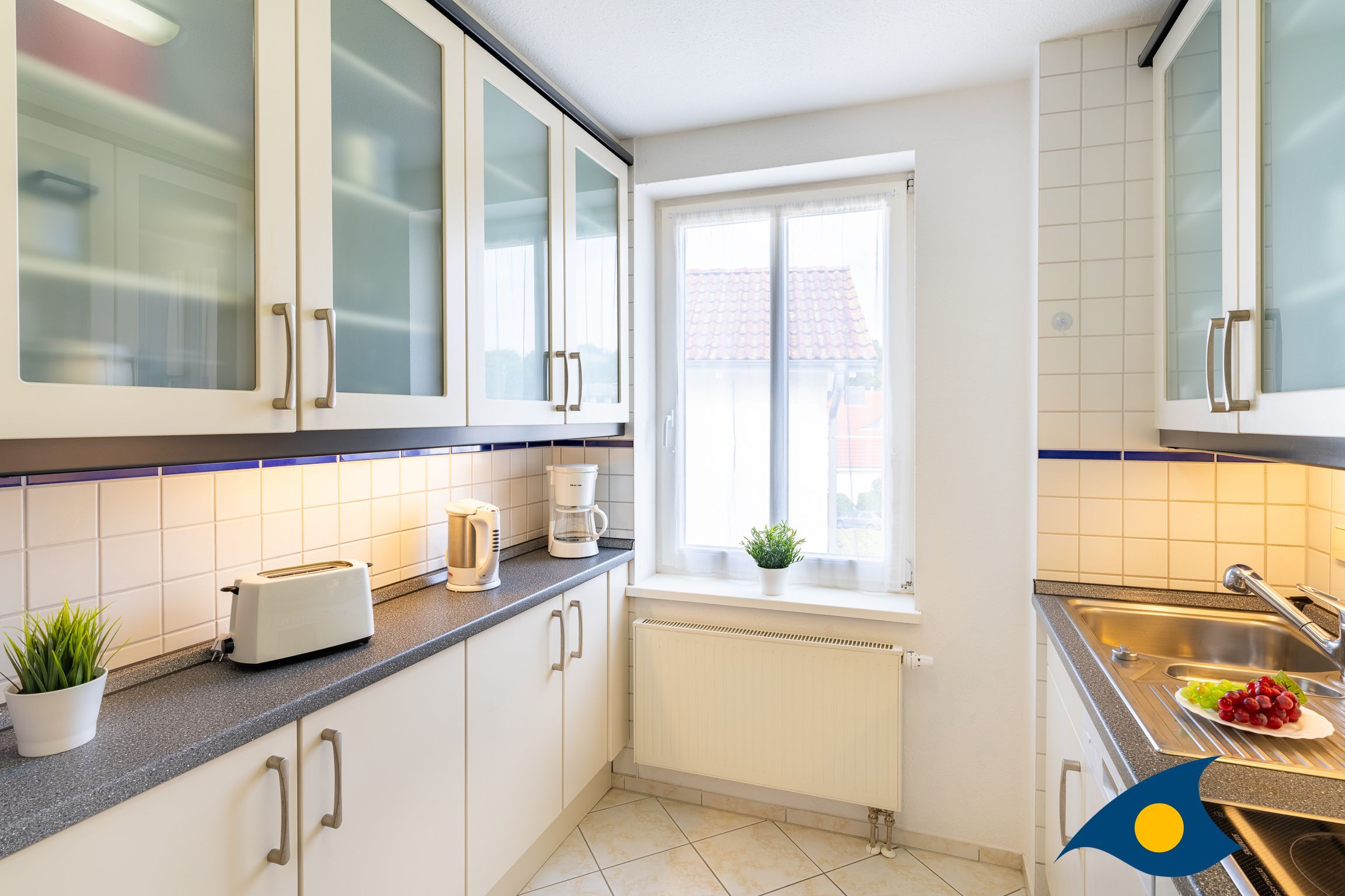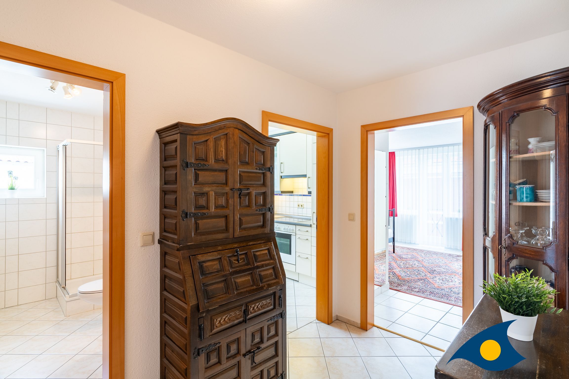 Im 2. Obergeschoss des Hauses befindet sich diese ca. 50 qm große Ferienwohnung, die Platz für bis zu 4 Personen bietet. Vom Wohnzimmer aus gelangen Sie auf den Sonnenbalkon, der mit einer Markise ausgestattet ist. Die separate Küche ist voll ausgestattet.
