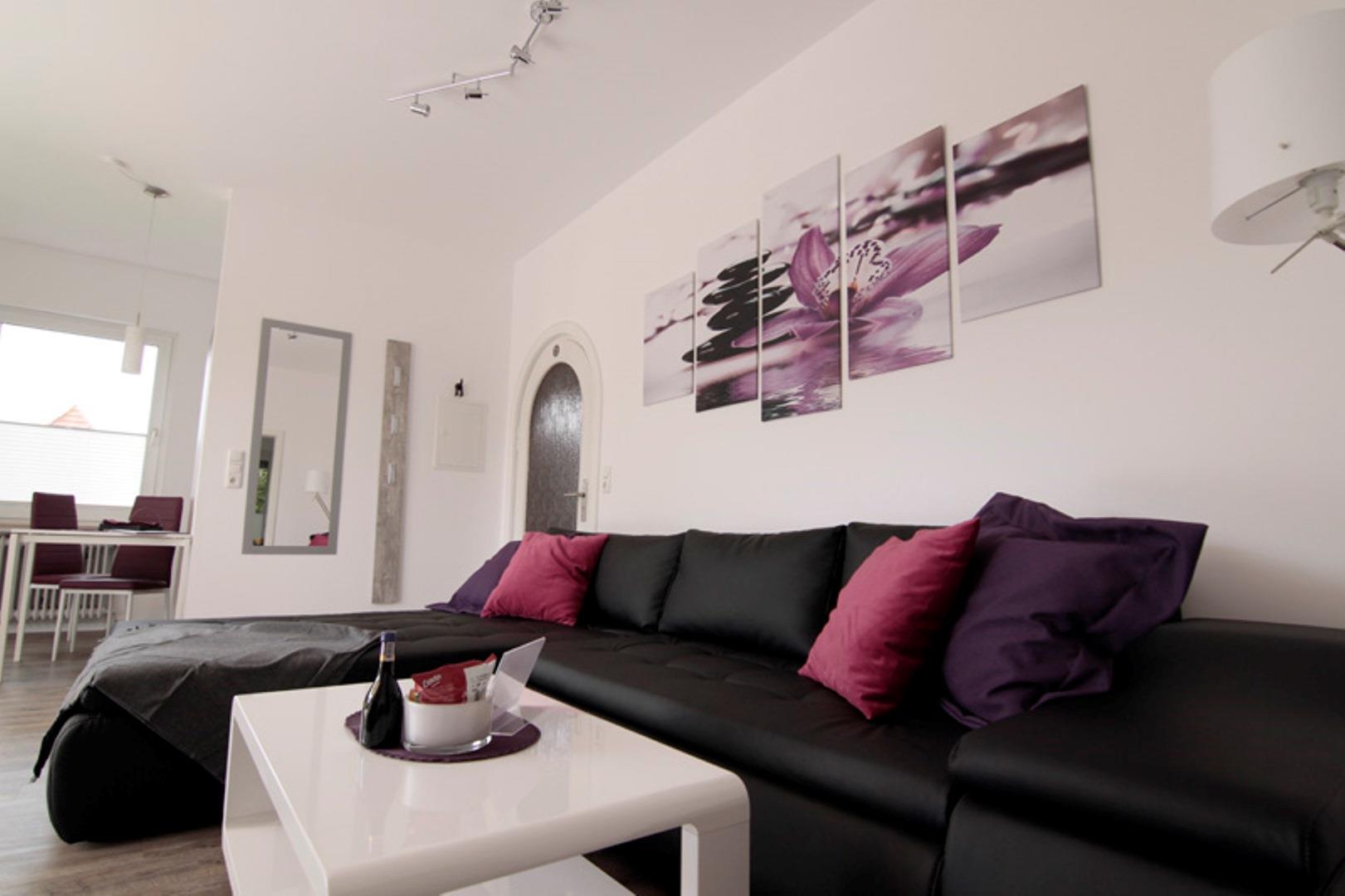 Auf 52 qm können Sie sich in unserer modern eingerichteten Wohnung wohlfühlen und entspannen. Die Wohnung ist wie folgt aufgeteilt: 1 Schlafzimmer ausgestattet mit einem Doppelbett 1,80 m x 2,00 m. Kopfkissen und Bettdecken sind allergikerfreundlich. Es kann ein Babybett (bitte bei der Buchung angeben) zugestellt werden. 1 kombiniertes Wohnzimmer mit TV und Musikanlage, angrenzend eine möblierte Terrasse. Integrierte Küche mit Essecke, Elektroherd, Backofen, Kühlschrank, Geschirrspüler, Kaffeemaschine und Kaffeekapselautomat , Toaster, Wasserkocher, Mikrowelle. Tageslichtbad mit Dusche/WC und Fön. Die mit kostenlosem WLAN ausgestattete Wohnung befindet sich im Erdgeschoss und wurde saniert und modern gestaltet.