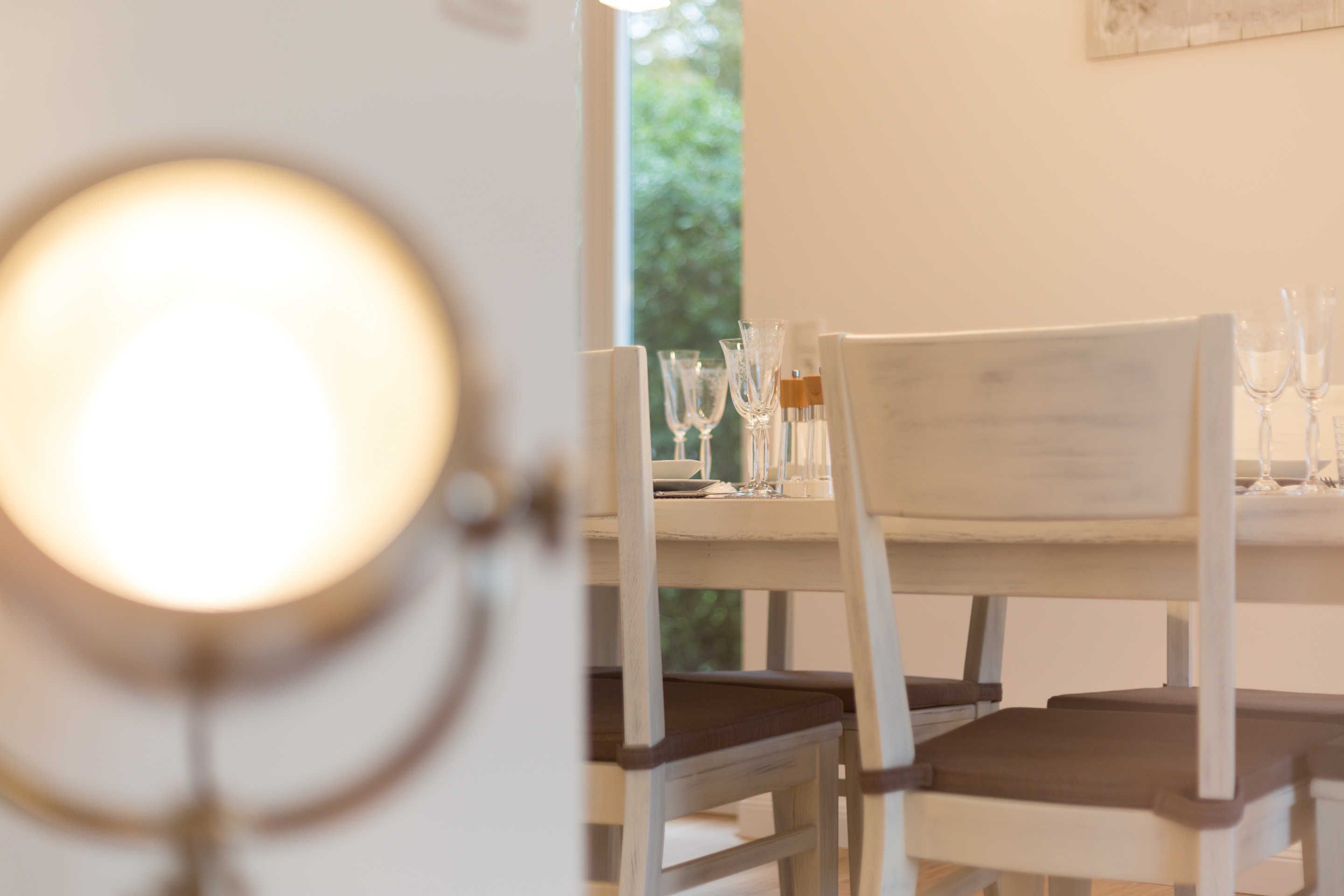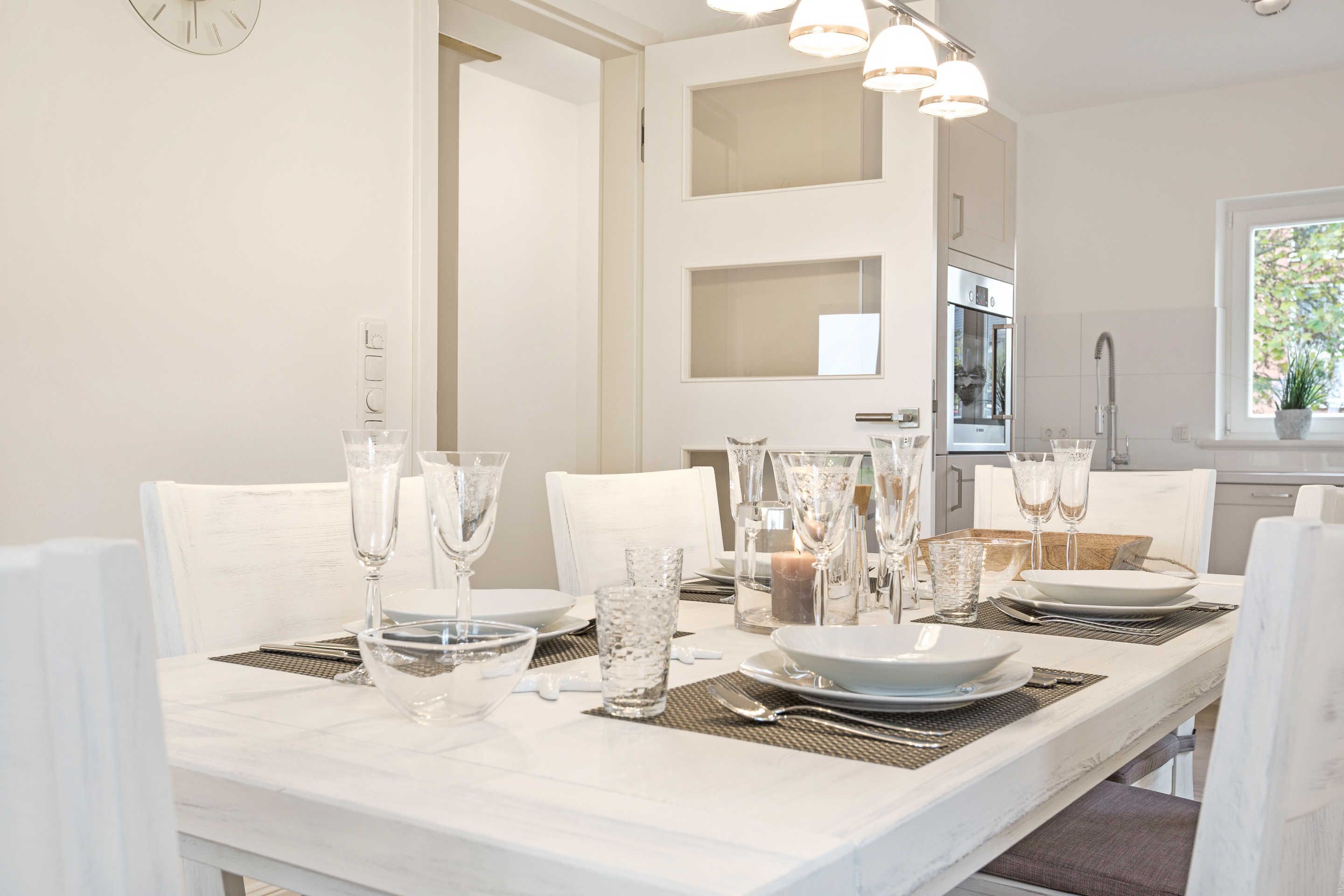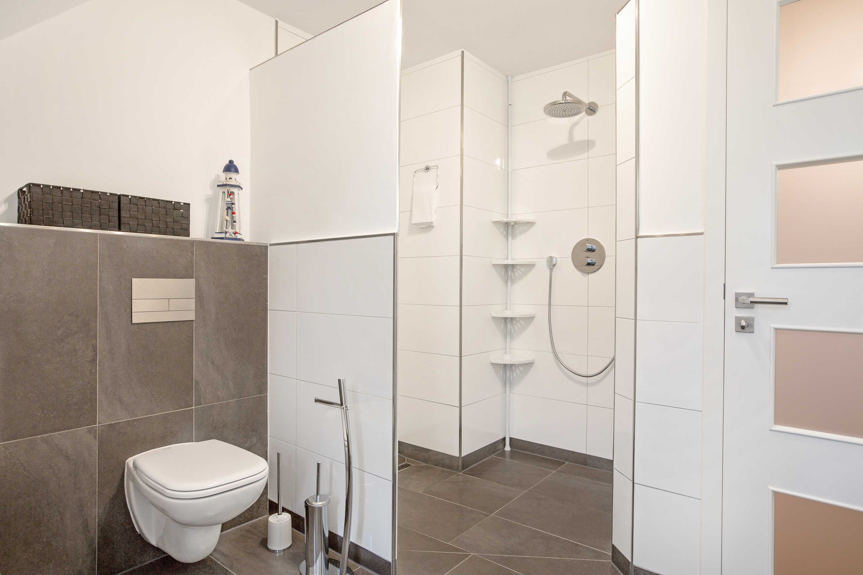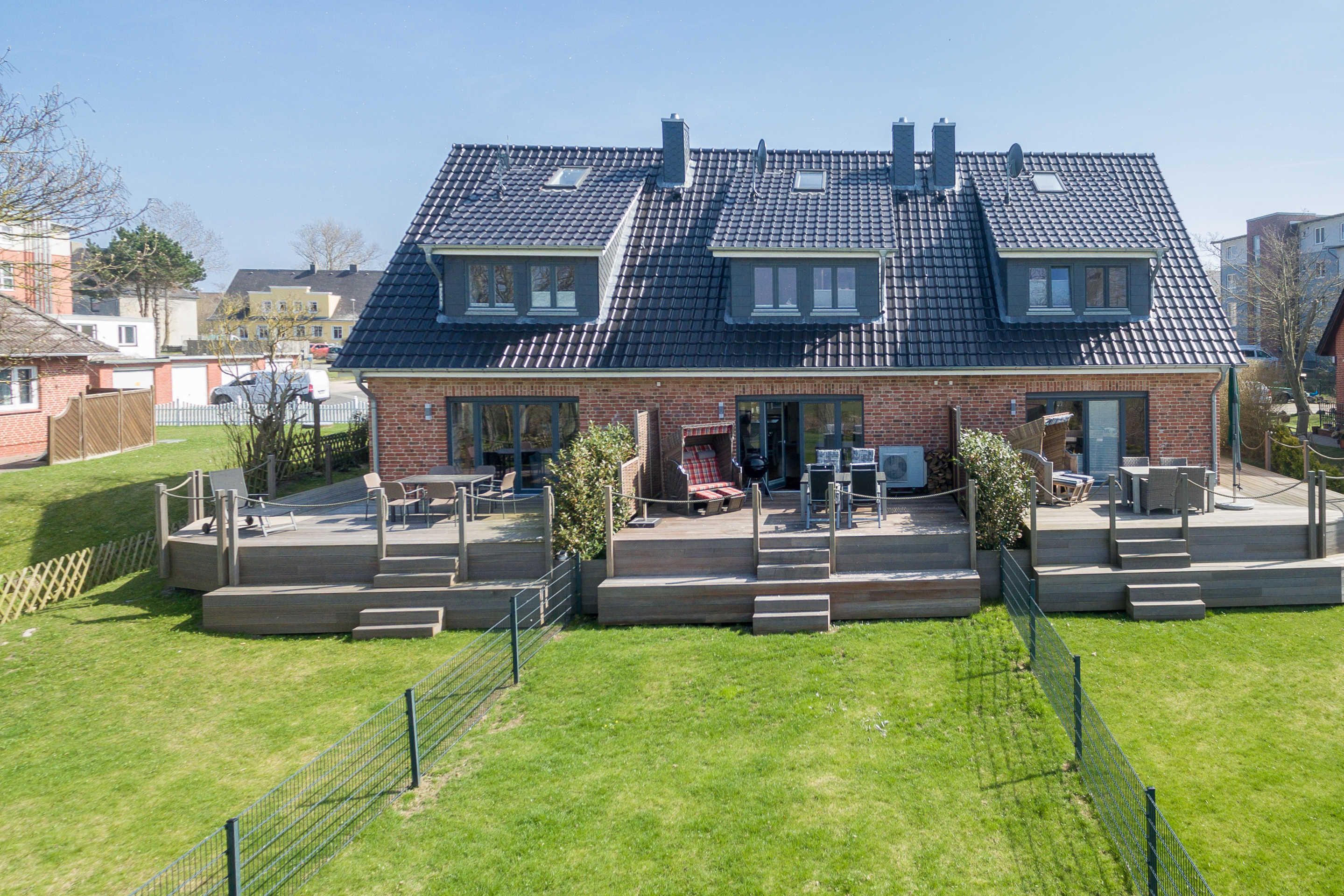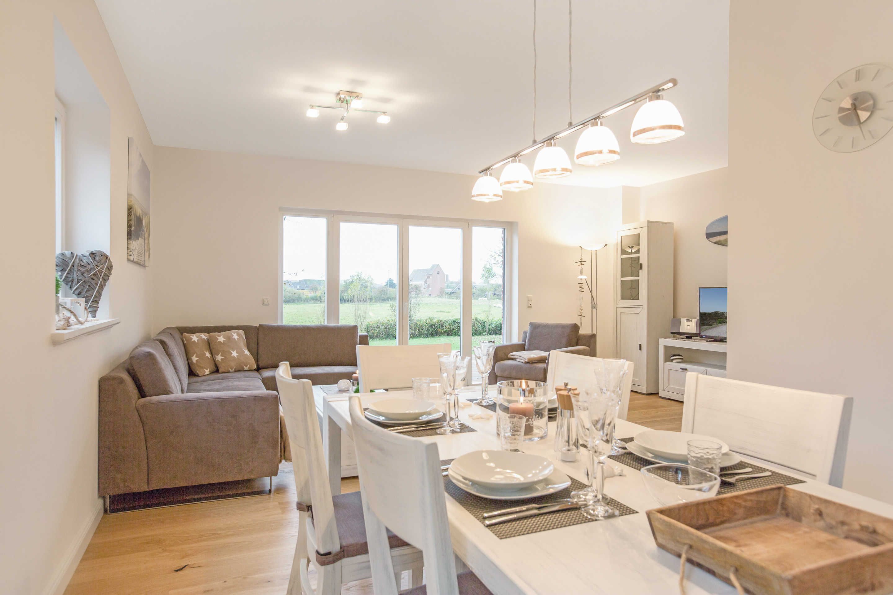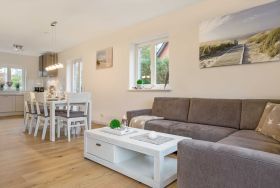 Treten Sie ein in das geräumige Hausteil, in dem sich rund 120 Quadratmeter über drei Ebenen verteilen. Bis zu sieben Personen können sich hier wohlfühlen. Im Erdgeschoss erstreckt sich ein großes Wohnzimmer mit einem behaglichen Sitzbereich und Kamin, SAT-TV und W-LAN. Neben dem Esstisch finden Sie eine Komplettküche, die unter anderem Kühlschrank und Geschirrspüler beinhaltet. Außer einer klassischen Kaffeemaschine steht Ihnen hier auch eine Senseo-Kaffeemaschine zur Verfügung. Ein aparter Holzfußboden sorgt nicht nur für ansprechendes Ambiente, sondern dank einer Fußbodenheizung wie auch in den übrigen Räumen für warme Füße. Und dank der automatischen Rolläden können Sie den Einfall des Tageslichts ganz individuell begrenzen.
