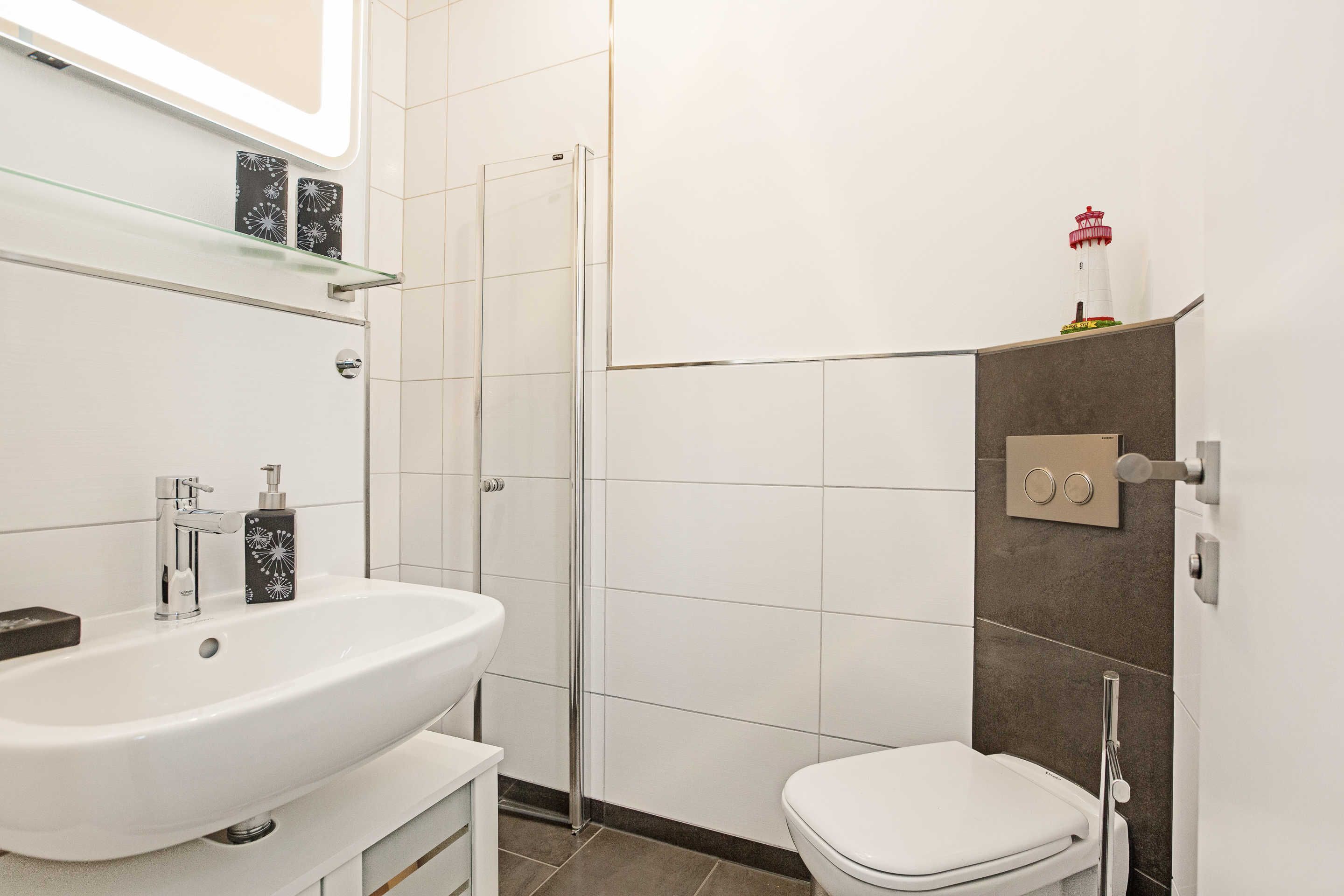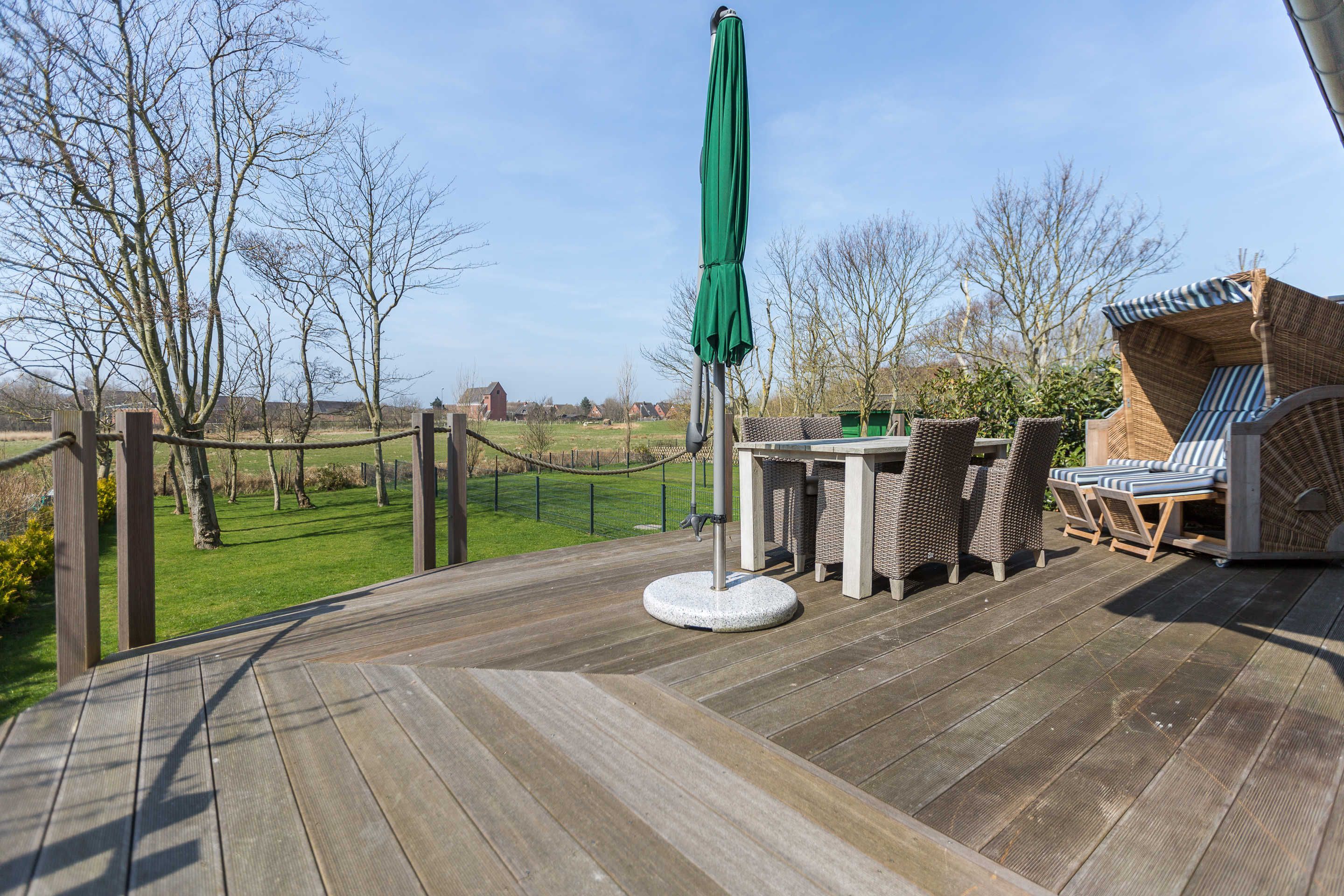 Direkt aus dem Wohnzimmer gelangen Sie auf die große Südterrasse, auf der sie sich sonnen können und direkt auf eine weite Fenne mit Schafen „Fenne“ ist der friesische Begriff für „Weideland“ sowie auf die kleine Lister Kirche blicken. Zudem steht Ihnen ein Gartenbereich zur Verfügung. Neben dem Wohnzimmer finden Sie im Erdgeschoss zudem ein WC mit Duschbereich.