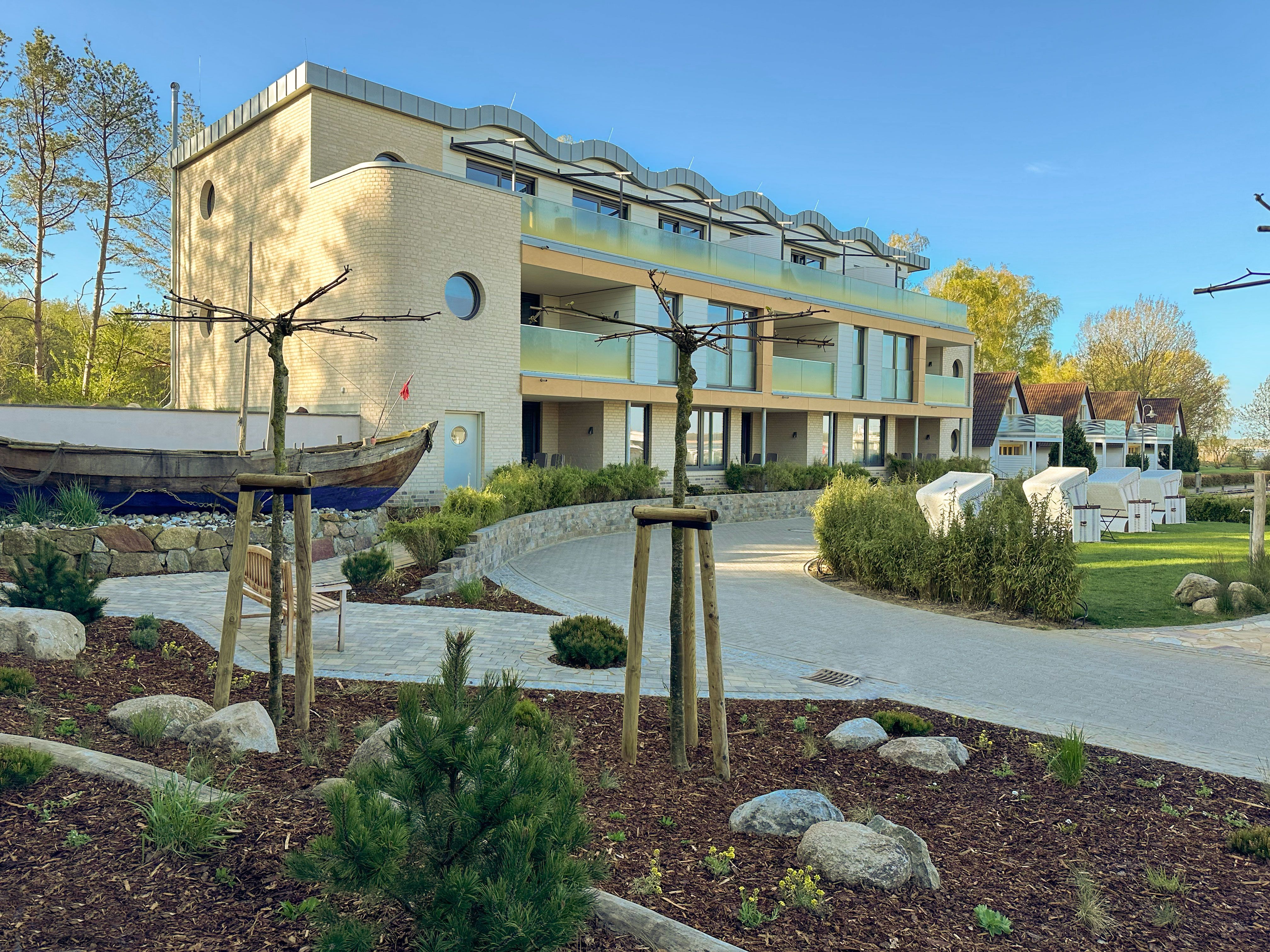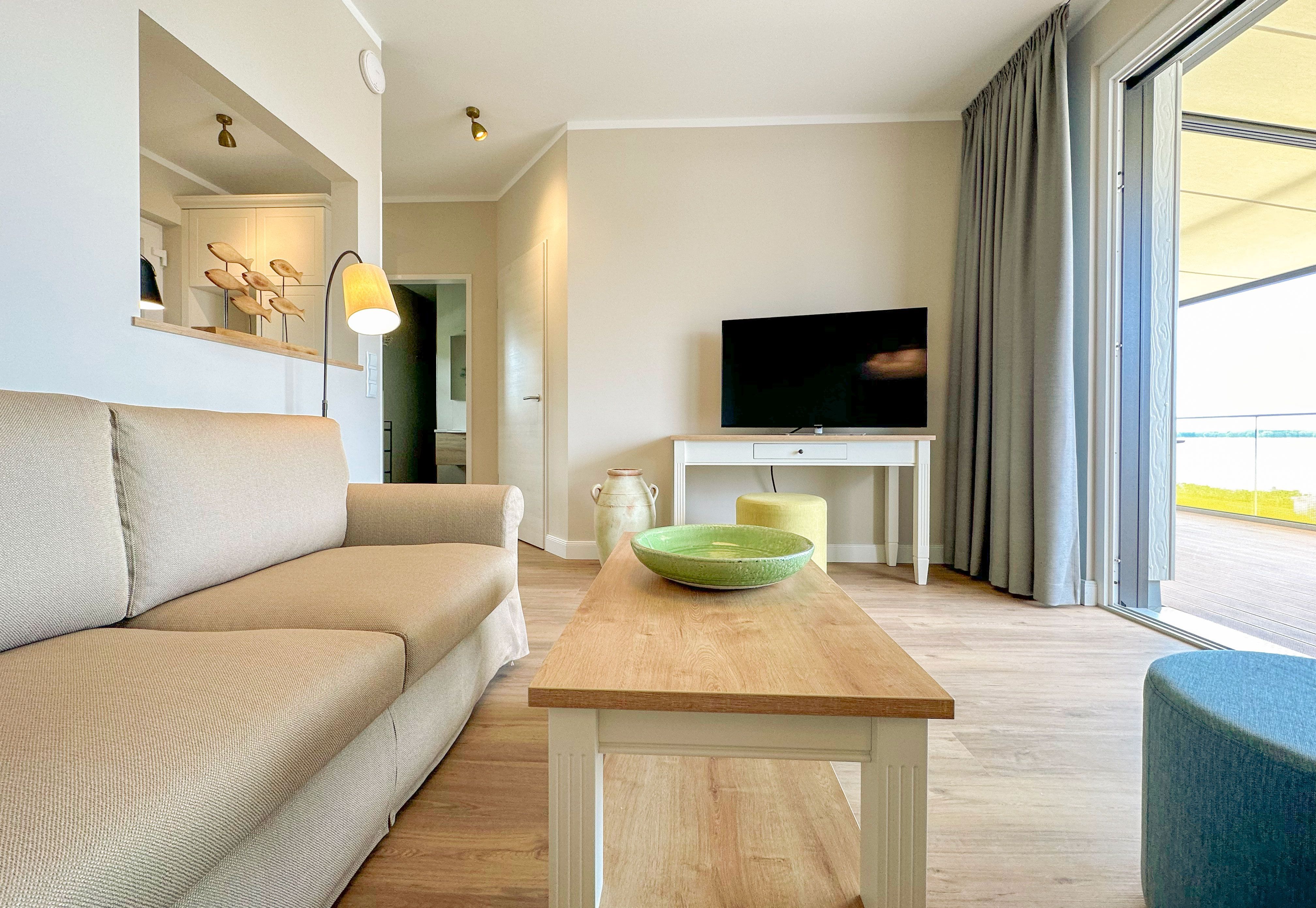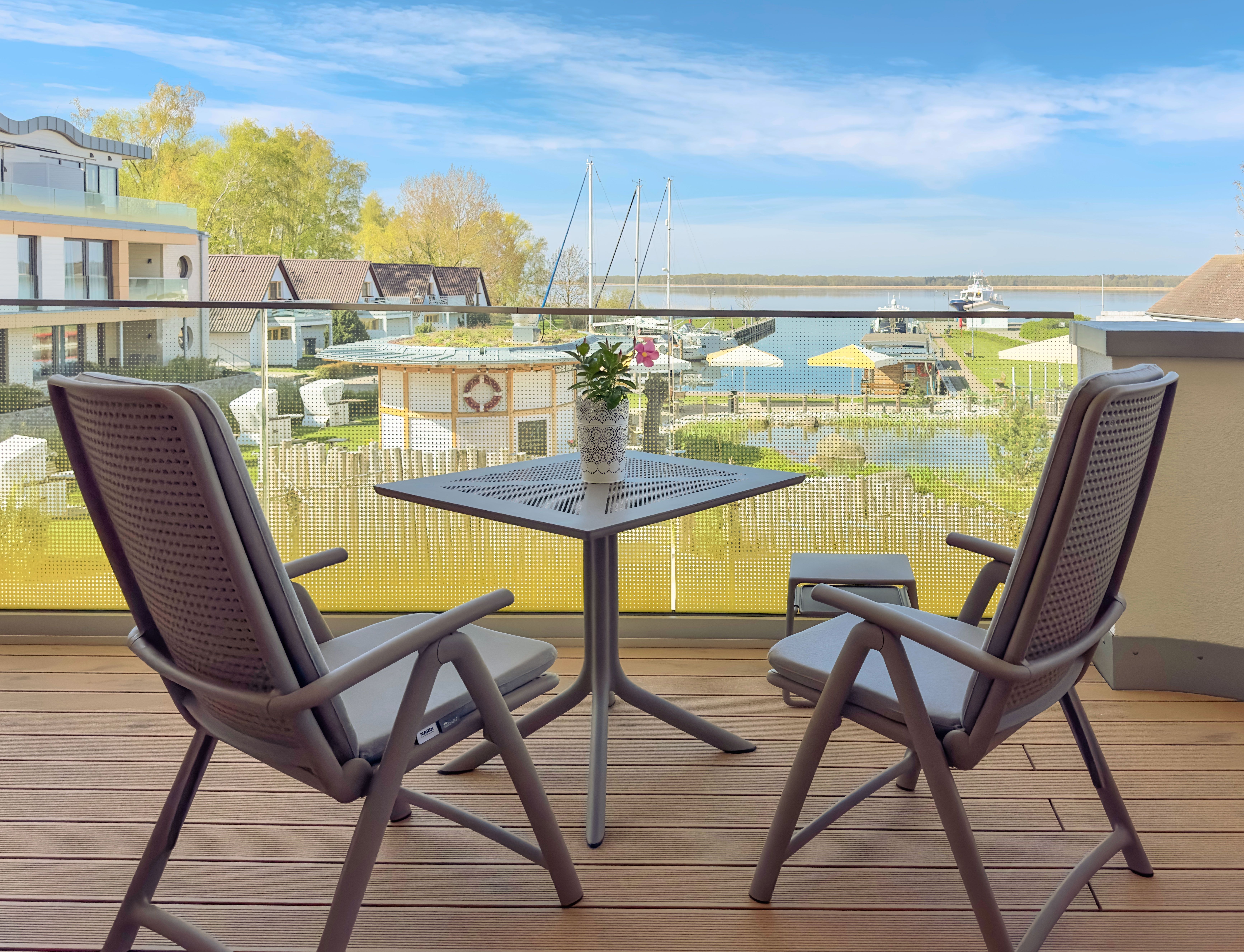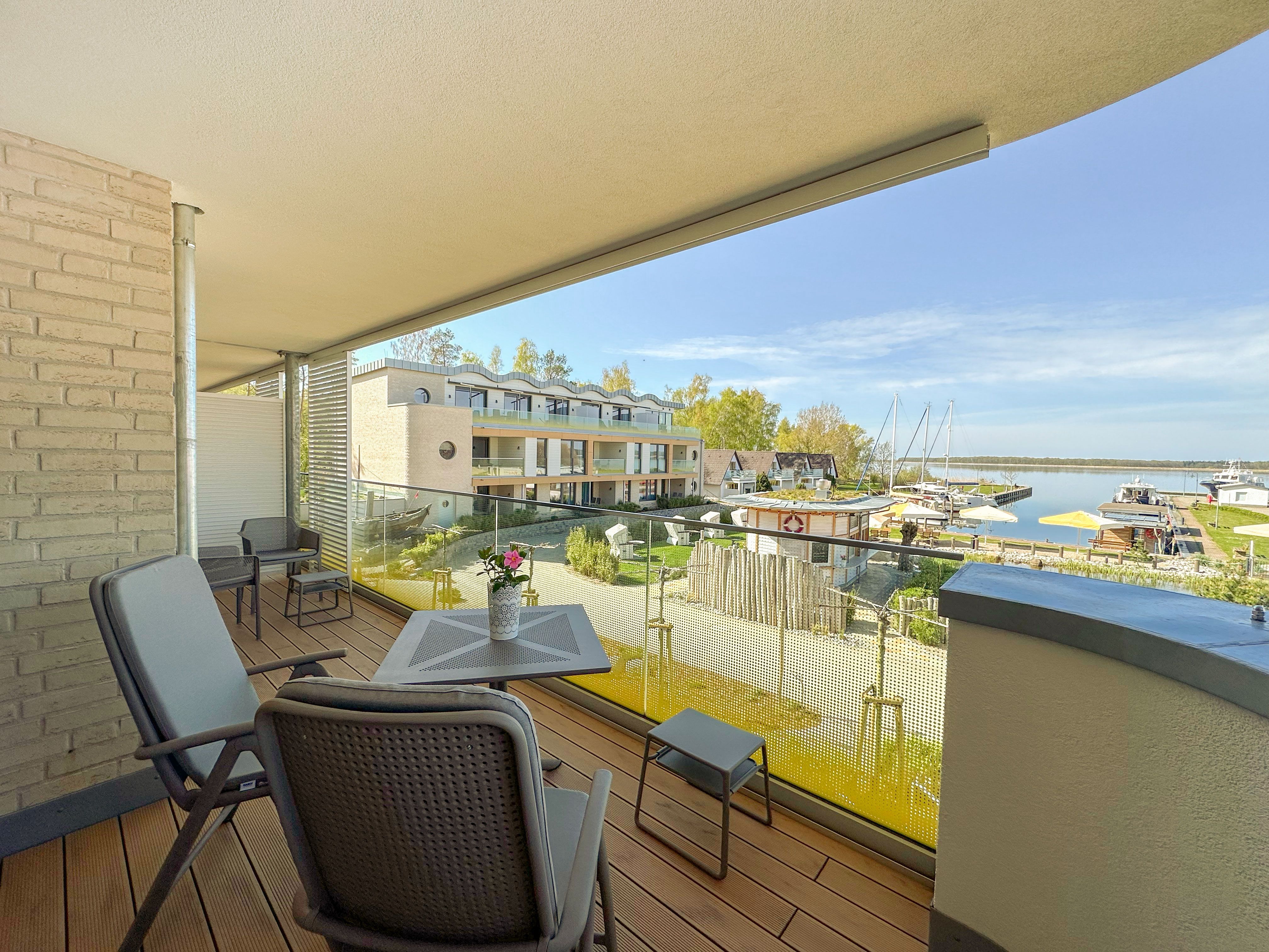 65m² Suite im OG für 2 Personen. Schlafzimmer mit Doppel-Boxspringbett (180x200). 20 m² Balkon mit einmaligem Blick auf Wasser und Hafen. Nichtraucher-Suite. Parkplatzund WLAN sind inklusive. Turmsauna mit Dachterrasse, Fitnessraum und Frühstück sind vor Ort zu buchbar. Wäschepaket und Endreinigung einmalig 139,- €.