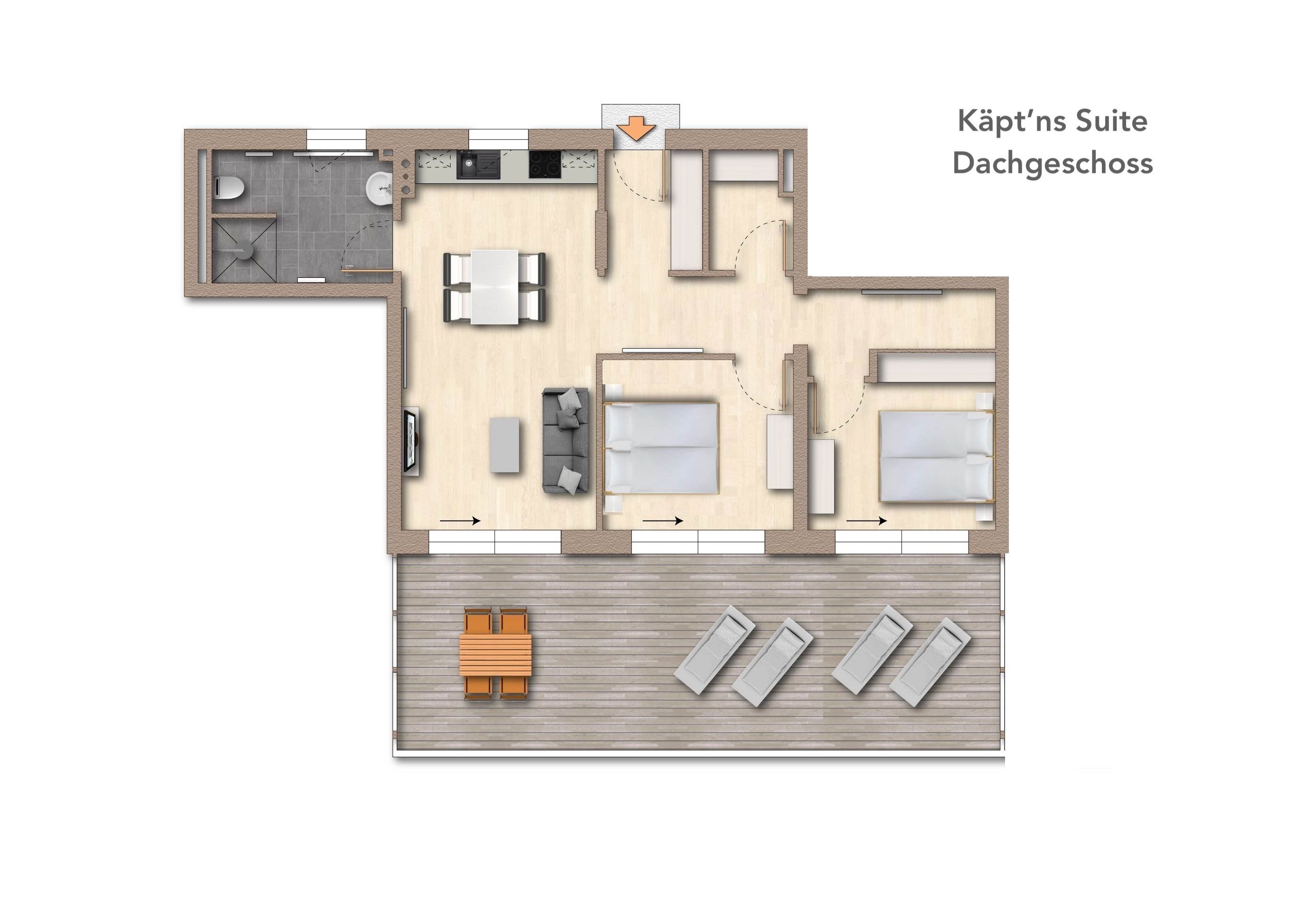 Die Kadetten Suite bietet viel Platz für einen Urlaub mit großer Familie oder guten Freunden. Die meiste Zeit werden Sie wahrscheinlich auf dem Balkon verbringen beim Ausblick auf das Treiben im idyllischen Hafen. Genießen Sie die Natur pur.