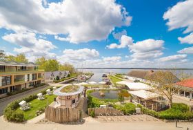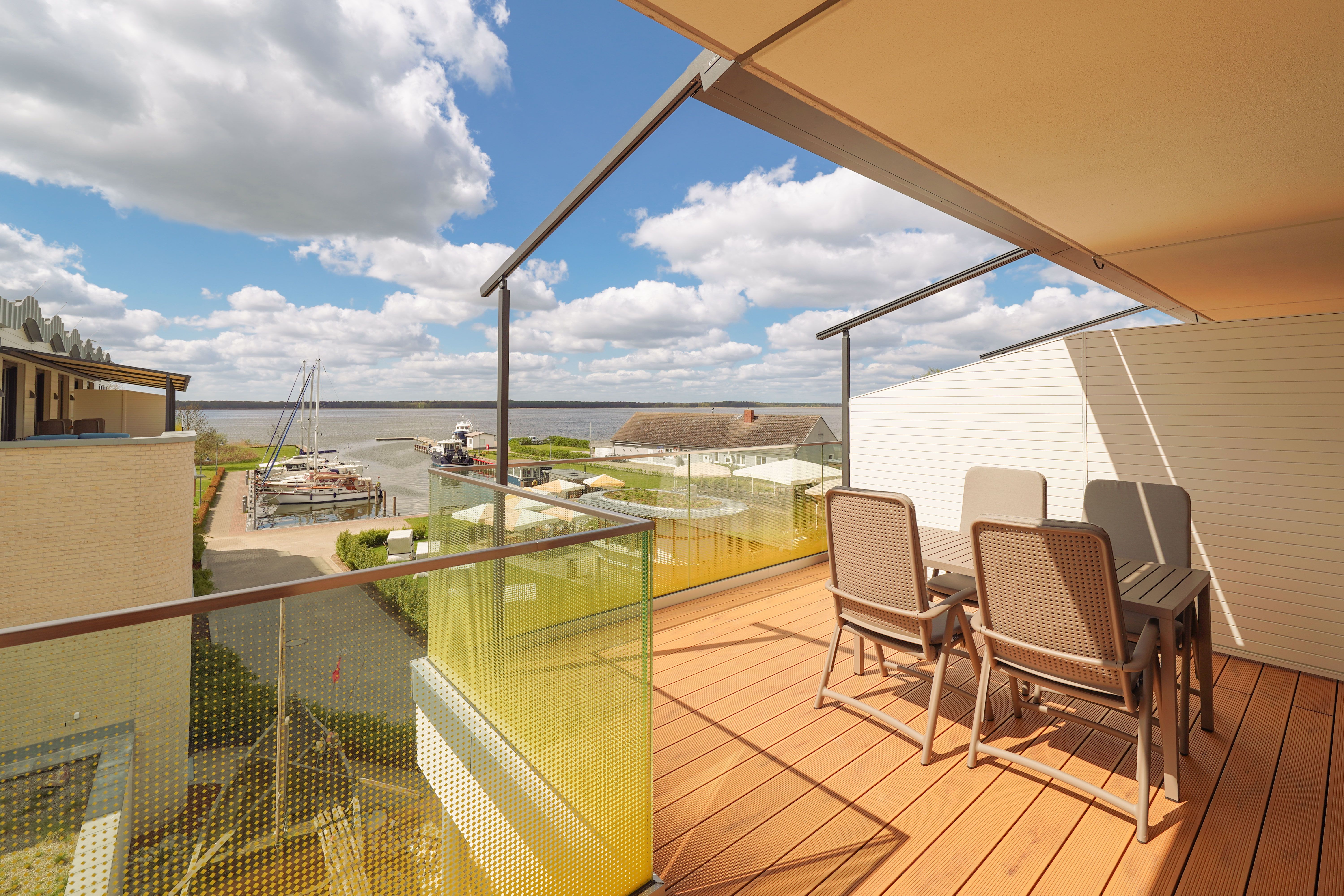 Die Peene Suite im DG lässt Ihren Blick von der Terrasse weit über das Wasser in Richtung Sonnenuntergang schweifen. Hier werden das Wohlfühlen und Entspannen leicht gemacht.
