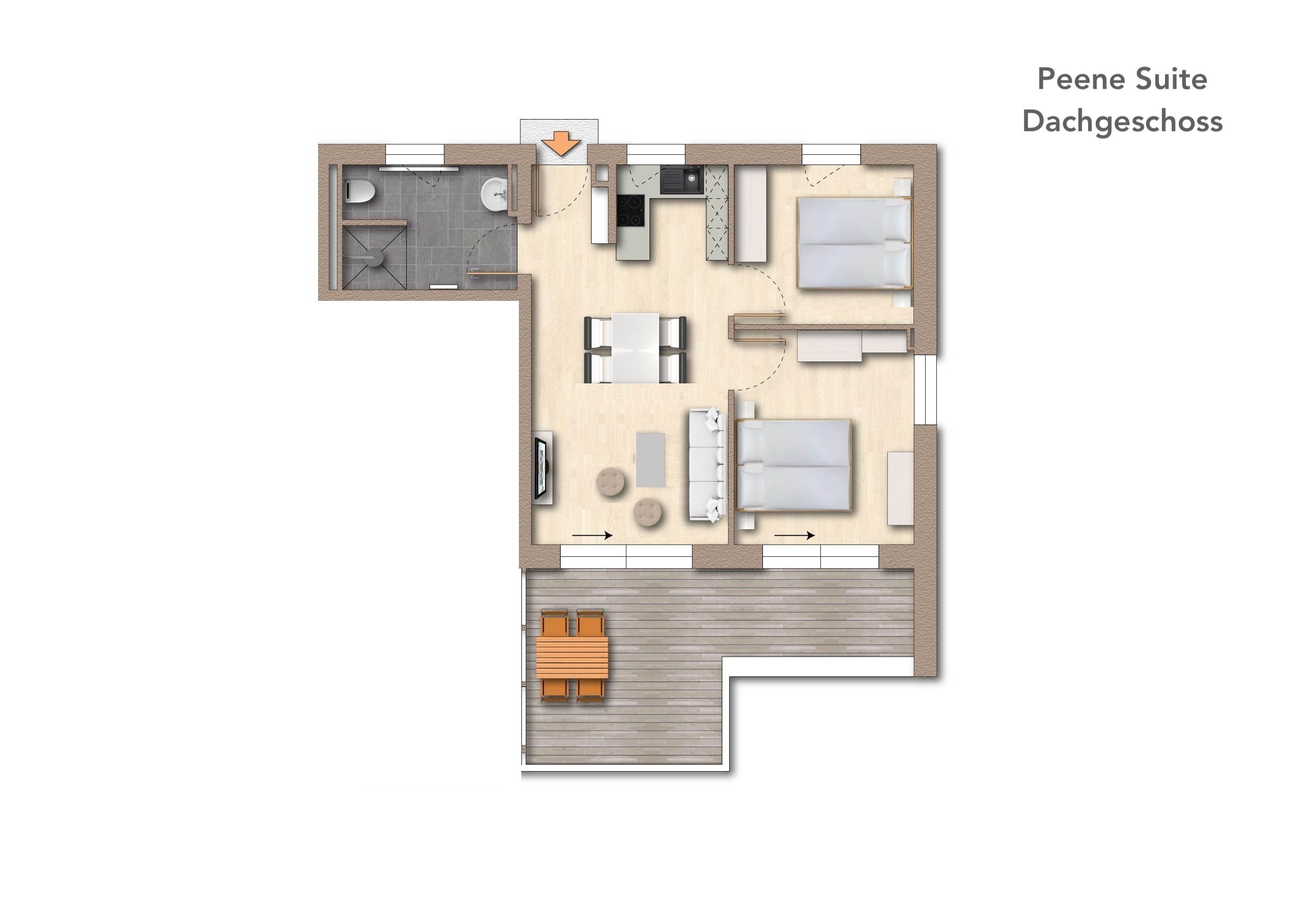65 m² Suite im DG für bis zu 4 Personen. 2 Schlafzimmer mit Doppel-Boxspringbetten (180x200). 20 m² Dachterrasse mit einmaligem Blick auf Wasser und Hafen. Nichtraucher-Suite. Parkplatz und WLAN sind inklusive. Turmsauna mit Dachterrasse, Fitnessraum und Frühstück sind vor Ort zu buchbar. Wäschepaket und Endreinigung einmalig 139,- €