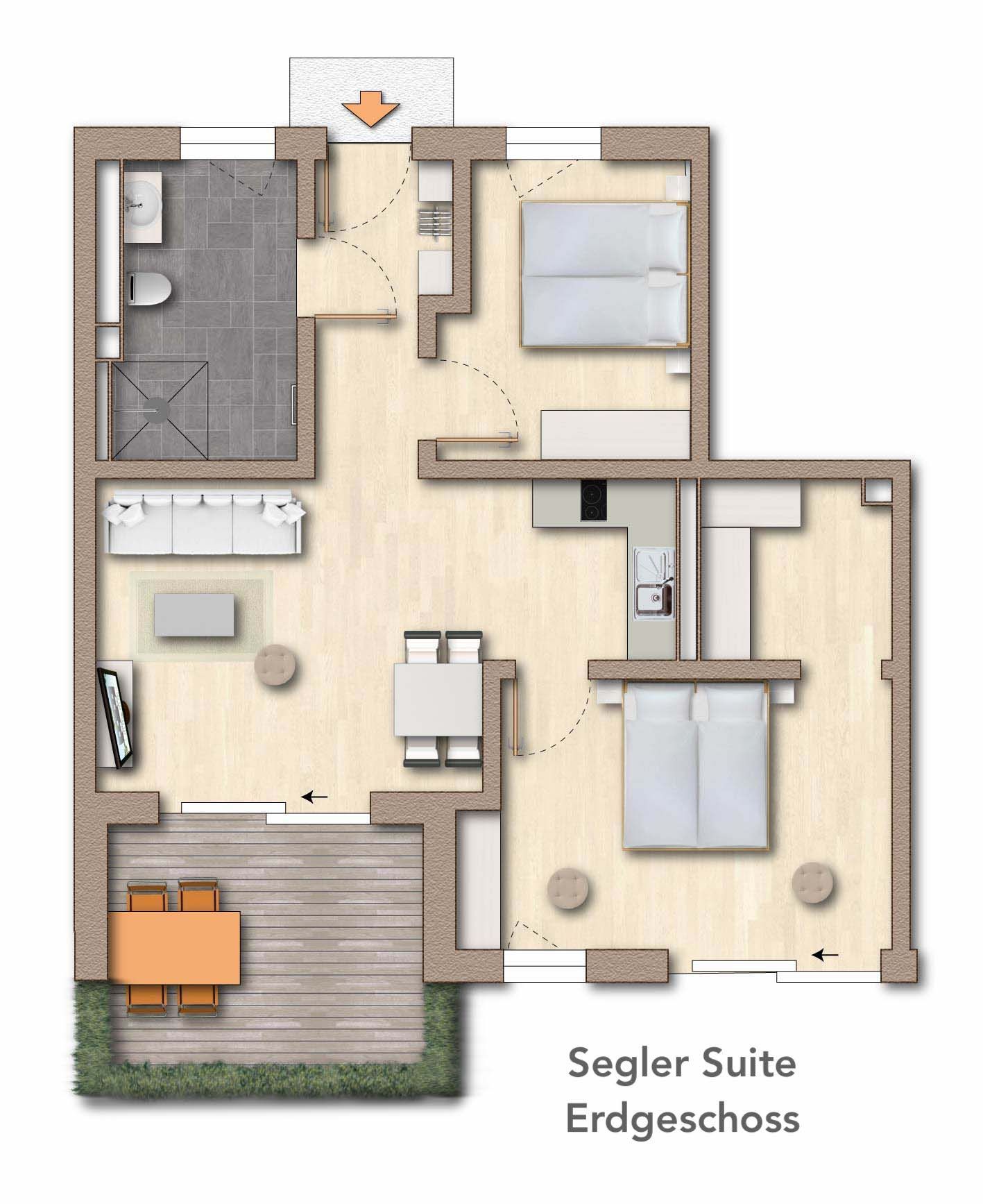 Die Segler Suite ist barrierefrei, behindertenfreundlich und bietet reichlich Platz. Genießen Sie die Seeluft auf der Veranda und lassen Sie Geist und Seele baumeln.