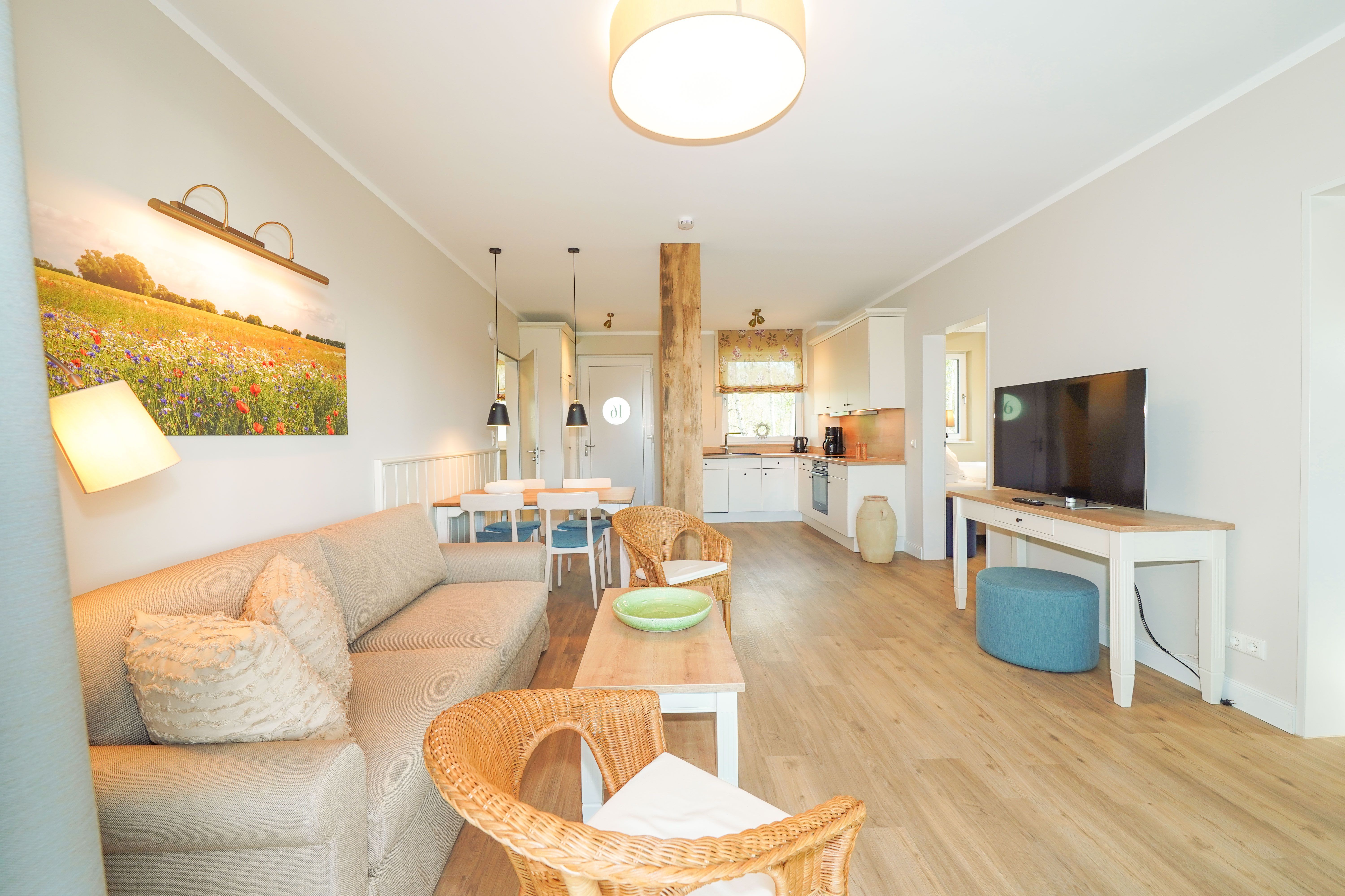 75m² Suite im EG, barrierefrei, bis zu 4 Personen. Schlafzimmer mit Doppel-Boxspringbett (180x200), 15 m² Veranda mit einmaligem Blick auf den Hafen. Nichtraucher-Suite. Hund möglich: 15€/Tag. Parkplatzund WLAN sind inklusive.Dachsauna mit Terrasse, Fitnessraum und Frühstück sind vor Ort zu buchbar. Wäschepaket und Endreinigung einmalig 139,- €.