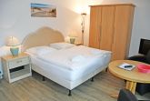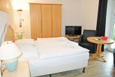 kombinierter Wohn-/Schlafraum mit Doppelbett (180 x 200 cm), Nachttischen, großem Kleiderschrank, Tisch mit 2 Ledersesseln, Anrichte mit TV, Kofferablage