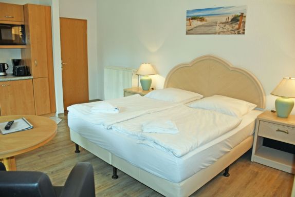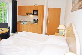 Unsere ruhig gelegenen, hellen und lichtdurchfluteten 1-Raum-Ferienwohnungen mit Balkon oder Terrasse sind wie folgt ausgestattet: