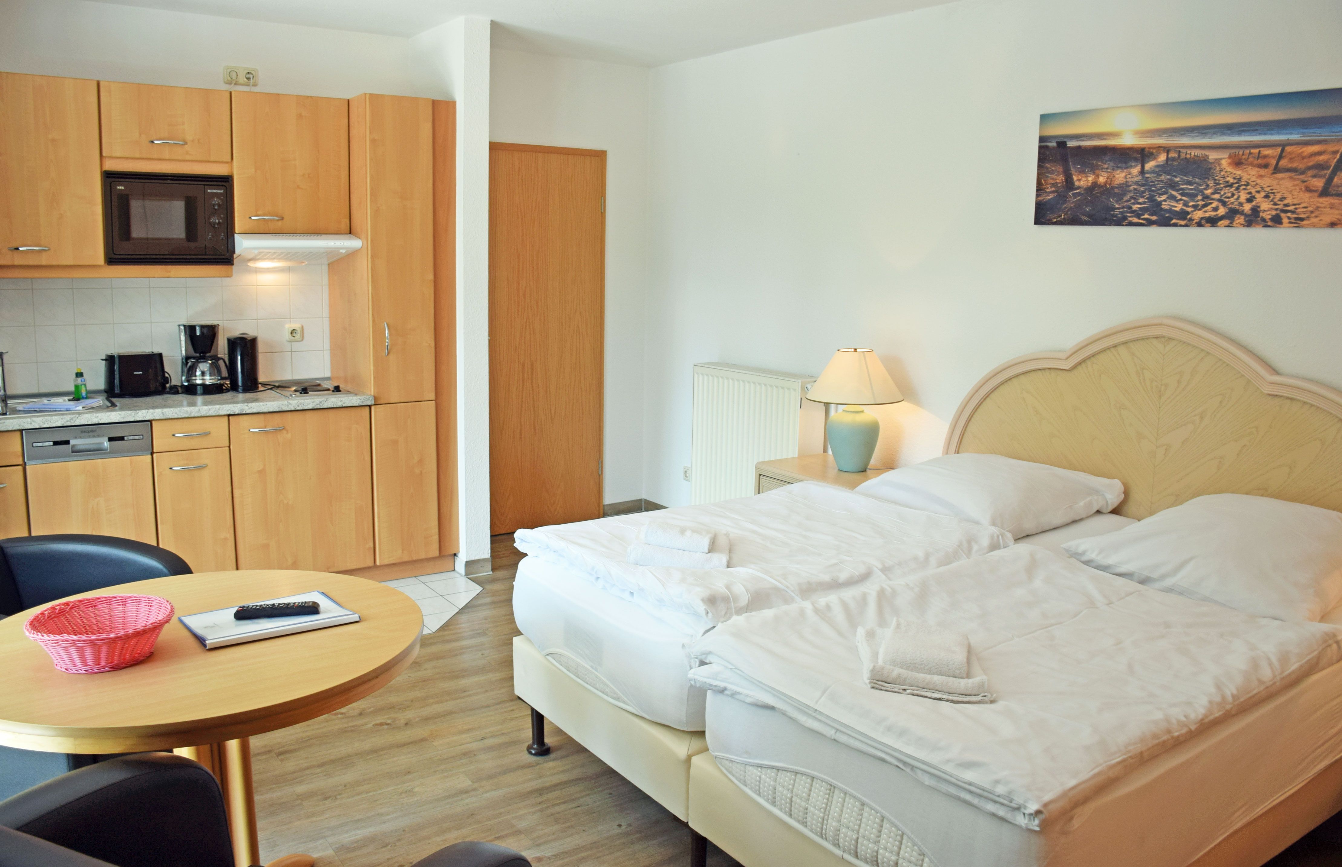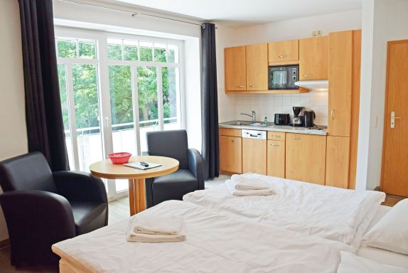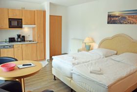 Unsere ruhig gelegenen, hellen und lichtdurchfluteten 1-Raum-Ferienwohnungen mit Balkon oder Terrasse sind wie folgt ausgestattet: