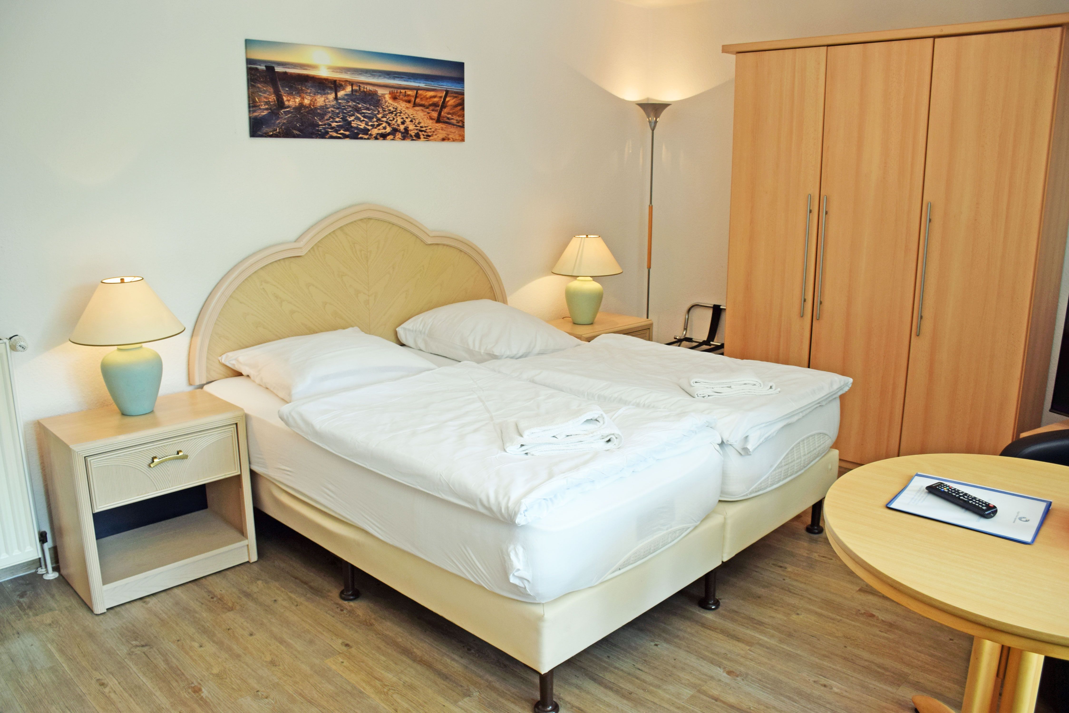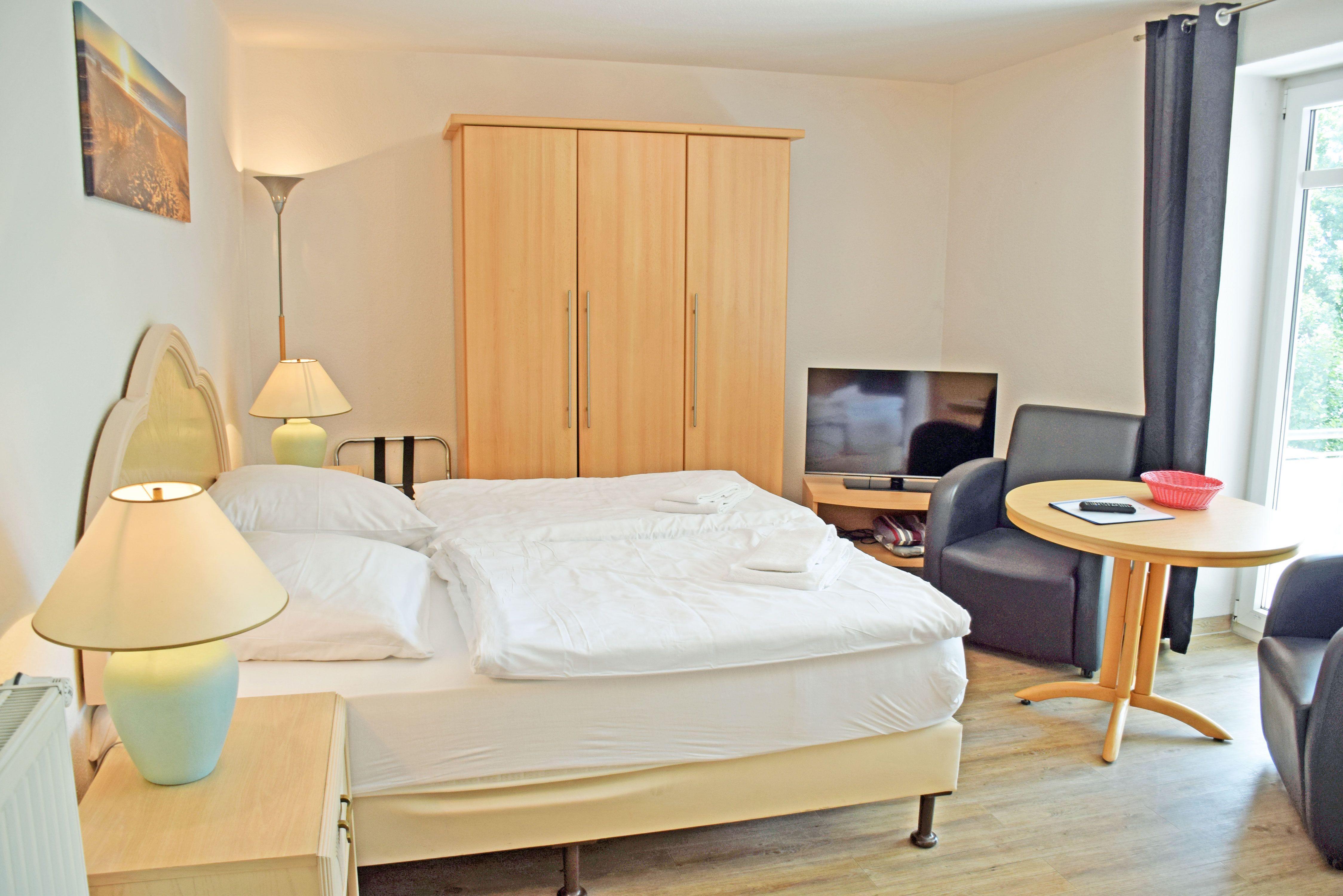 kombinierter Wohn-/Schlafraum mit Doppelbett (180 x 200 cm), Nachttischen, großem Kleiderschrank, Tisch mit 2 Ledersesseln, Anrichte mit TV, Kofferablage
